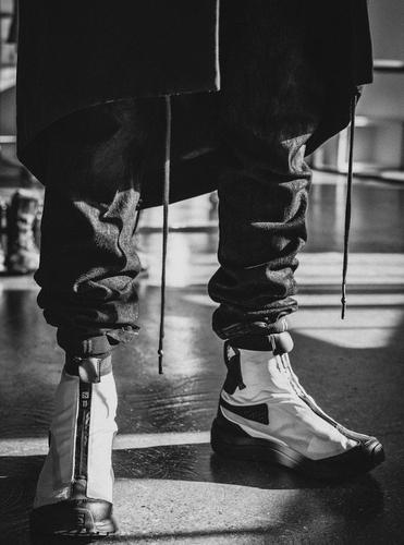 Cold dye and object dying techniques are key elements of the 11 by BBS collections which have been inherited through its DNA. These techniques have most commonly been used by artisanal brands but also by tech wear innovators such as Stone Island. These dying techniques and the hand touch is what differentiates this type of technical shoe from others; merging artisanal and technical elements, creating both a visually captivating and functional piece which looks alive and has lived, rather than the clinical look of technical footwear. The following AW17 season the BAMBA series, taking its name from the signature sneaker of the Boris Bidjan Saberi line was introduced; in particular the model which would become the collaborations most successful and a staple within the collections, The BAMBA 2 High. With its sleek upper crafted from a mix of technical materials, central waterproof zip revealing a branded tongue sat upon an EVA moulded sole and reflective branded detailing became an instant classic, merging technical construction with a hint of Streetwear sensibilities and an artisanal touch.