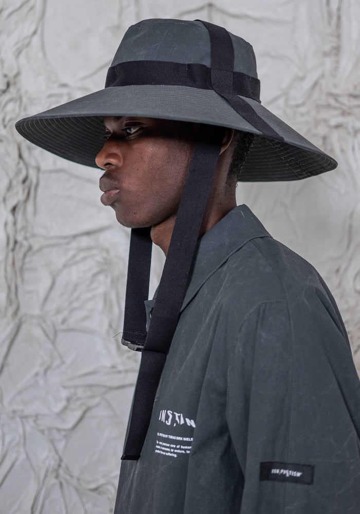 In INSTINCTS the signature wide brim JUNO Snail Hunter Hat returns in an acid jacquard and faded black wash. The LOEZ is a minimalist technical raincoat, with clean lines and side slits on each side with branded print on the chest, coming in both a faded black and acid jacquard whose effect is like that of marble. It would not be a Tobias Birk Nielsen collection without a technical vest in the offering. The DAIICHI is a mix material vest with large upper chest pockets and two pouches on each panel, and featuring a magnetic clip closure. Reminiscent of the armour of a Trojan soldier or layers of survival wear of an astronaut.