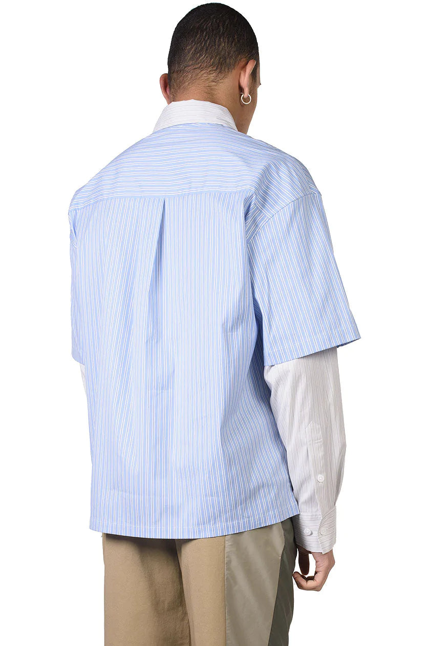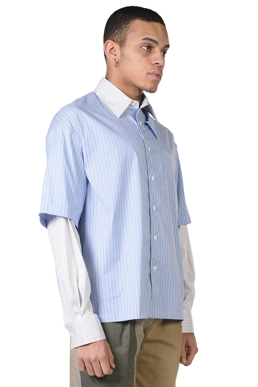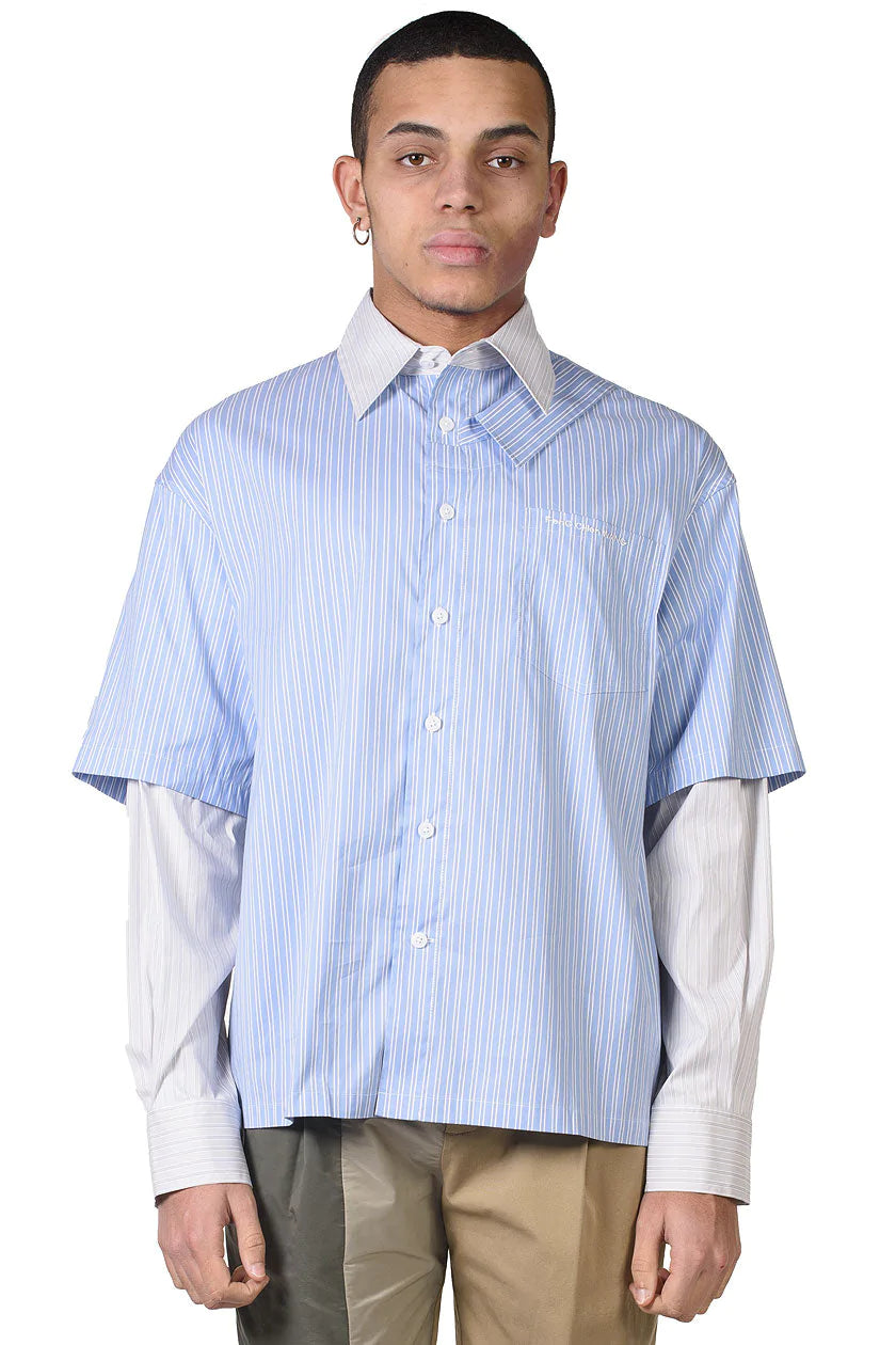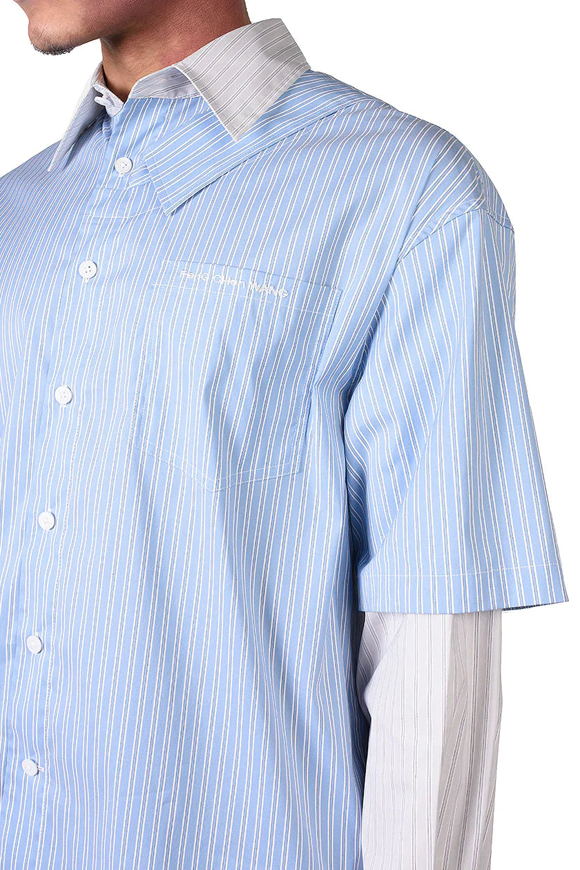 Cotton blend blue and grey stripe classic two in one shirt. Misplaced collar to chest. Shell button closure to front and cuff. Embroidered logo to chest.