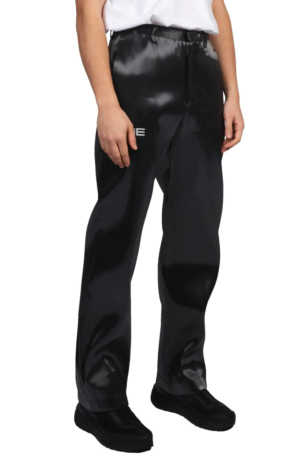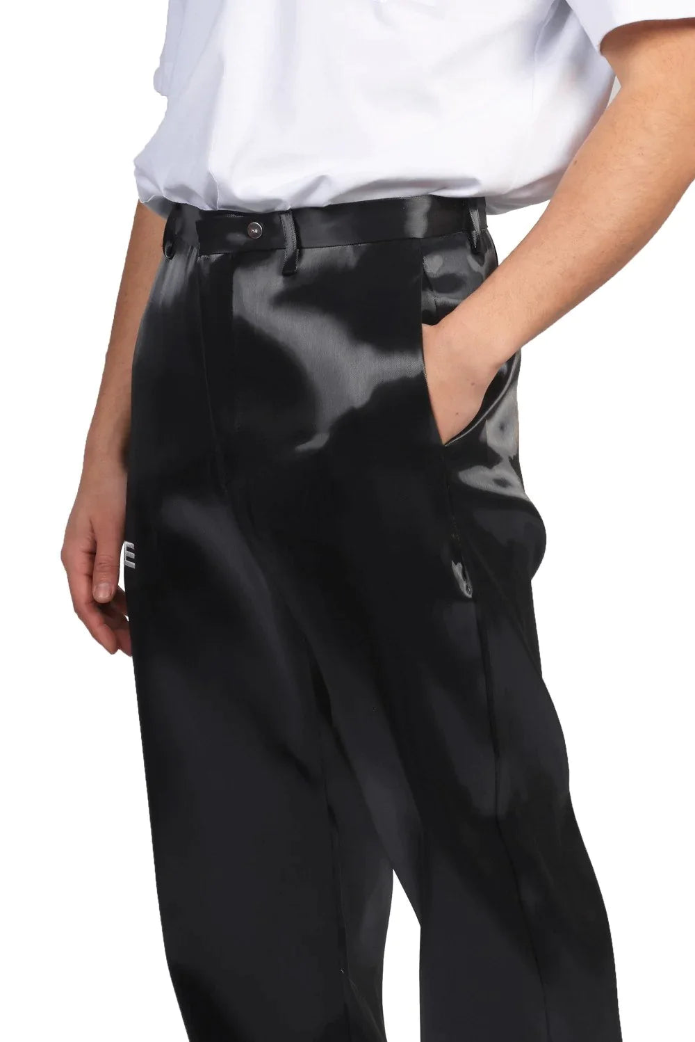 Straight fit, mid rise. Metallic material finish. Grey 'HE' embroidery on the top left. Four-pocket styling. Single button closure with zip fly