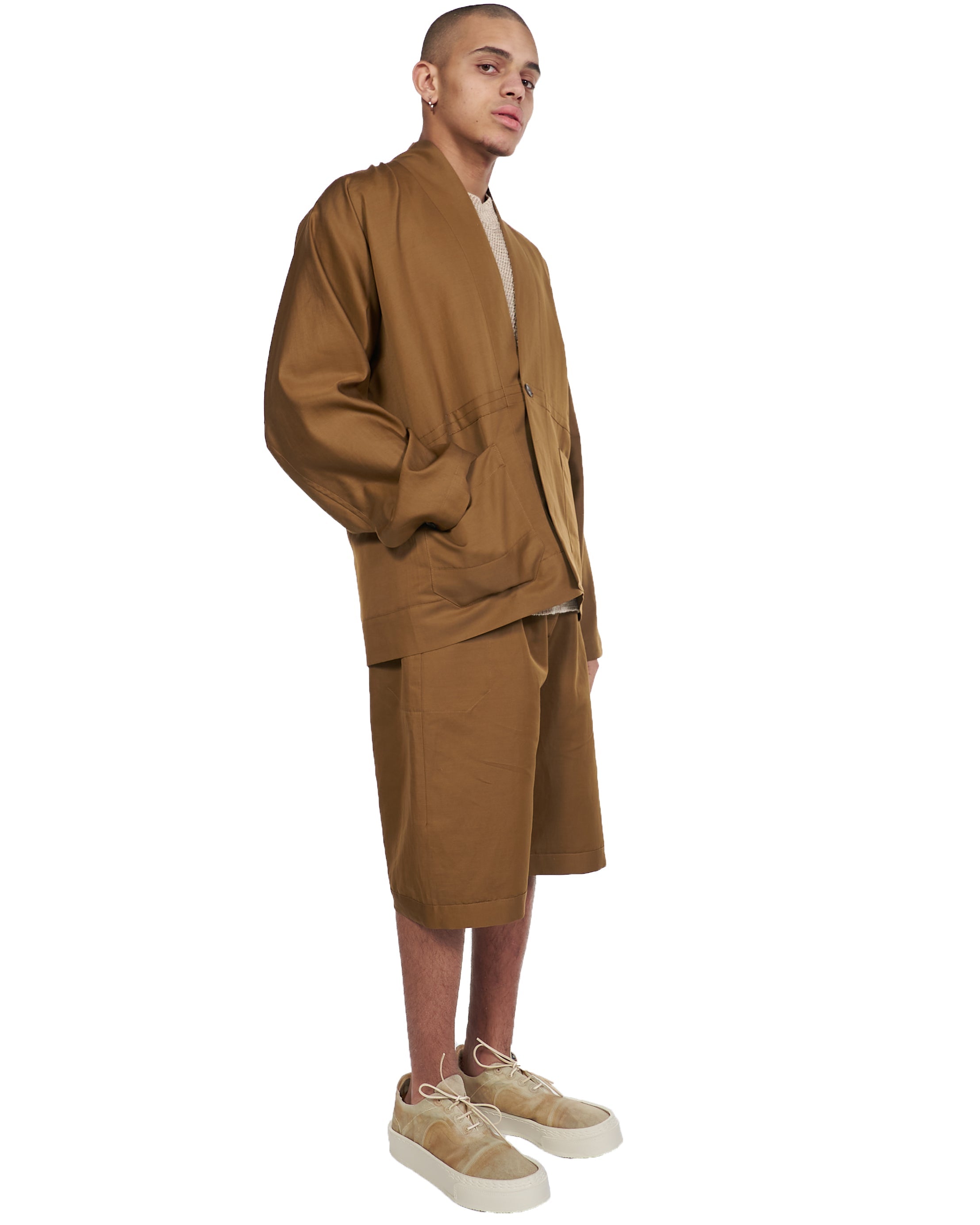 Long sleeve rami-cotton blend jacket in amber. Ainu Collar. Single-button closure at front. Patch pockets at waist. Single-button surgeons cuffs. Tonal hardware.