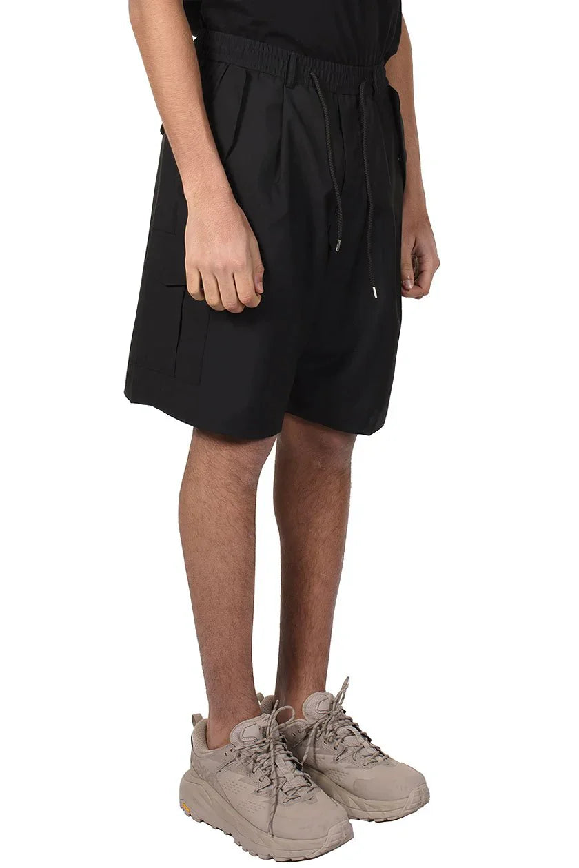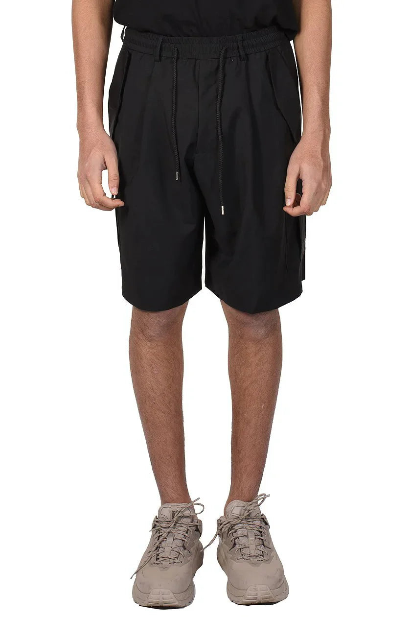 Mid-rise. Drawstring elastic waist. Pleated front. Side pockets.