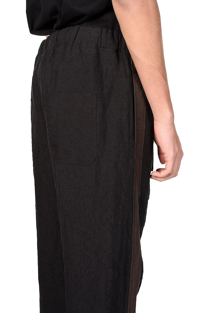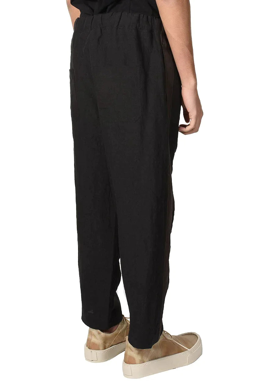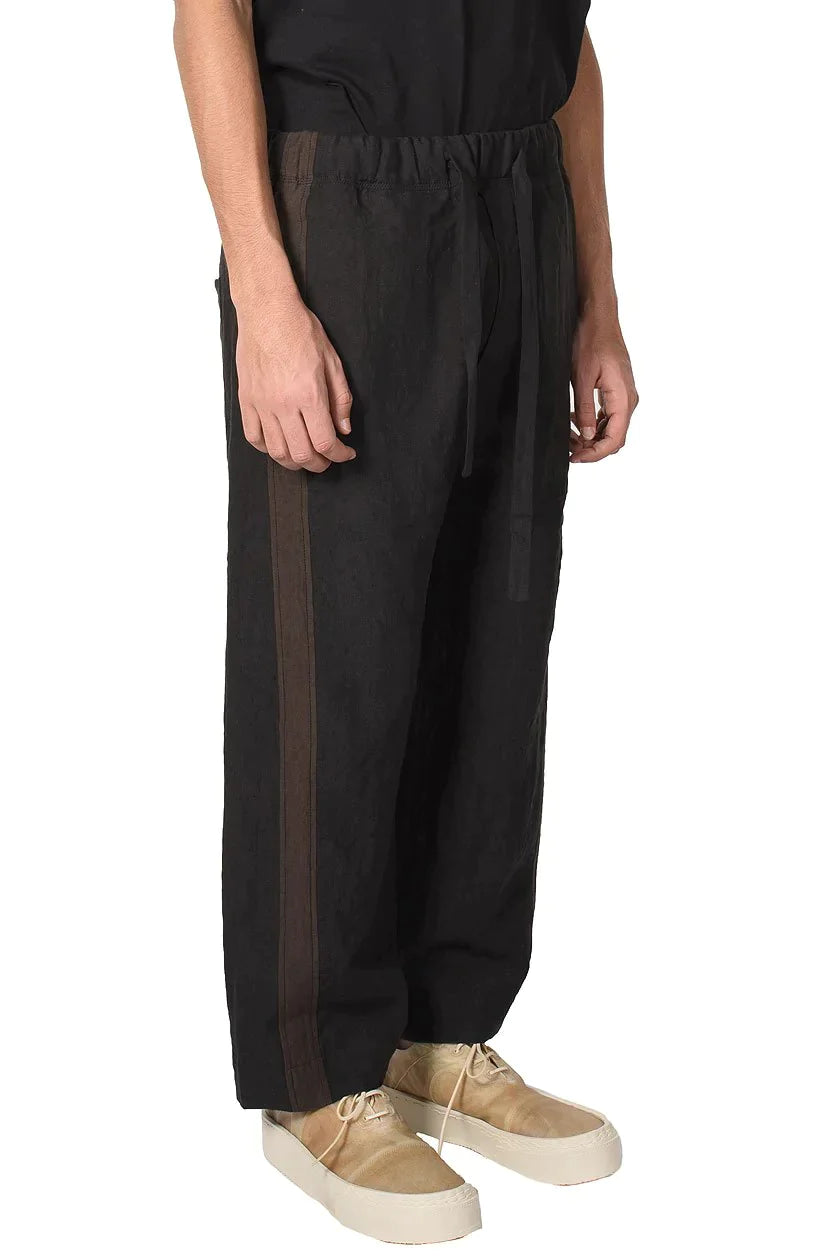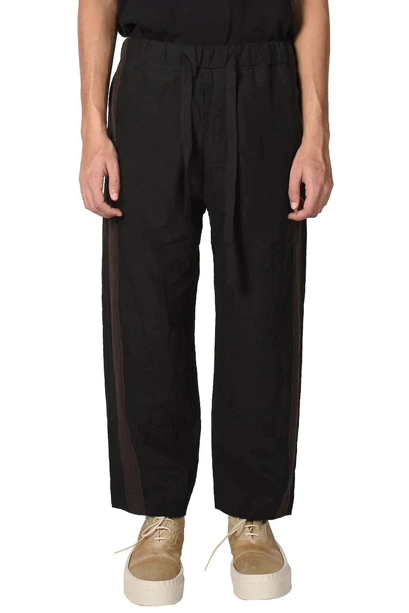 Ziggy Chen Trousers. Wide leg. Cropped leg. Loose fit. Slip pockets to the sides. Drawstring at waist. Crafted from linen blend. Comfortable soft feel. Stamped with contrasting tapes on the outseams.