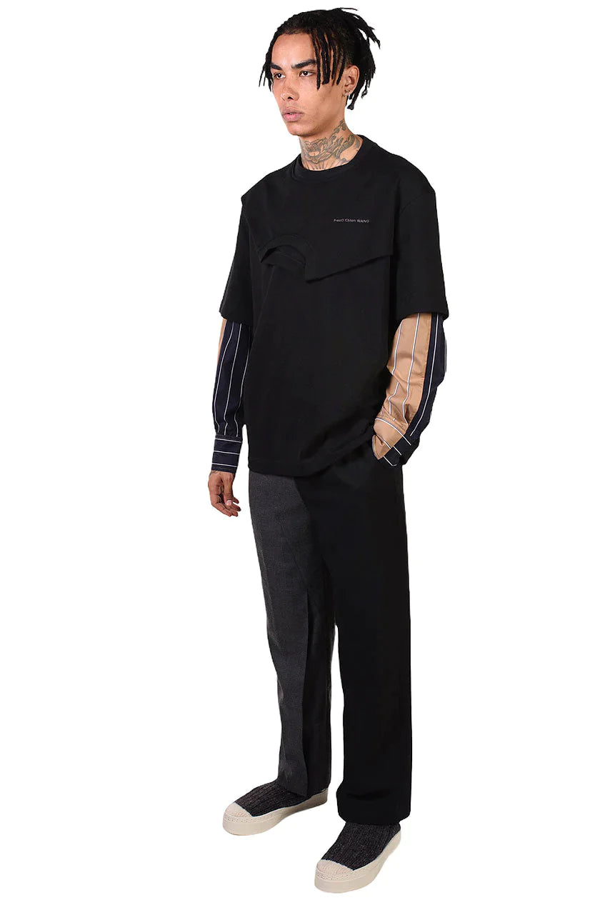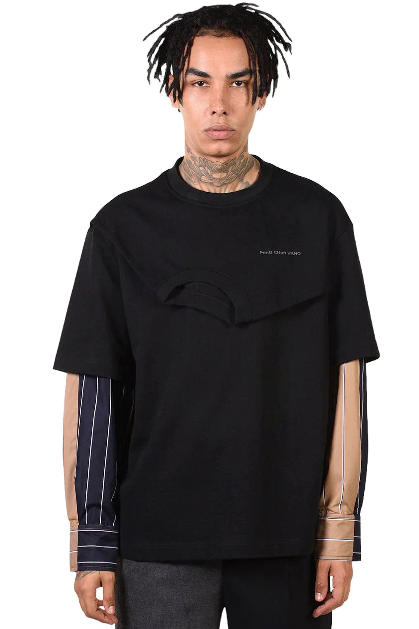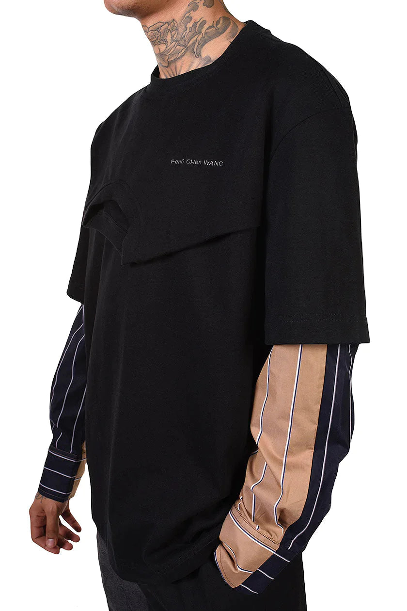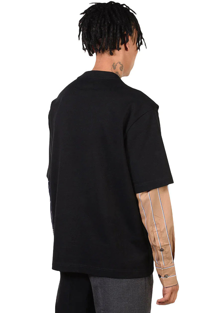 Doubled collar layered sweatshirt in black french terry cotton with striped cotton shirting fabric sleeves. Crew neck. Embroidered logo to chest.Colour: Black/Brown. Composition: Cotton