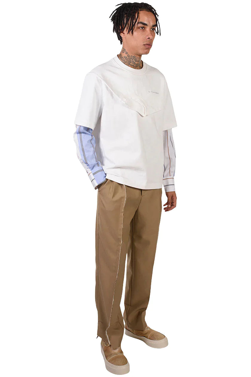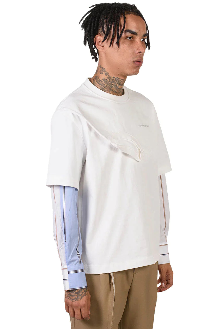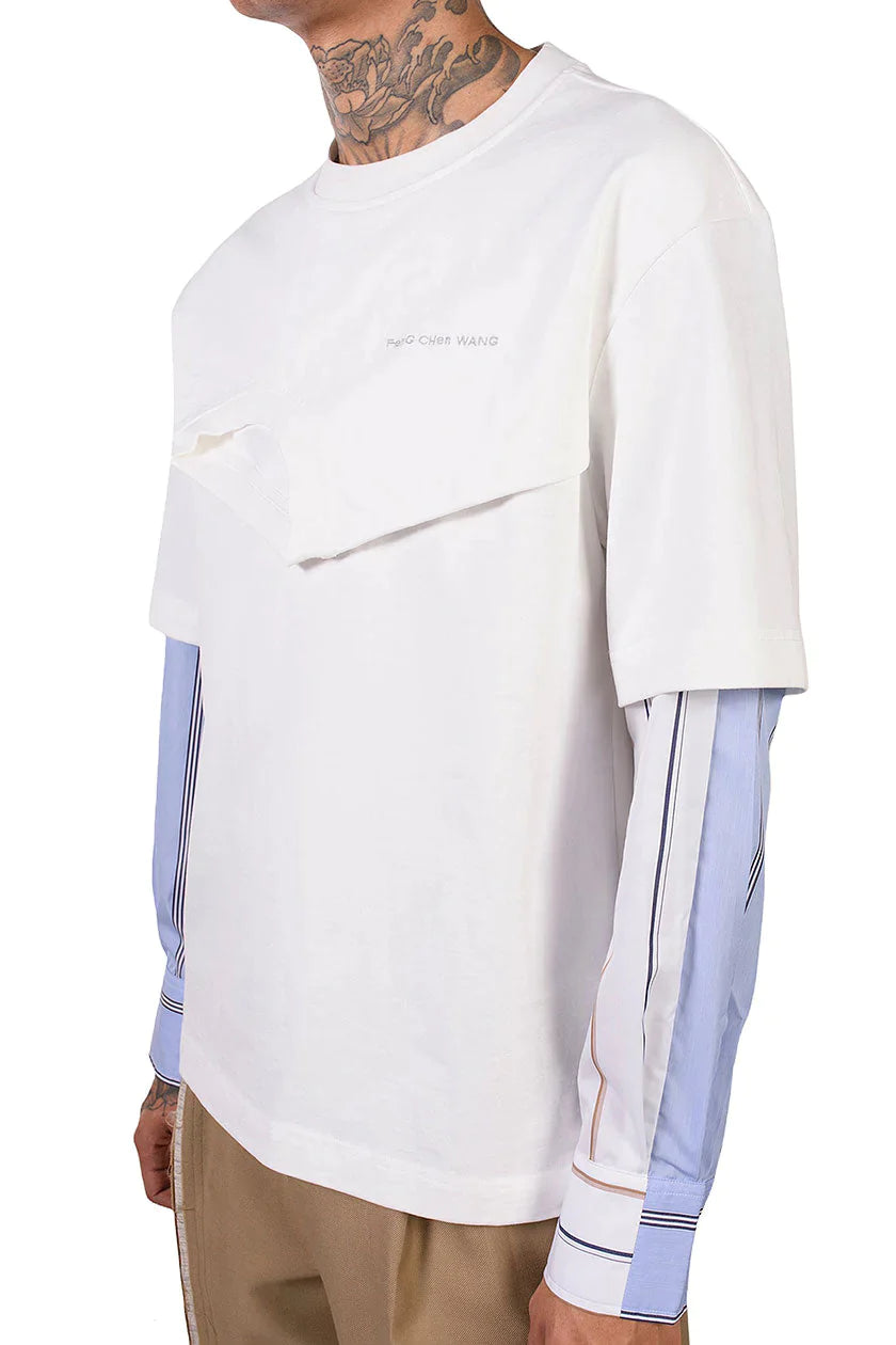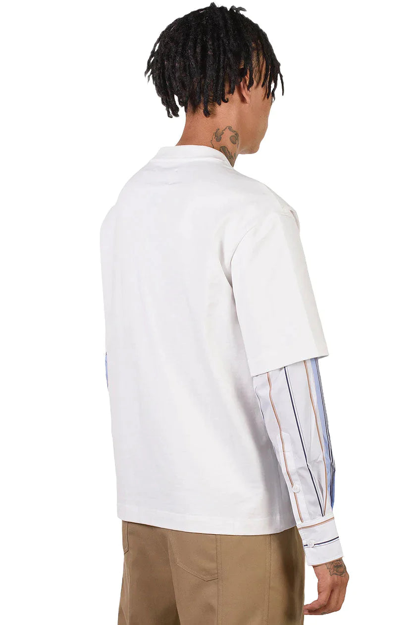 Doubled collar layered sweatshirt in black french terry cotton with striped cotton shirting fabric sleeves. Crew neck. Embroidered logo to chest.Colour: White/Blue. Composition: 100% Cotton