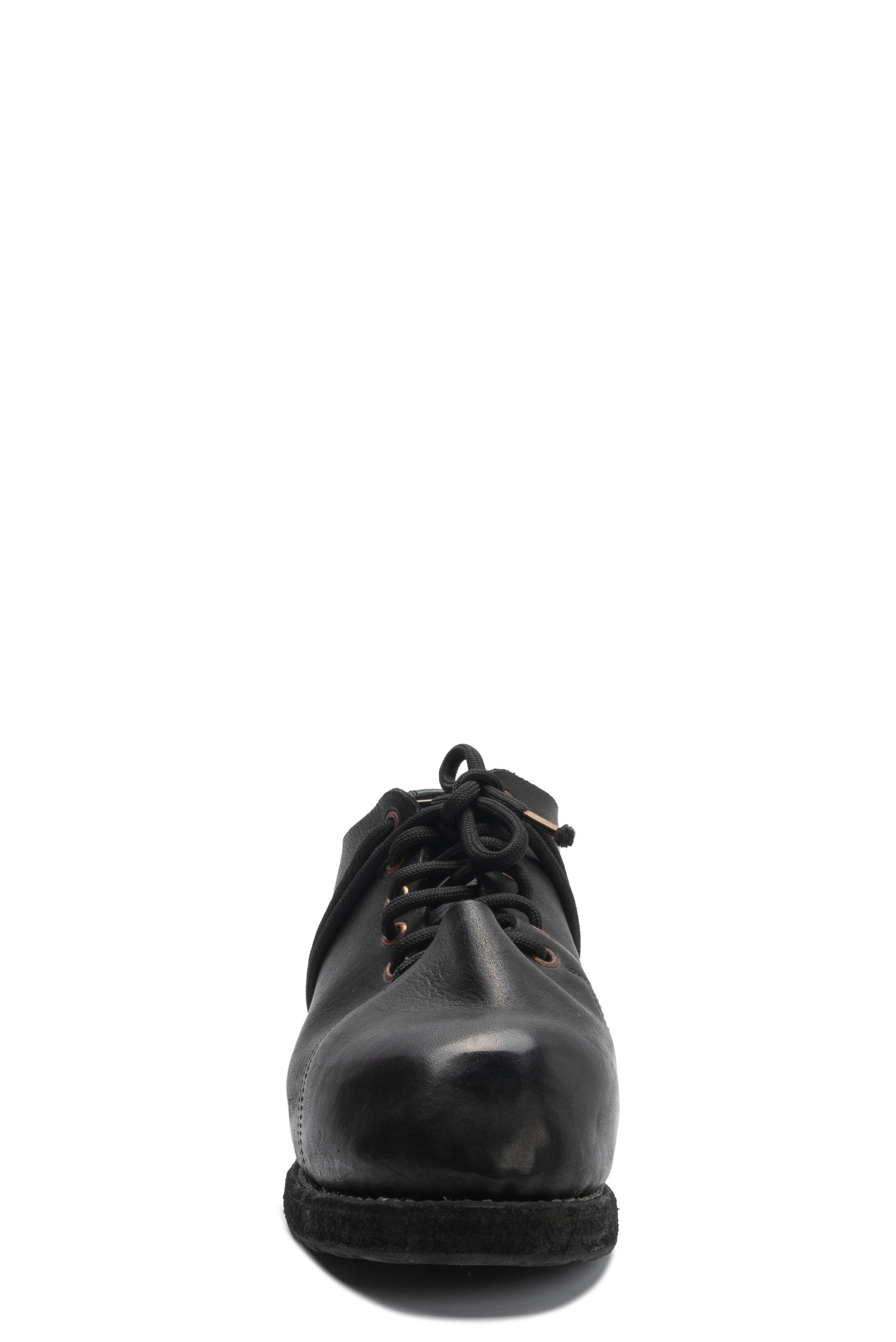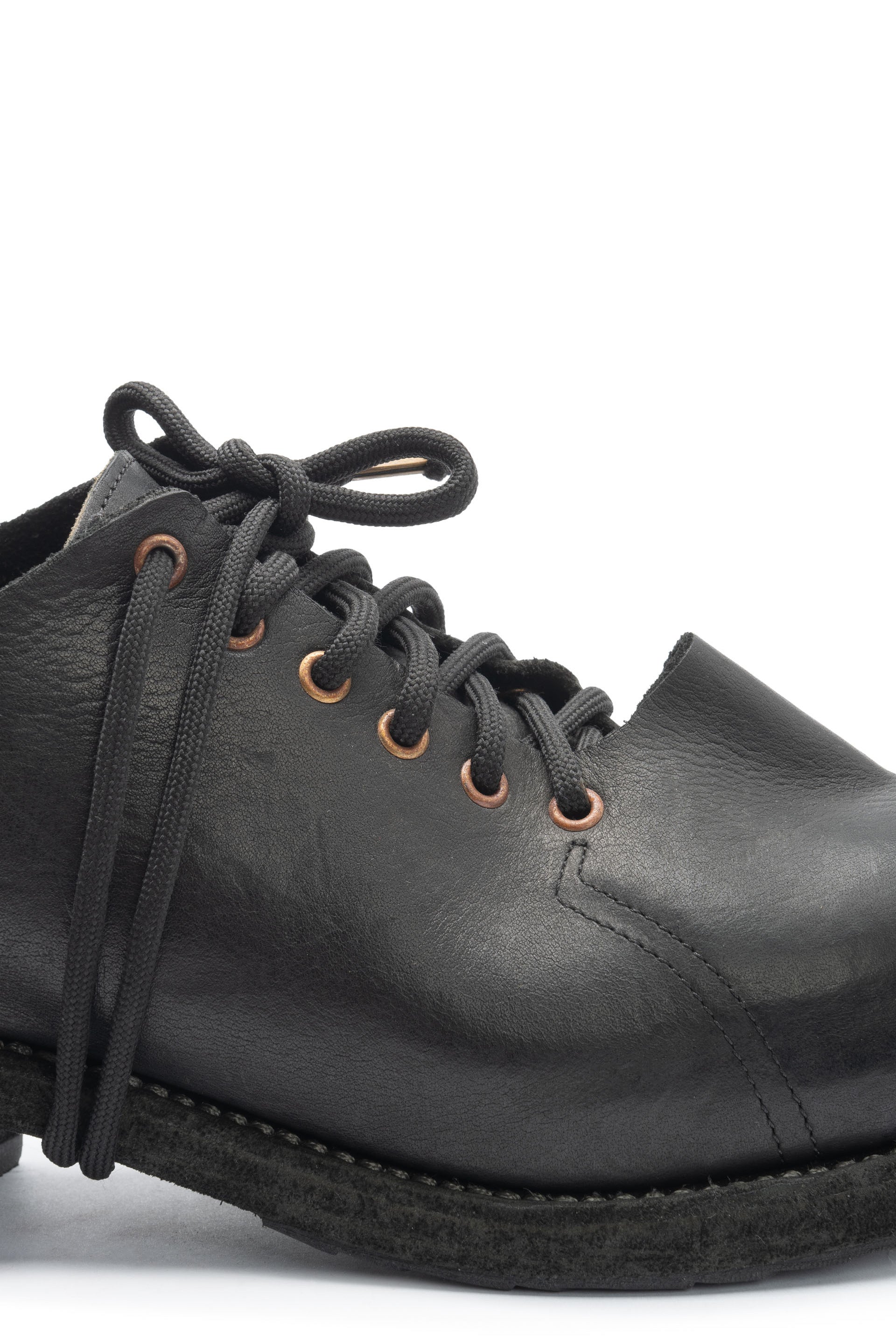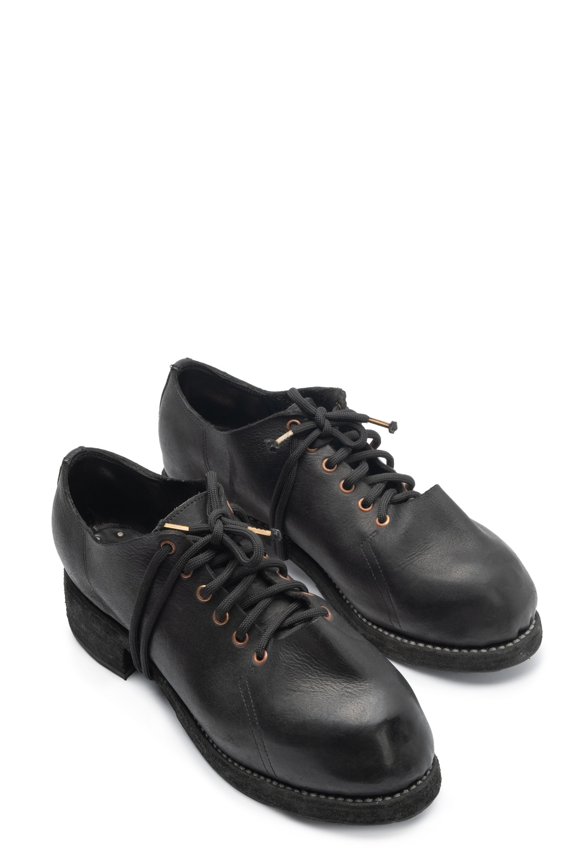 "Rhino toe" or "shark toe" Lace up shoes from Guidi. Tonal leather. Lace-up closure. Slightly raised heel. Made from Groppone leather which is a heavyweight but supple cow leather. Dyed using GUIDI's familiar object dyeing method. Goodyear construction welted manufacturing method. Treaded rubber Vibram outsoles included