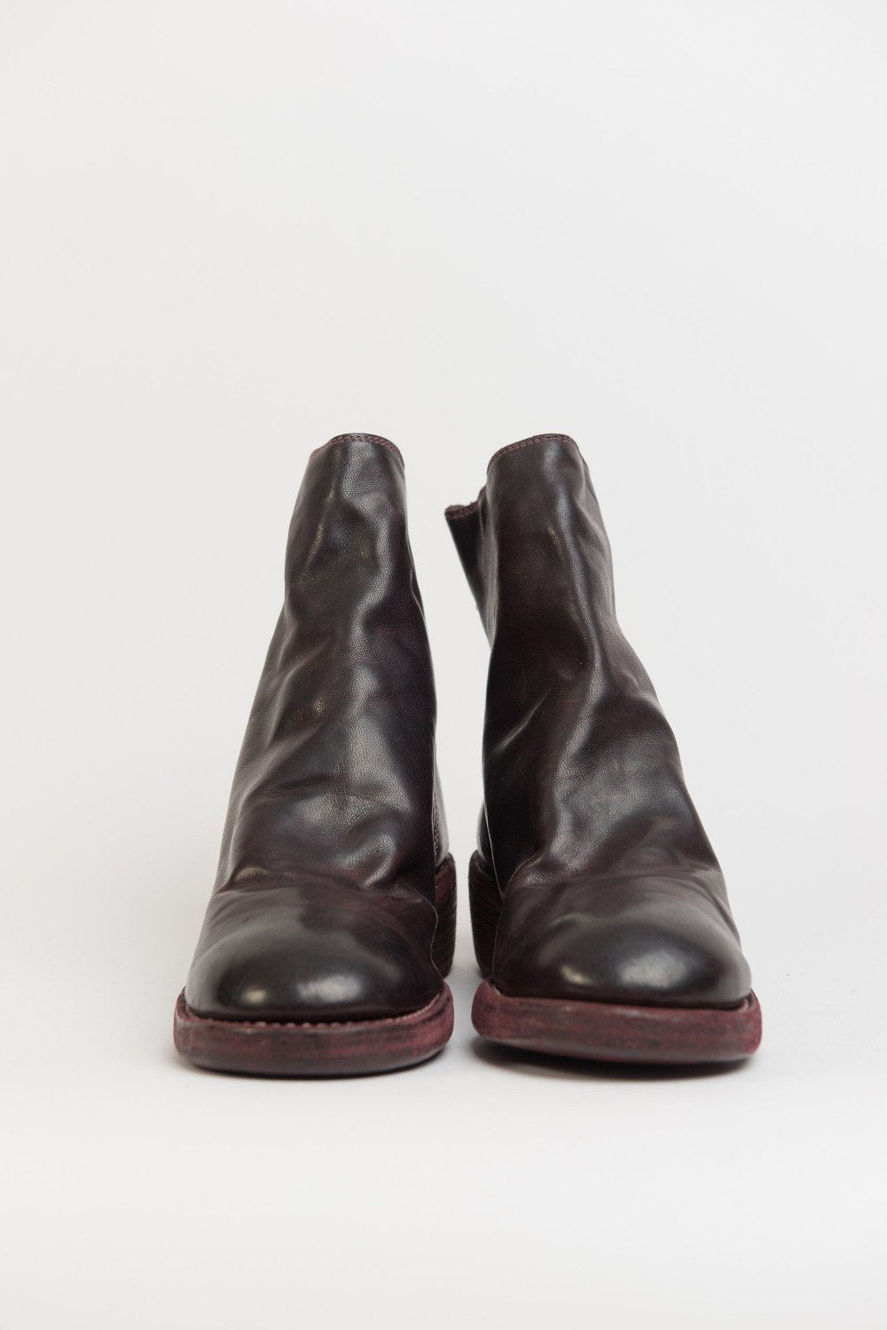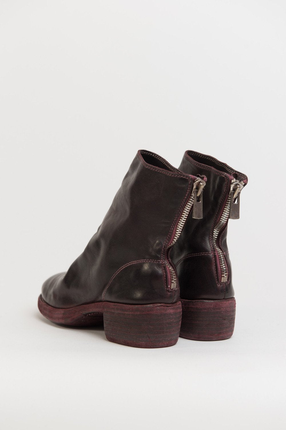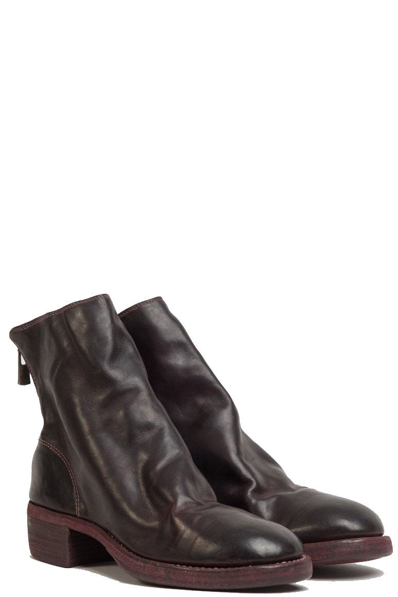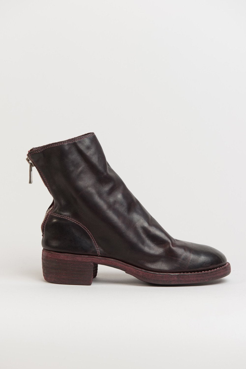 Guidi back zip boots in Burgundy. 796Z Style. Antique brass-style detailing. Back zip closure. Stacked heel. Horse leather. Burgundy dye.