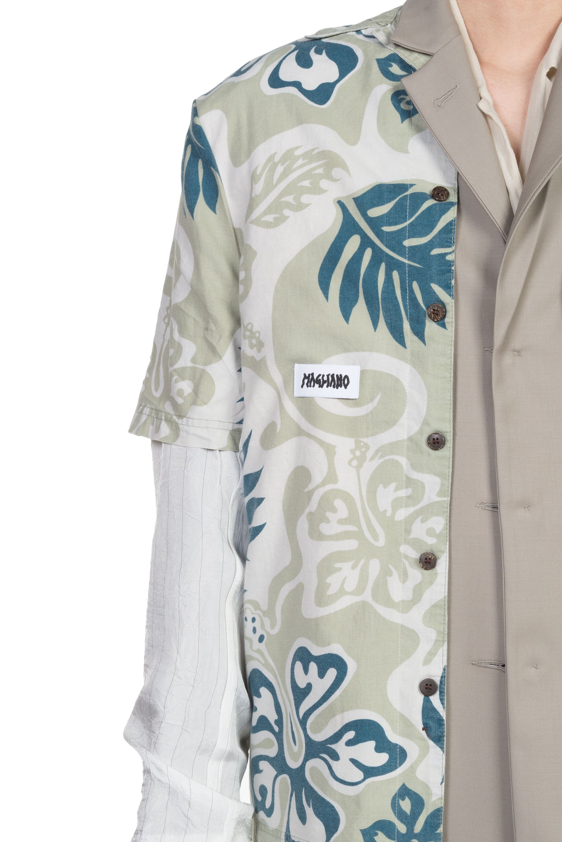 Single breasted jacket. 3 Button closure at front. Side Pockets. Inside pockets. Magliano twist. Reversibile featuring an inner Hawaiian print shirt. Hawaiian shirts are hand-selected by the Magliano team and have been re-worked to create this product. Possible variations and imperfections between each item make it unique to the wearer.
