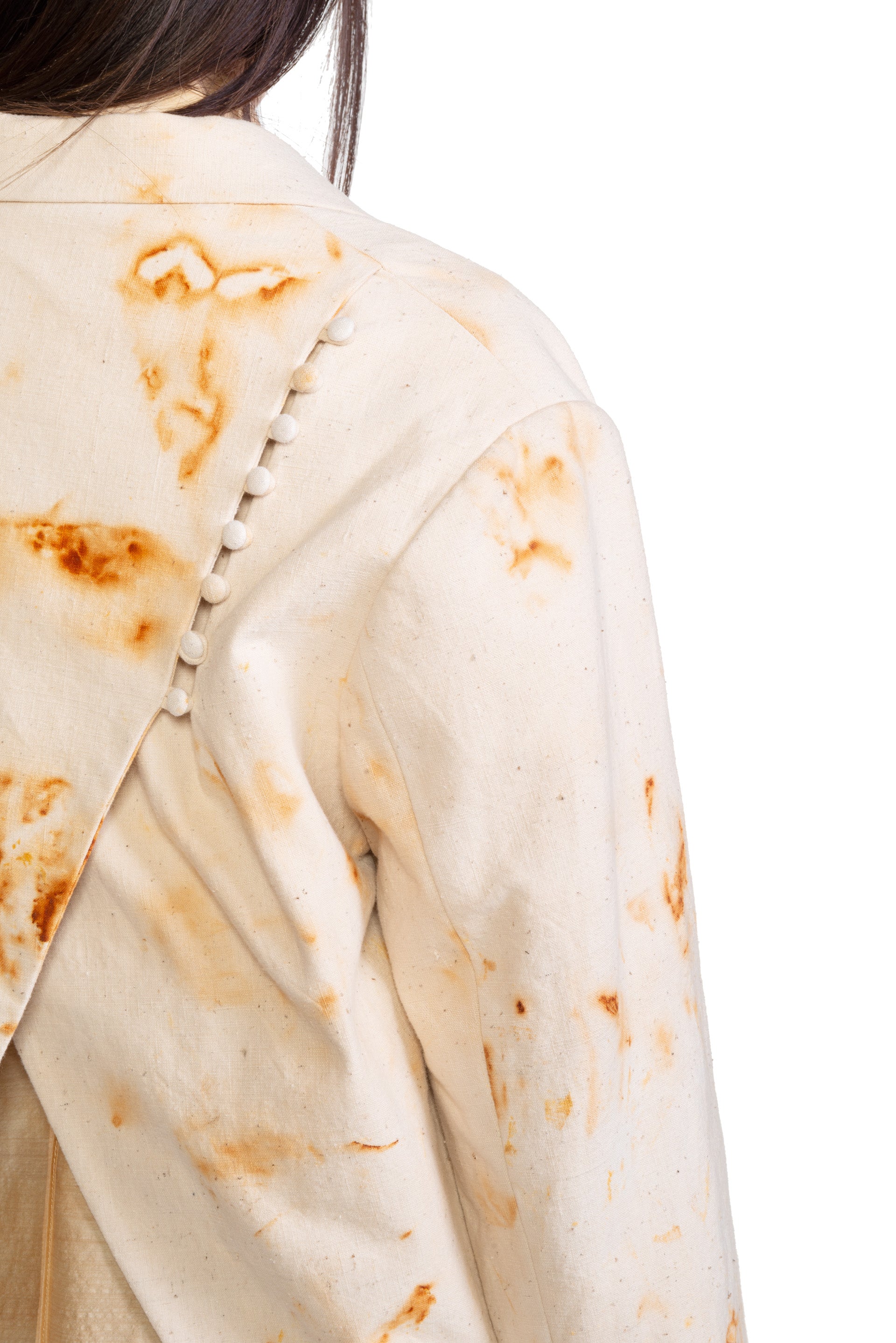 Professor. E understands the time of aesthetics from the use of cotton, hemp and wool. Fabric stitching, patching, designs without edge trimming, deconstruction, and reproduction are all Professor. E's signature elements creating classic immortal designs that can be viewed with the Abstract Cut Out Blazer Rusted Dyed.