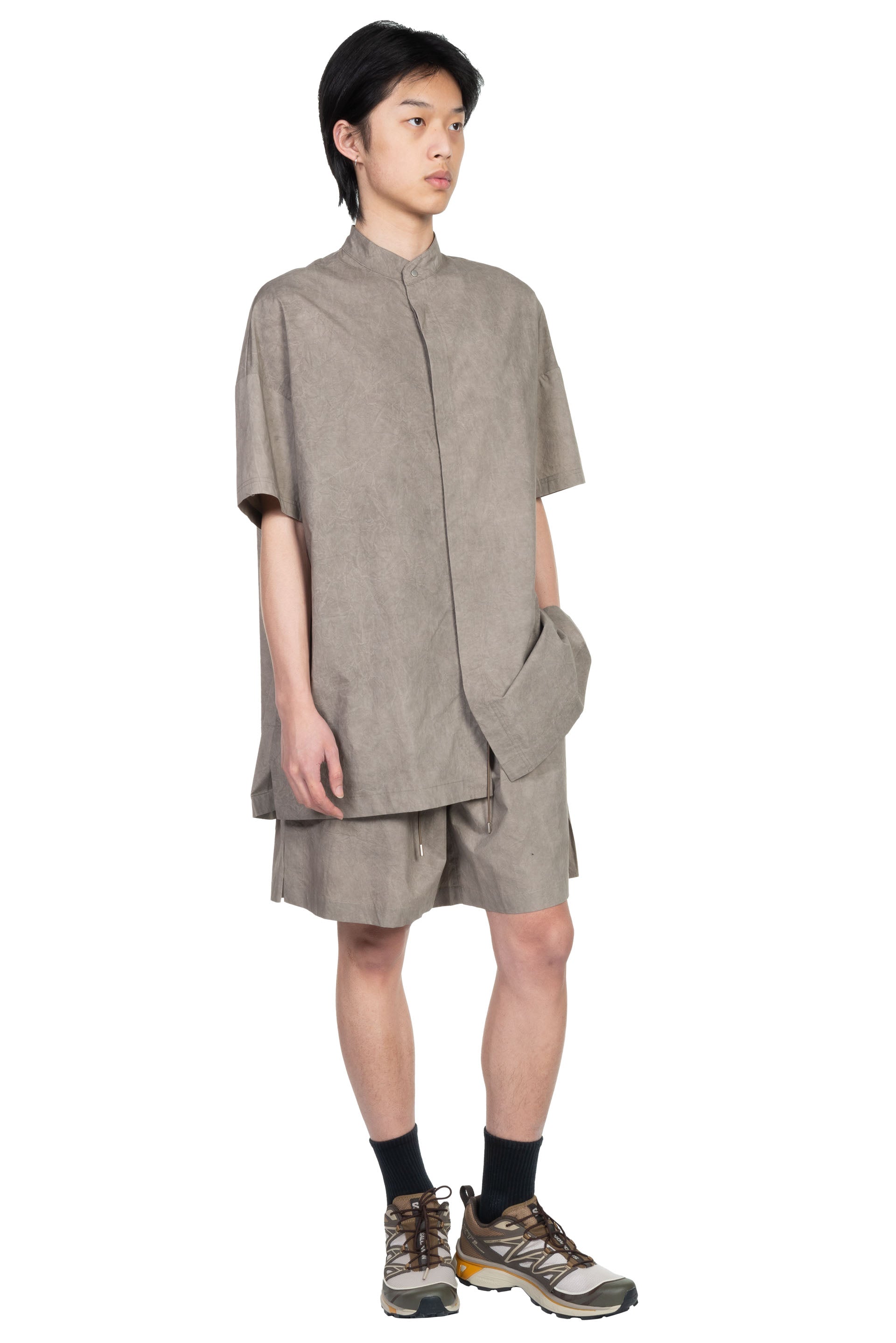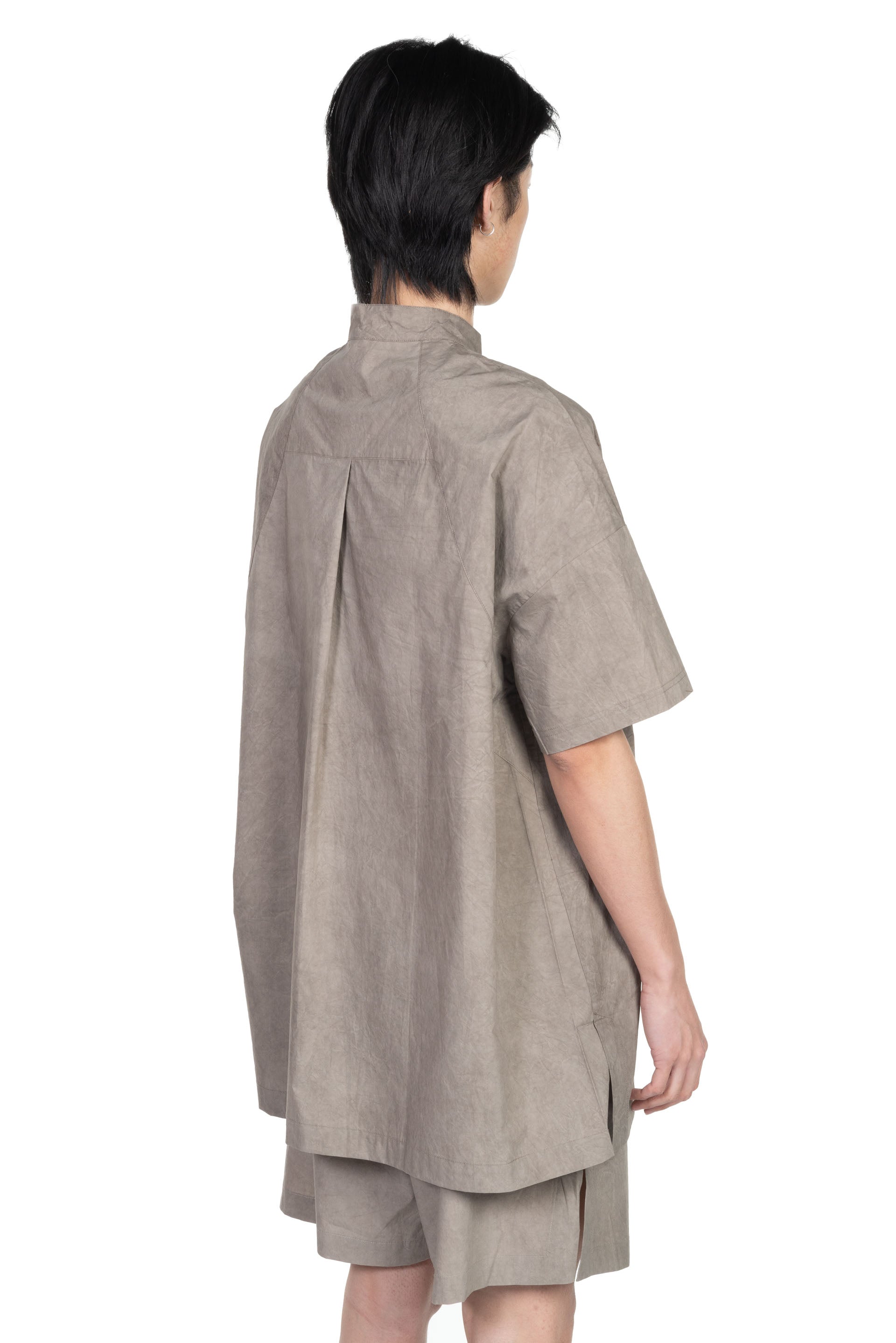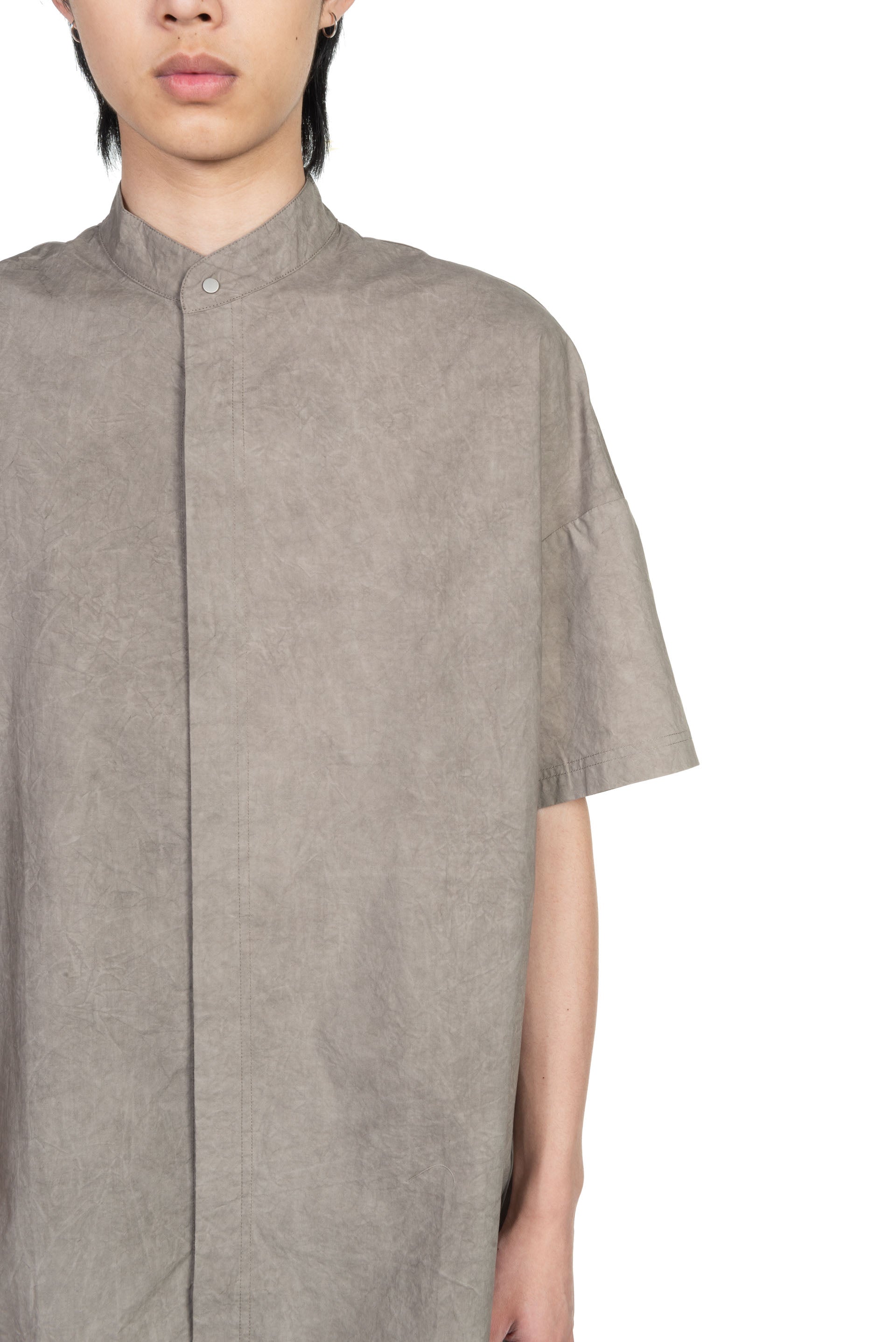 Short sleeve band collar shirt in a lightweight paper texture cotton featuring silver toned revealed snap buttons and a concealed button closure at the front. Semi oversized fit. Made from a lightweight textured crisp woven cotton. Vent at side seams.