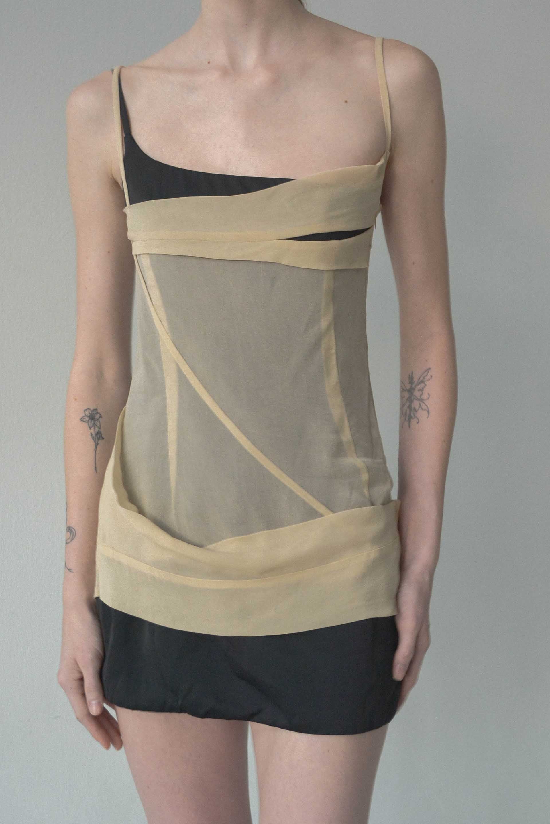 The Alvaro Nude Silk Dress is a sheer silk short dress lined with satin featuring spaghetti straps and drape details. Side zipper opening. Body-fitted.