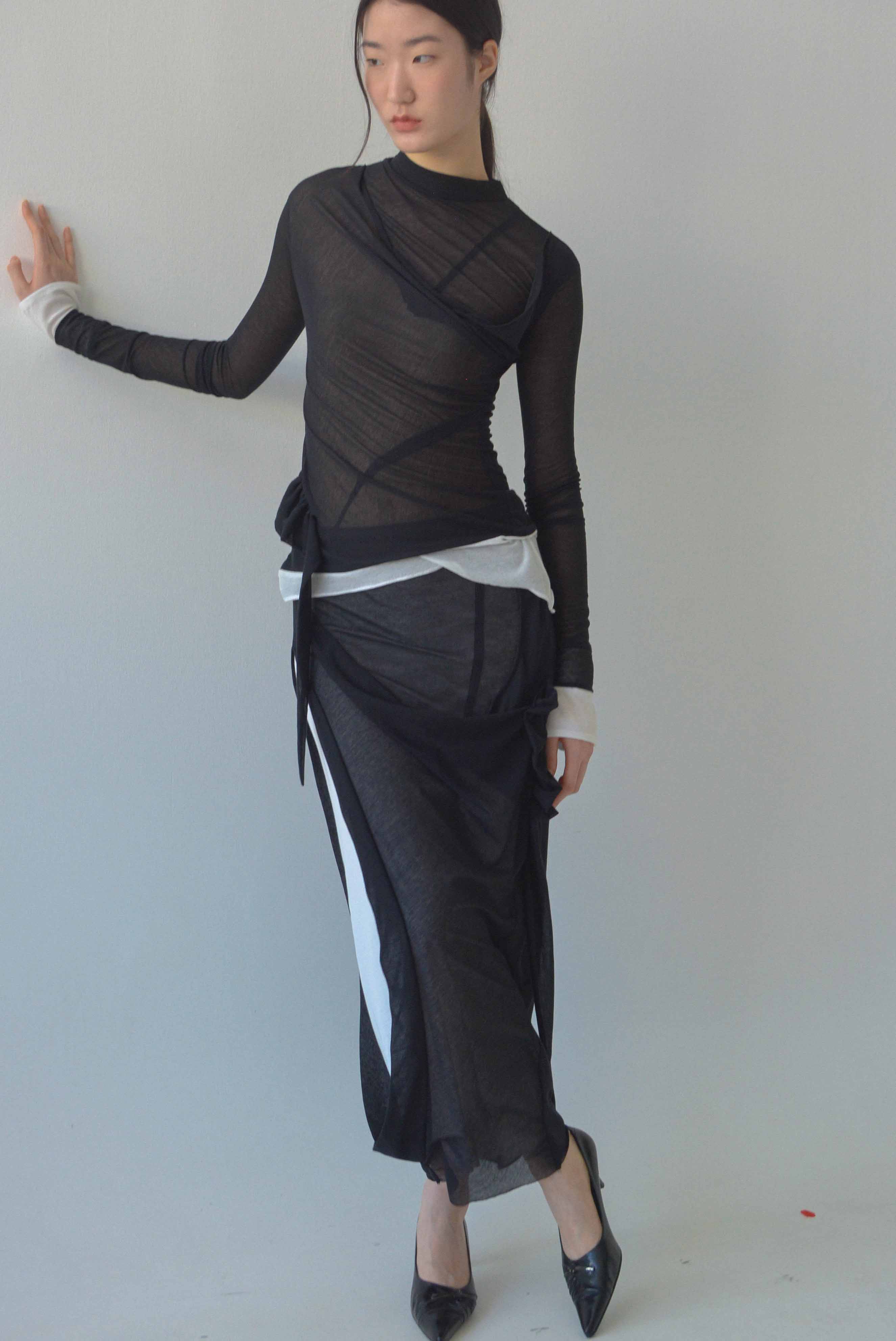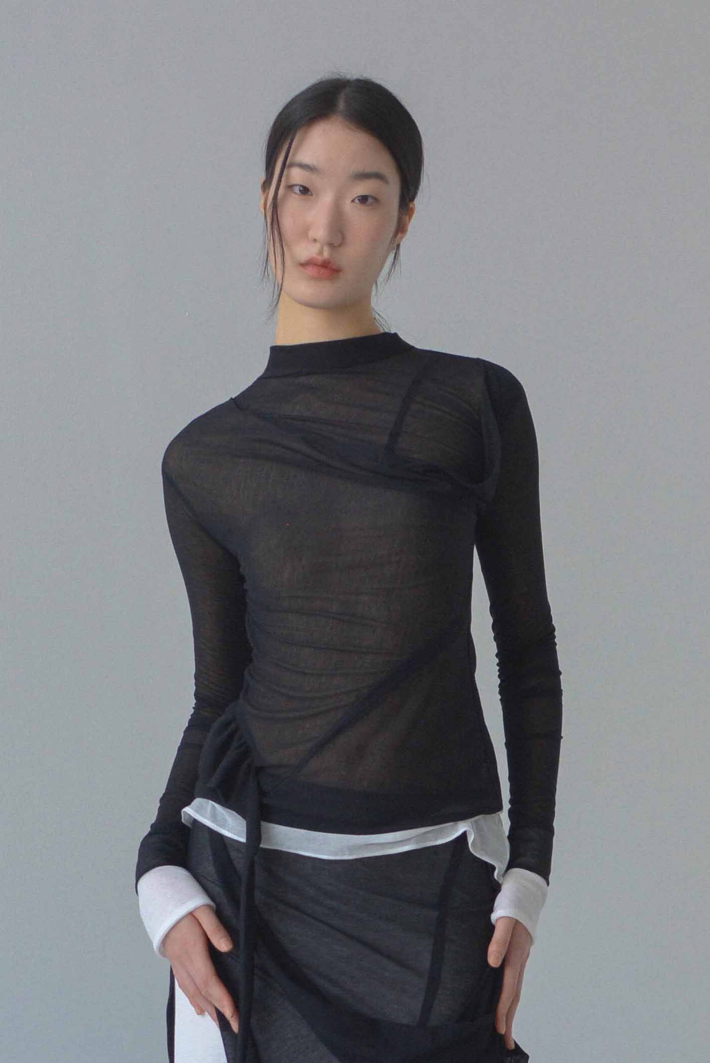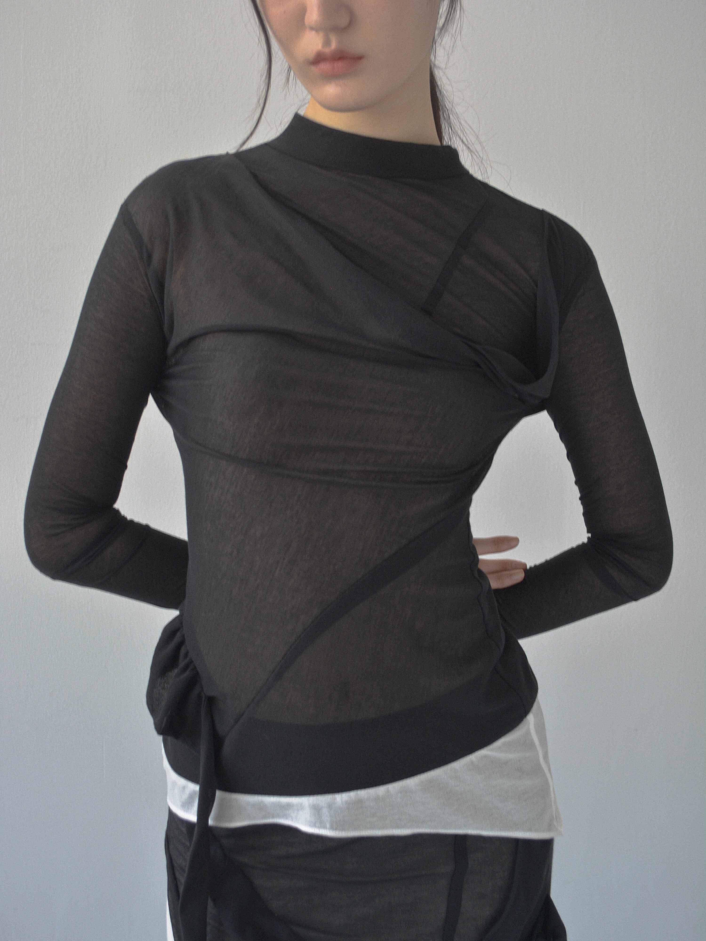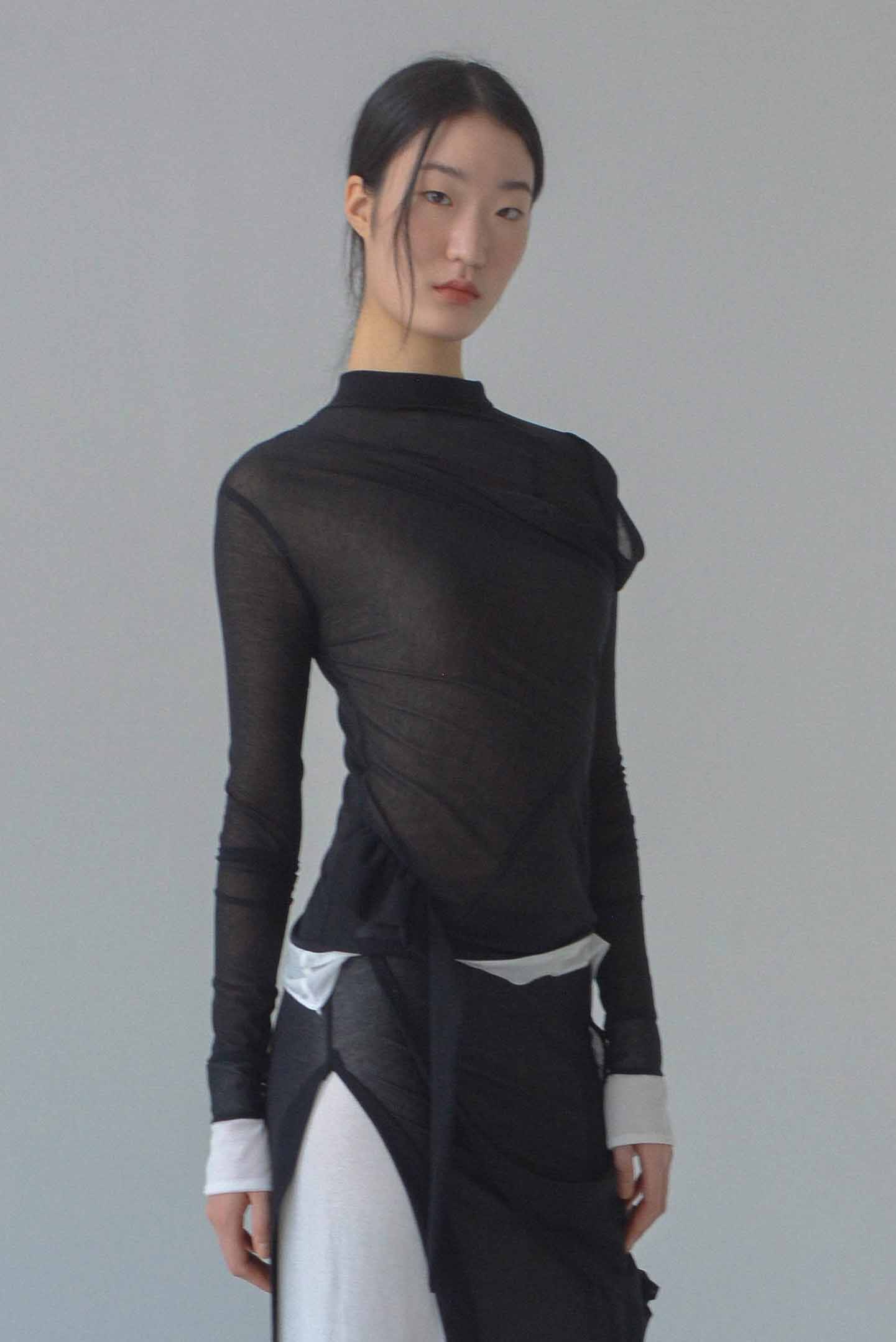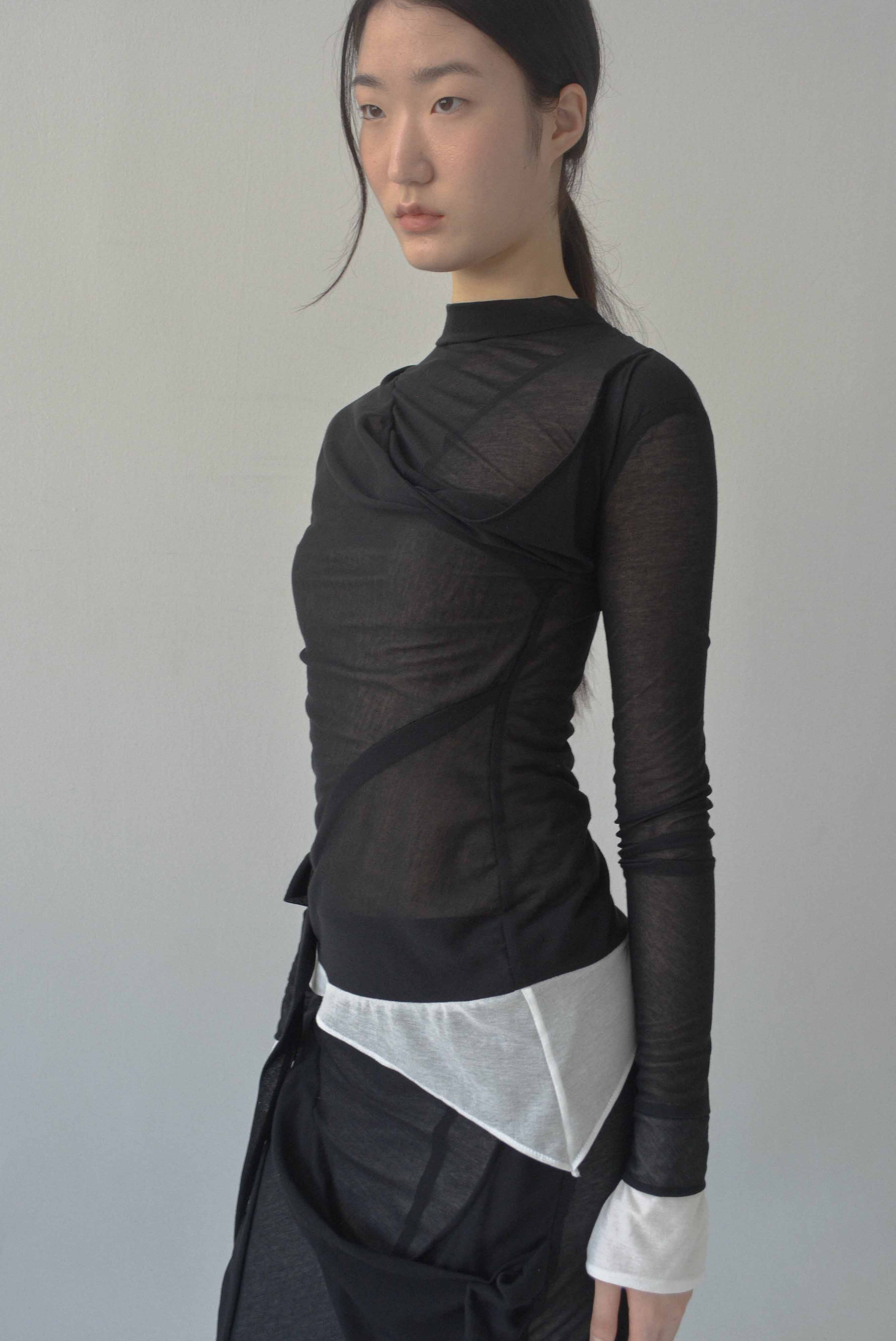 Aphora Long Sleeve top comes with mock neck, asymmetrical draping and layered hem. Stretchy jersey for body fitted cut.