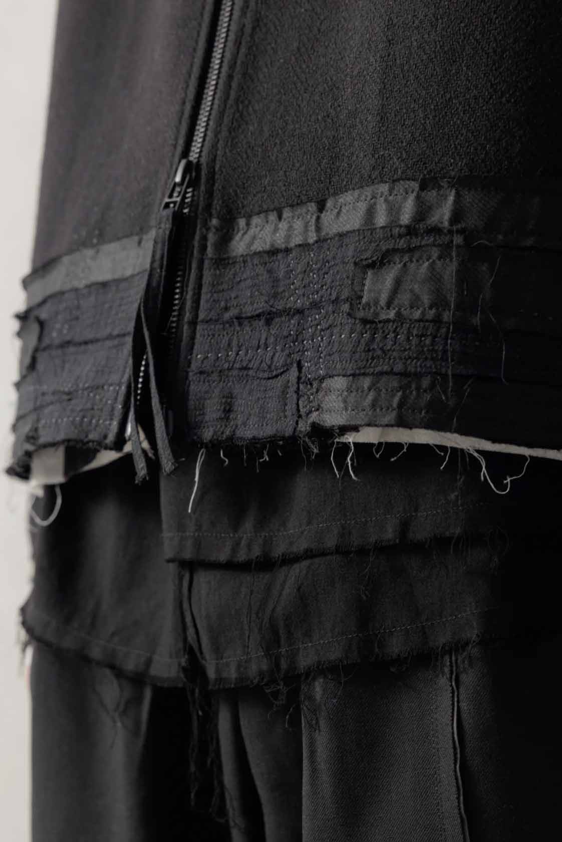 Professor. E understands the time of aesthetics from the use of cotton, hemp and wool. Fabric stitching, patching, designs without edge trimming, deconstruction, and reproduction are all Professor. E's signature elements creating classic immortal designs that can be viewed with the Applique Jacket Black