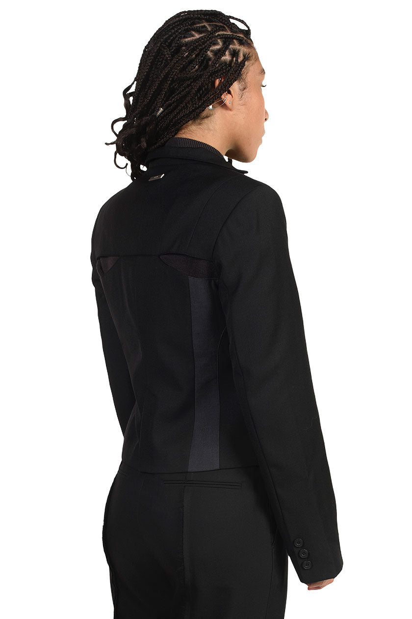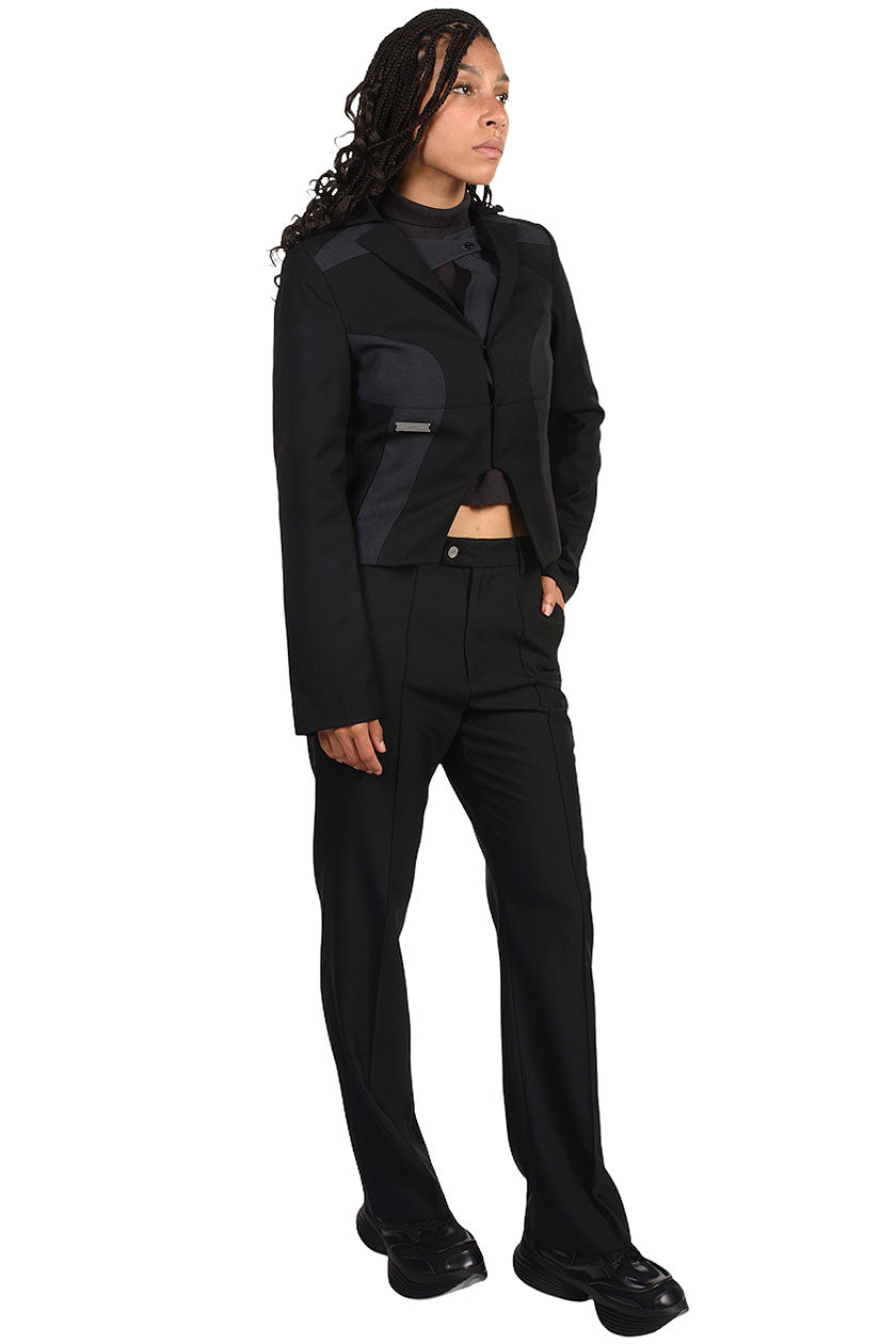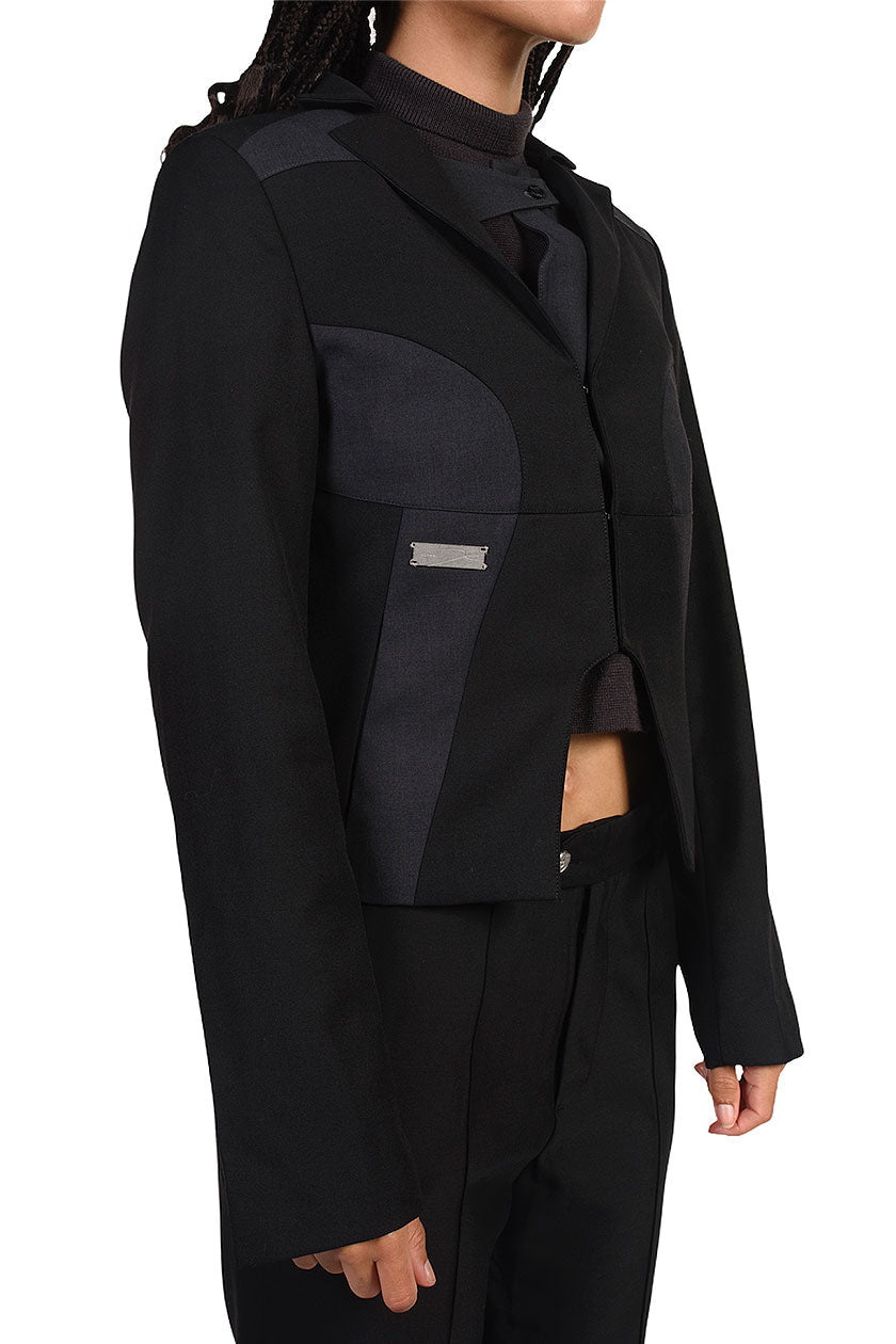 C2H4 concept ranges from hypothetical space scientists producing sport and streetwear-inspired designs creating an intergalactic underground culture. Using her studio as a laboratory, Chen’s meticulously elevates wardrobe cornerstones as seen with the Arc Cutting Splicing Layered Tailored Jacket.
