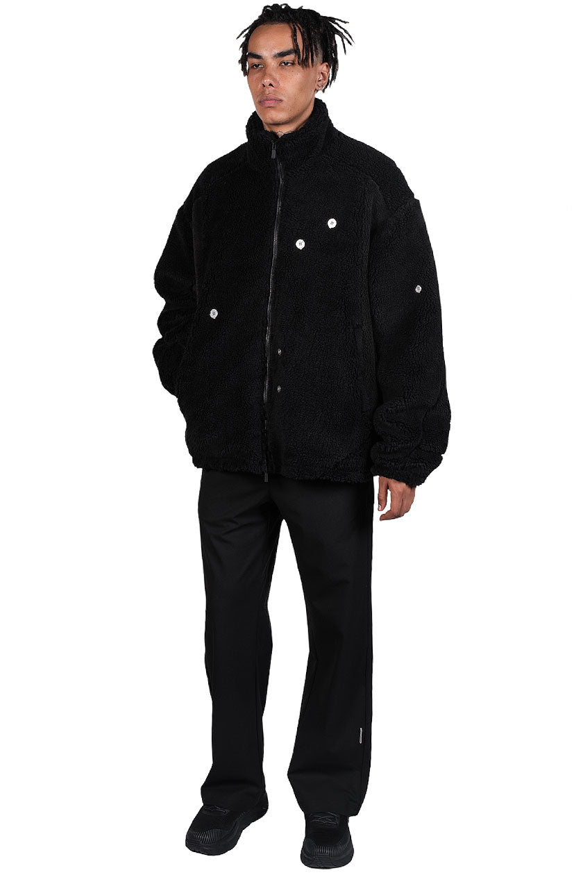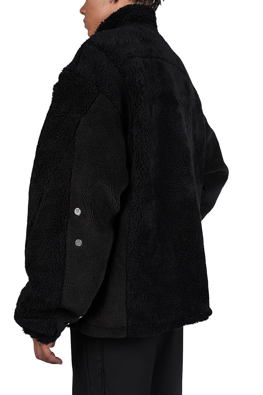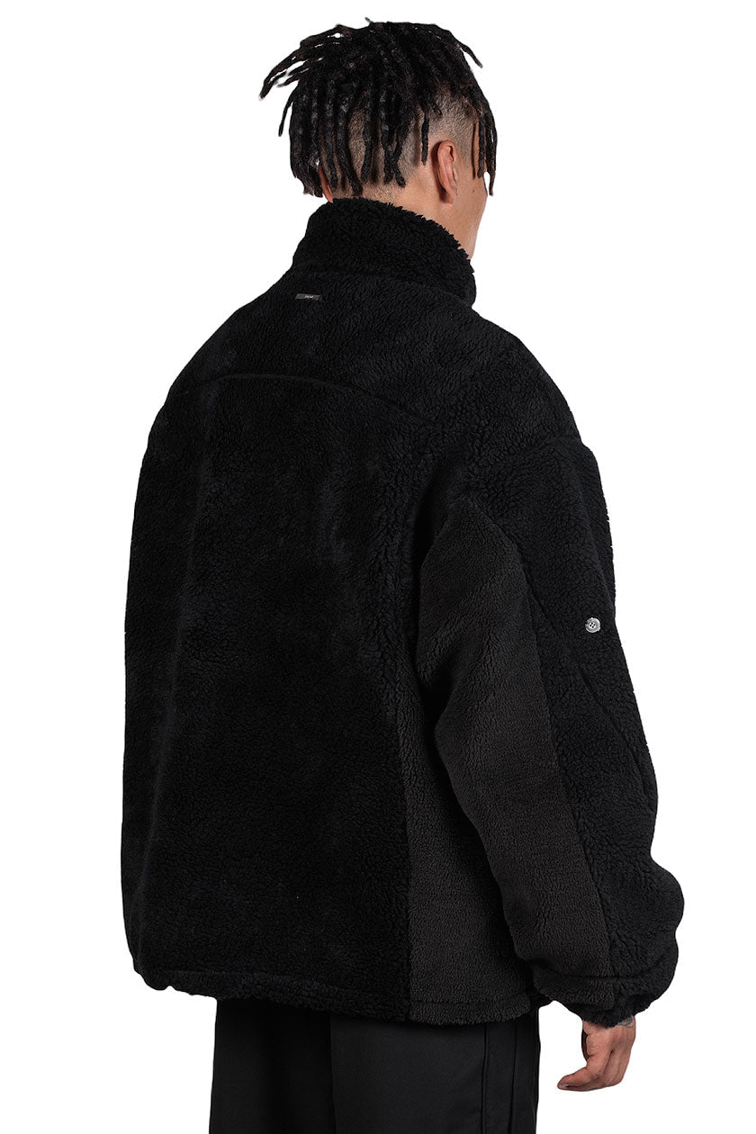 Padded Oversize Jacket. Two Type Panelled Fleece. Two Way Zipper Closure At Front. Zippered Pockets At Waist. Hidden Elastic Drawstring At Hem. Logo Engraved Trims Throughout. Elasticised Cuffs