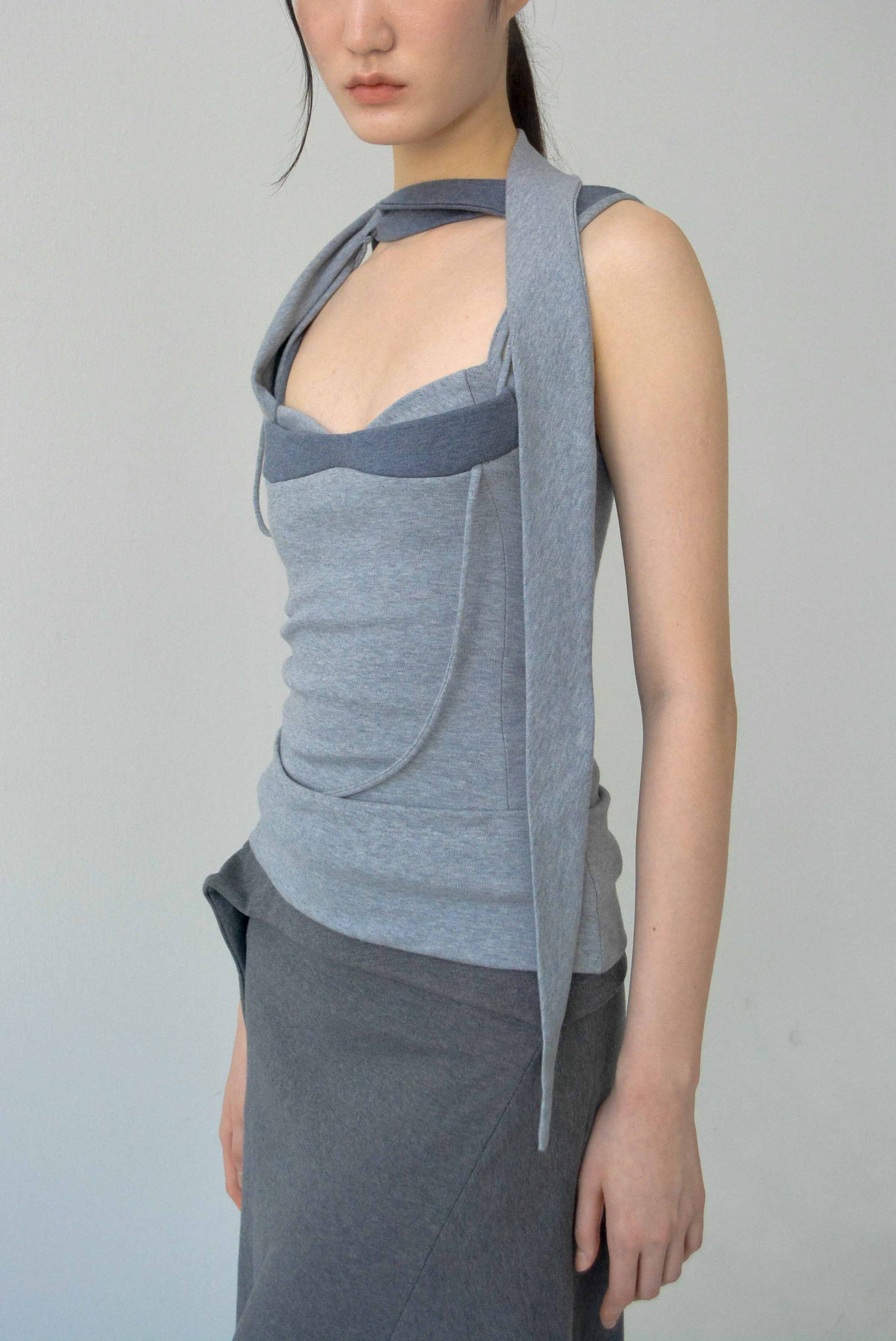 The ARO Sand Top is a fitted jersey piece featuring an asymmetric neckline, sculpted bust detail, and hanging strap accents. Side zipper as opening. Scoop Neckline. Stretchy double-layered jersey for body fitted cut