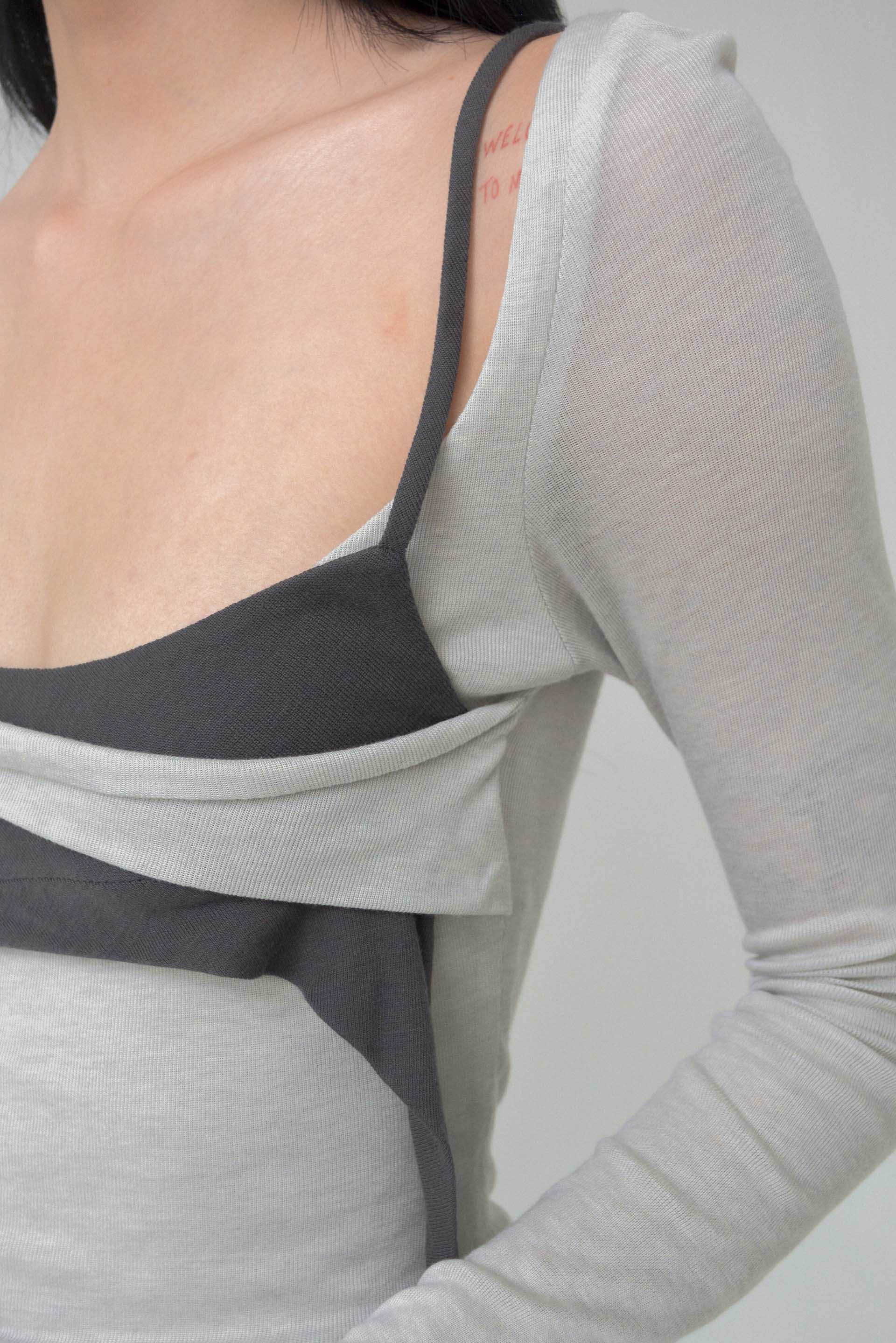 Caro Chia continuously explores intriguing forms that are then brought to life through innovative shapes and pattern cutting techniques. Caro Chia is known for her experimental construction combined with making textiles engineered to form sculptural embellishments in subtle colour ways as seen with the Artois Top Grey.