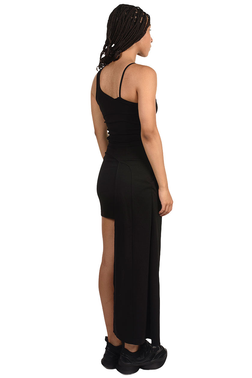 Sleeveless Asymmetric Midi Dress In Black. Layered Construction. Cut Out Details. Multi Shoulder Strap. Hidden Zippered Closure At Side