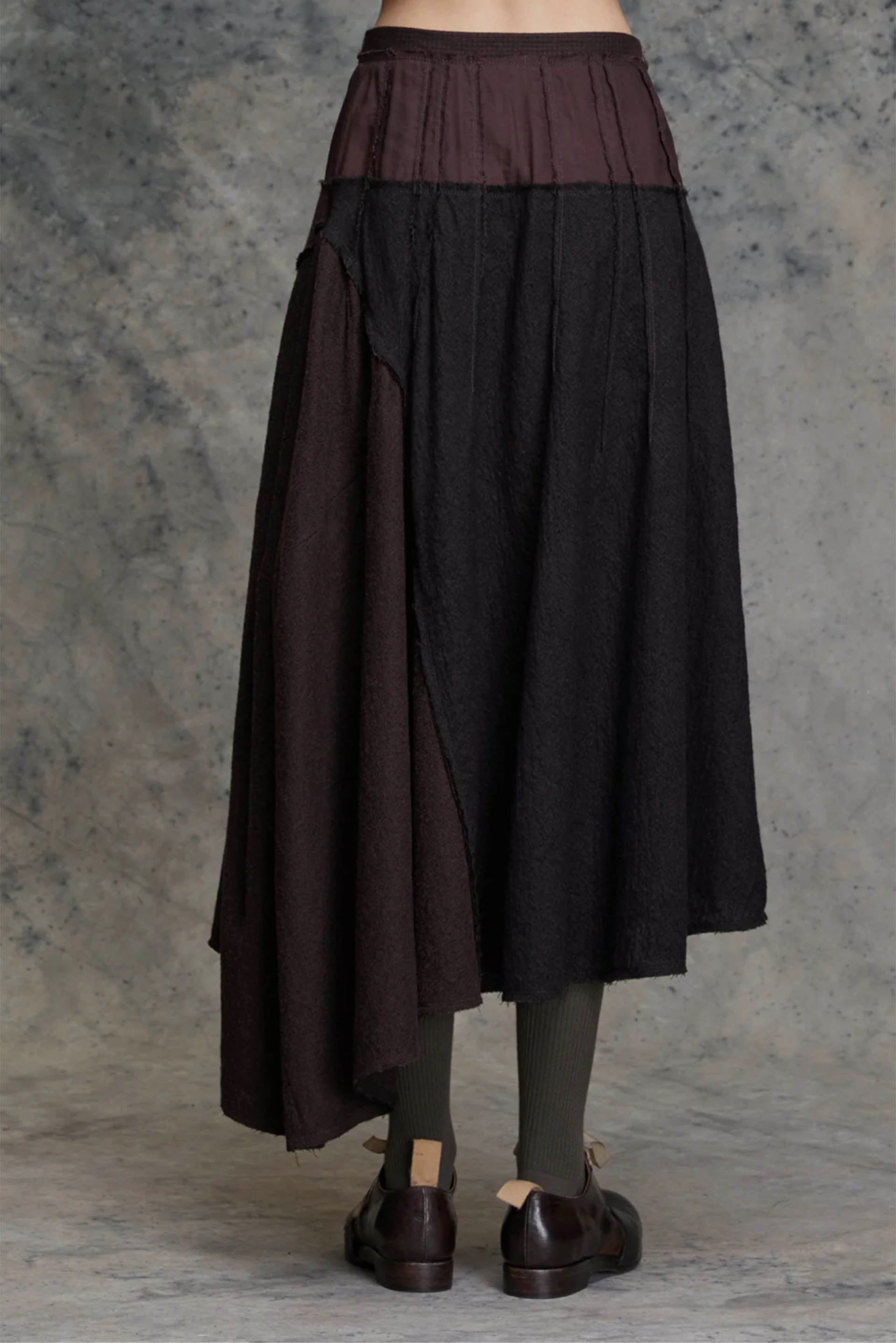 Loose fit. Full length. Concealed side zipper closure. Small pleats sewn with different fabric. Asymmetric hemline.
