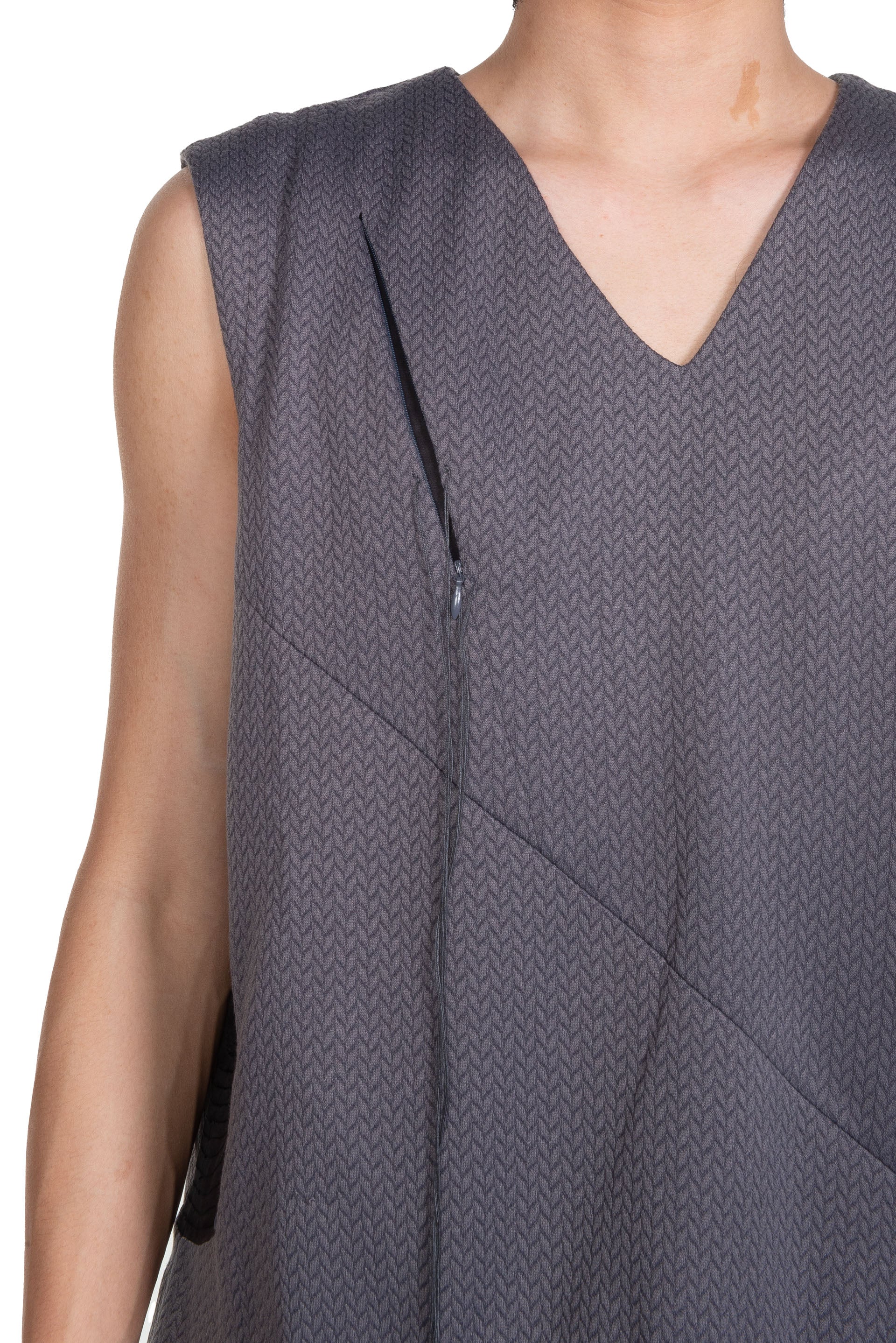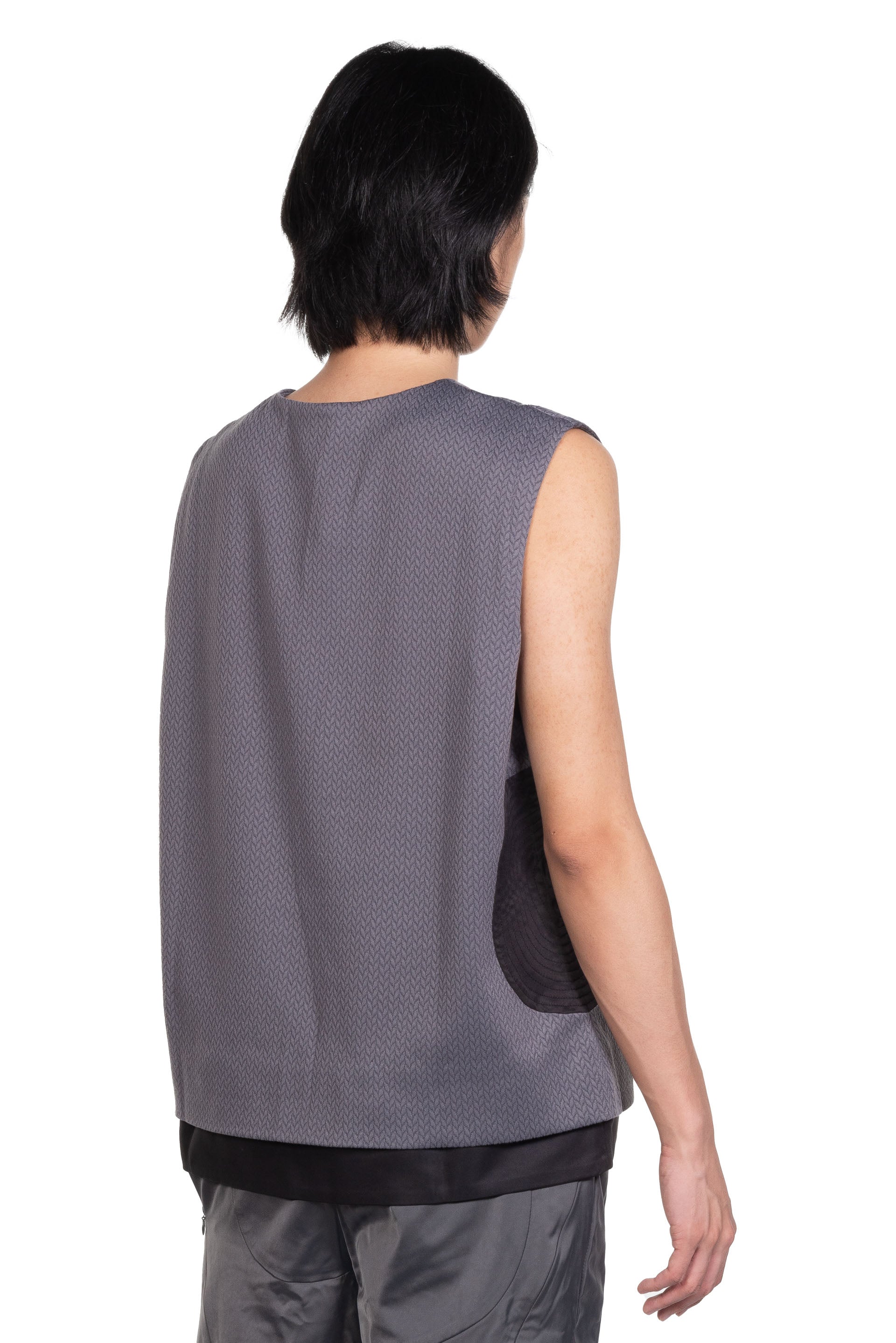 Aenrmous plays heavily with layers, asymmetry, deconstruction of pieces and detachable or adjustable elements. The brand understands trends while building something new and exciting as seen with the Asymmetrical But Symmetrical Vest Grey.