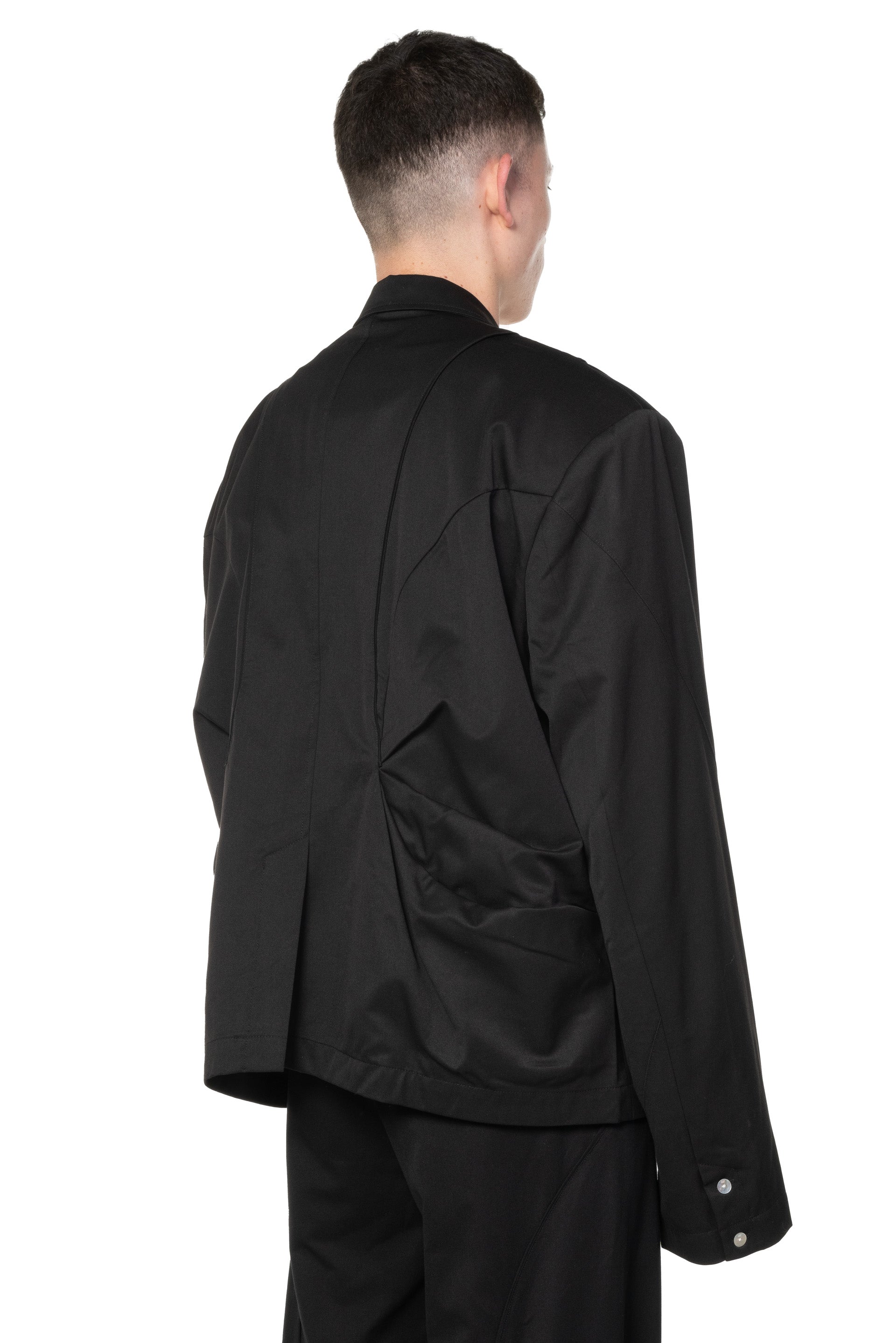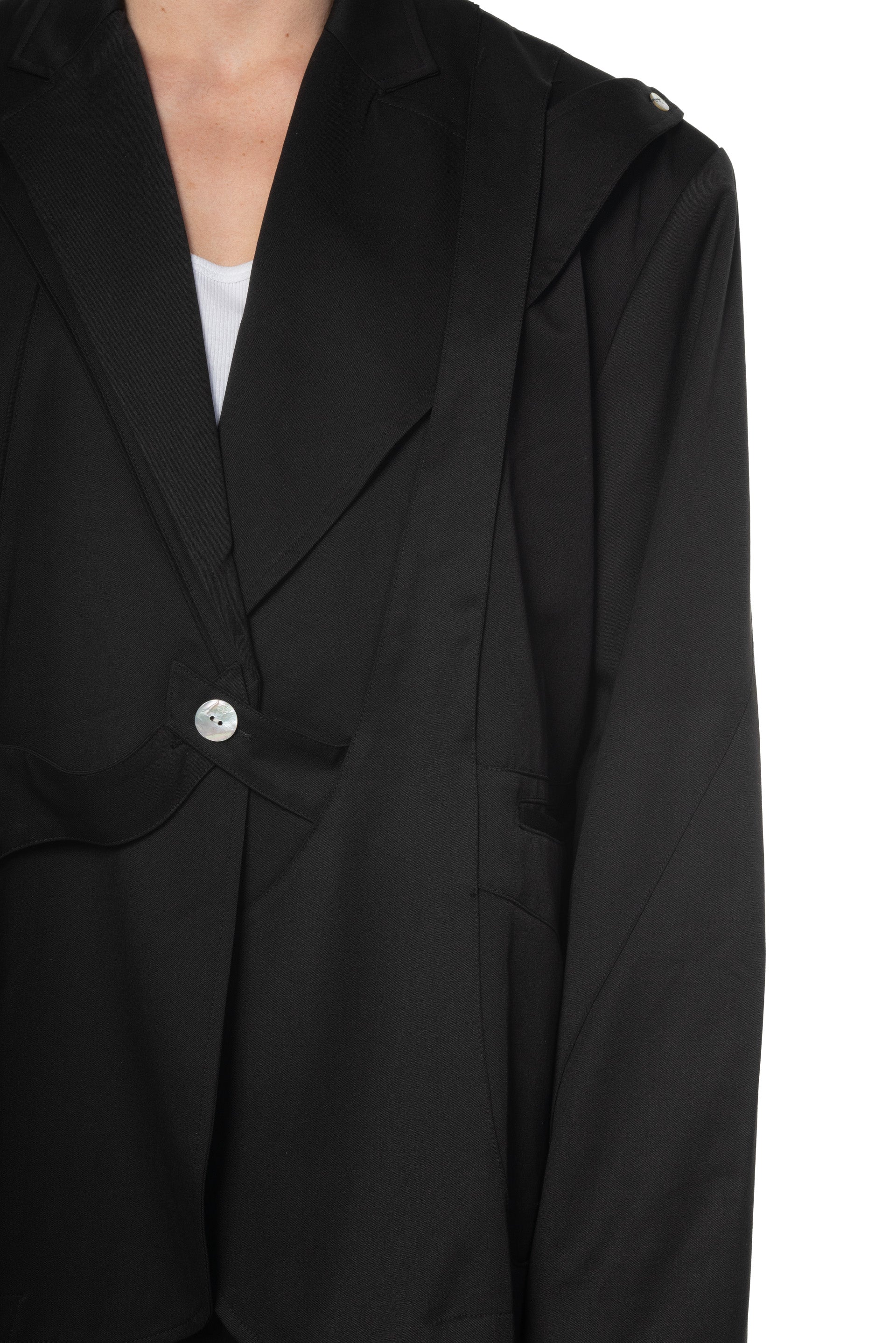 Layered. Panelled with asymmetrical construction. Notched lapel. Button closure. Welt pockets. Padded shoulders. Two-button surgeon's cuffs. Draping at back. Central vent at back hem. Welt pocket at interior. Full cupro satin lining. Logo-engraved mother-of-pearl hardware.