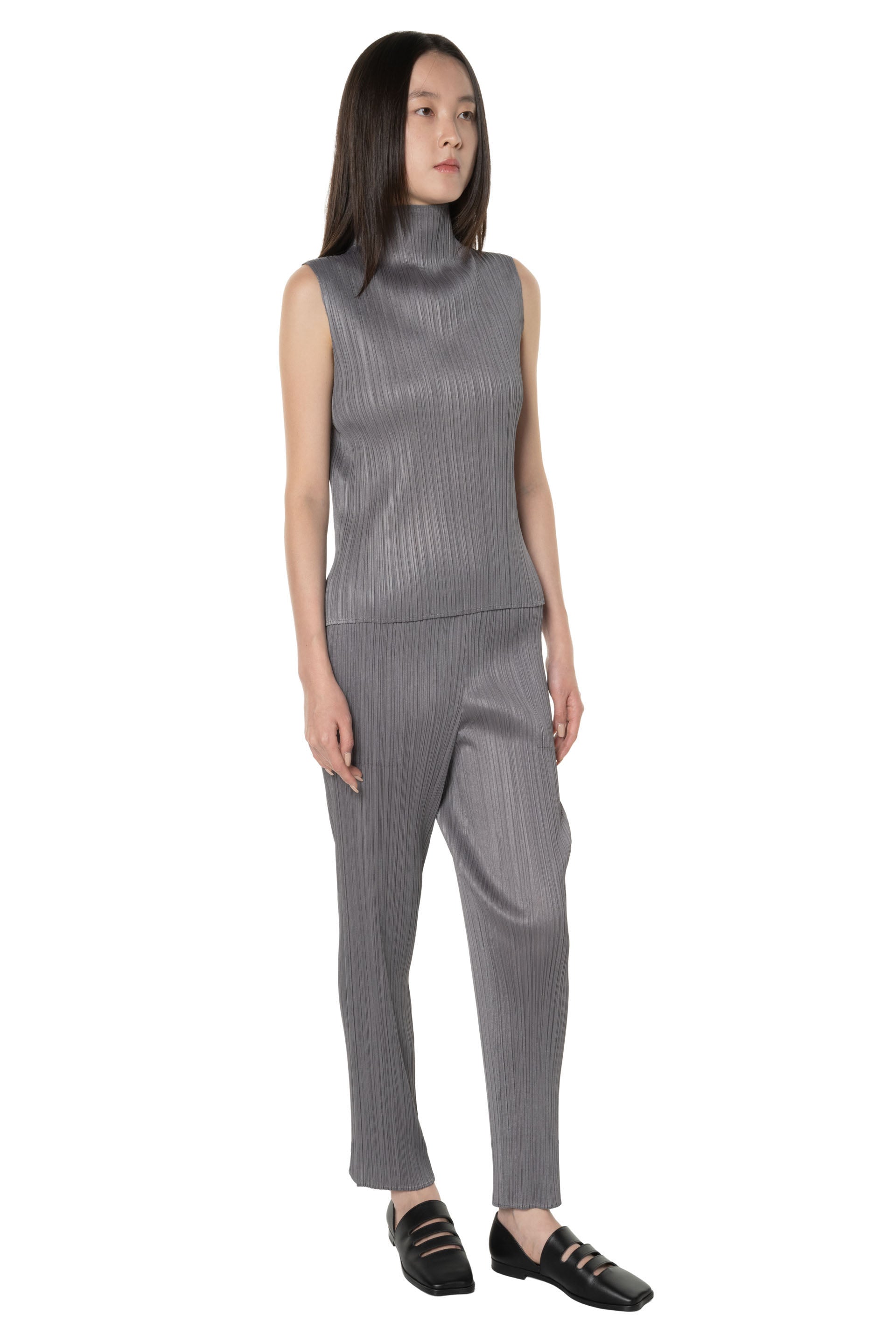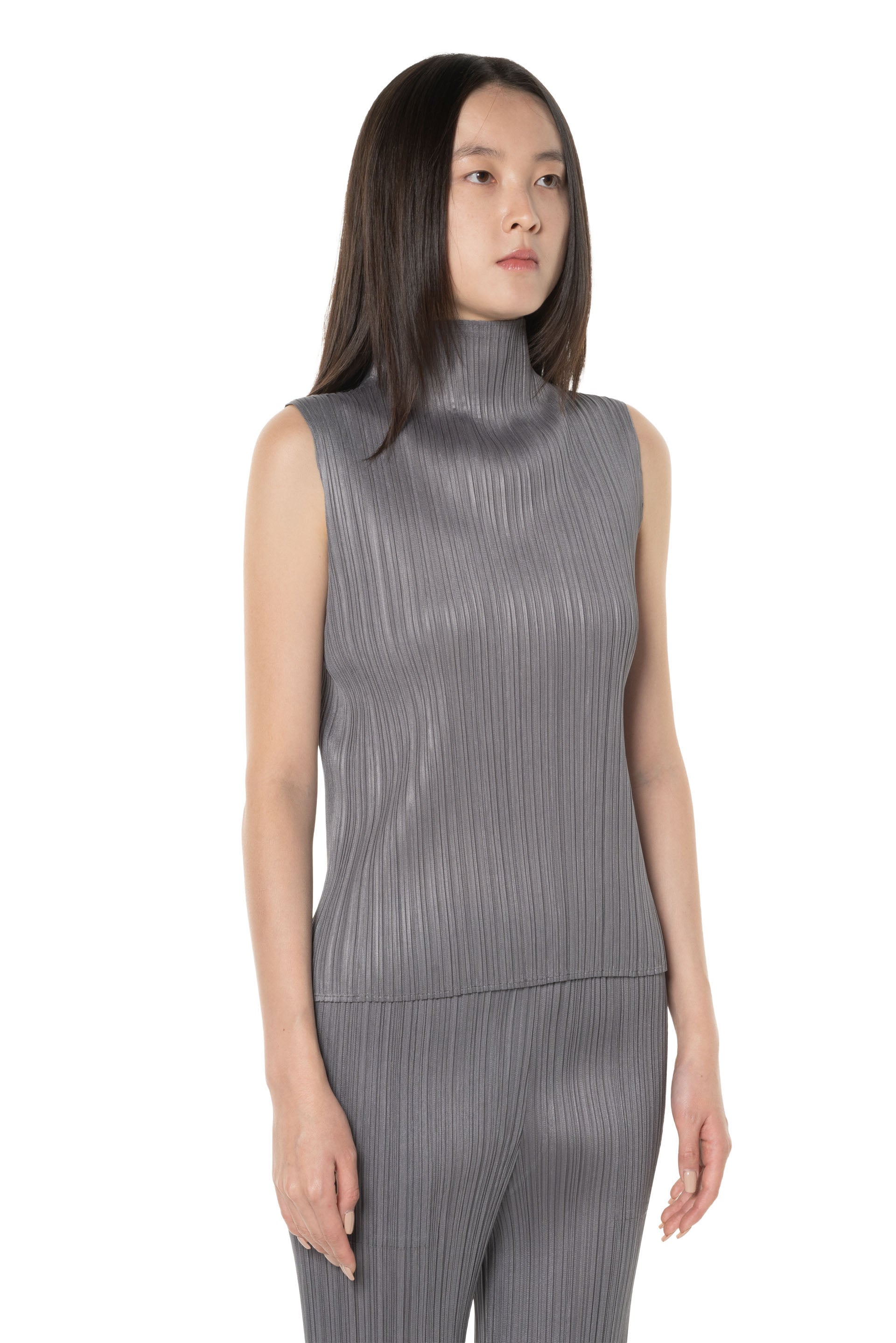 Pleats Please Grey sleeveless pleated top has a wide mock neckline. BASICS is a seasonless series that offers in a range of versatile, simple styles in neutral colours.