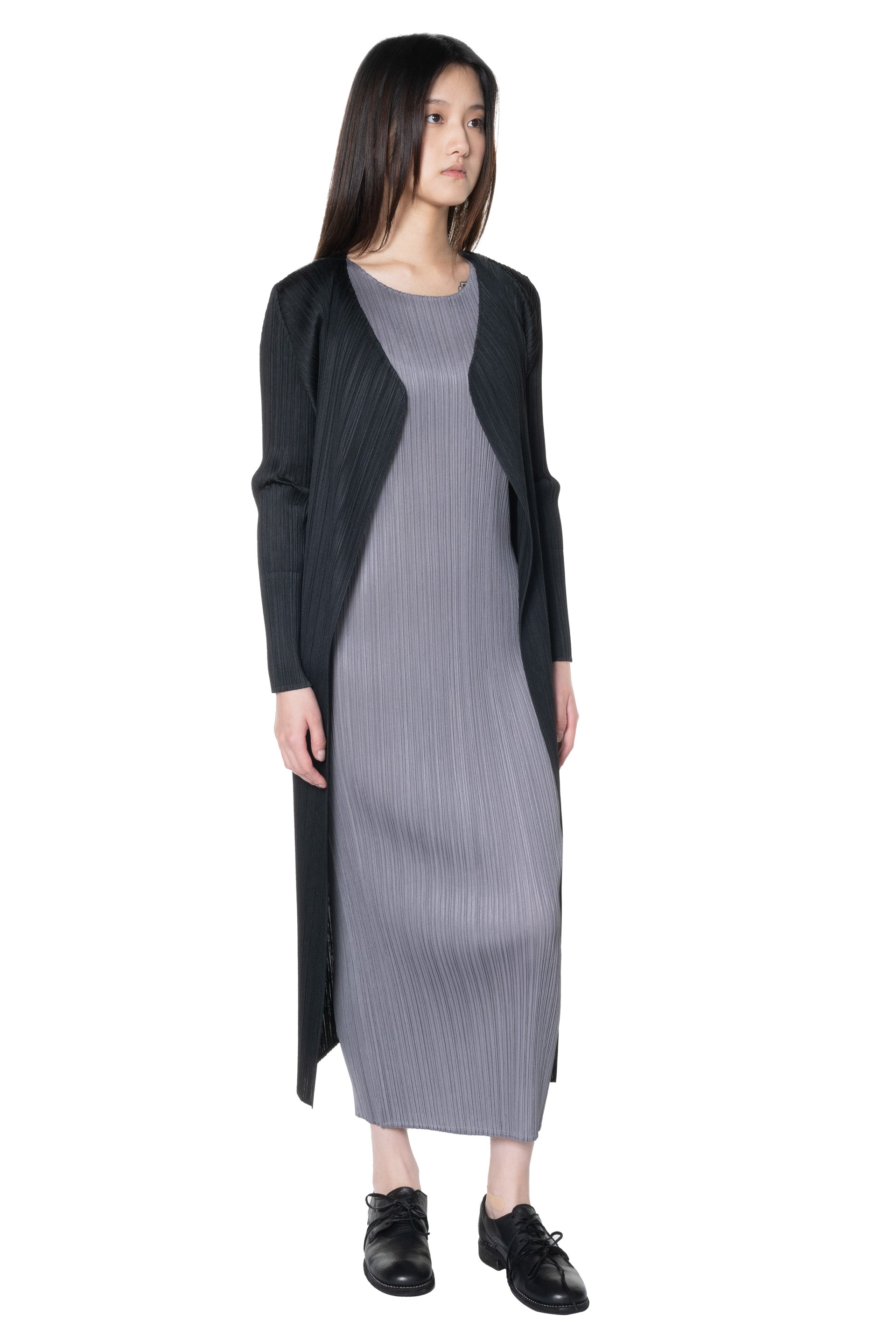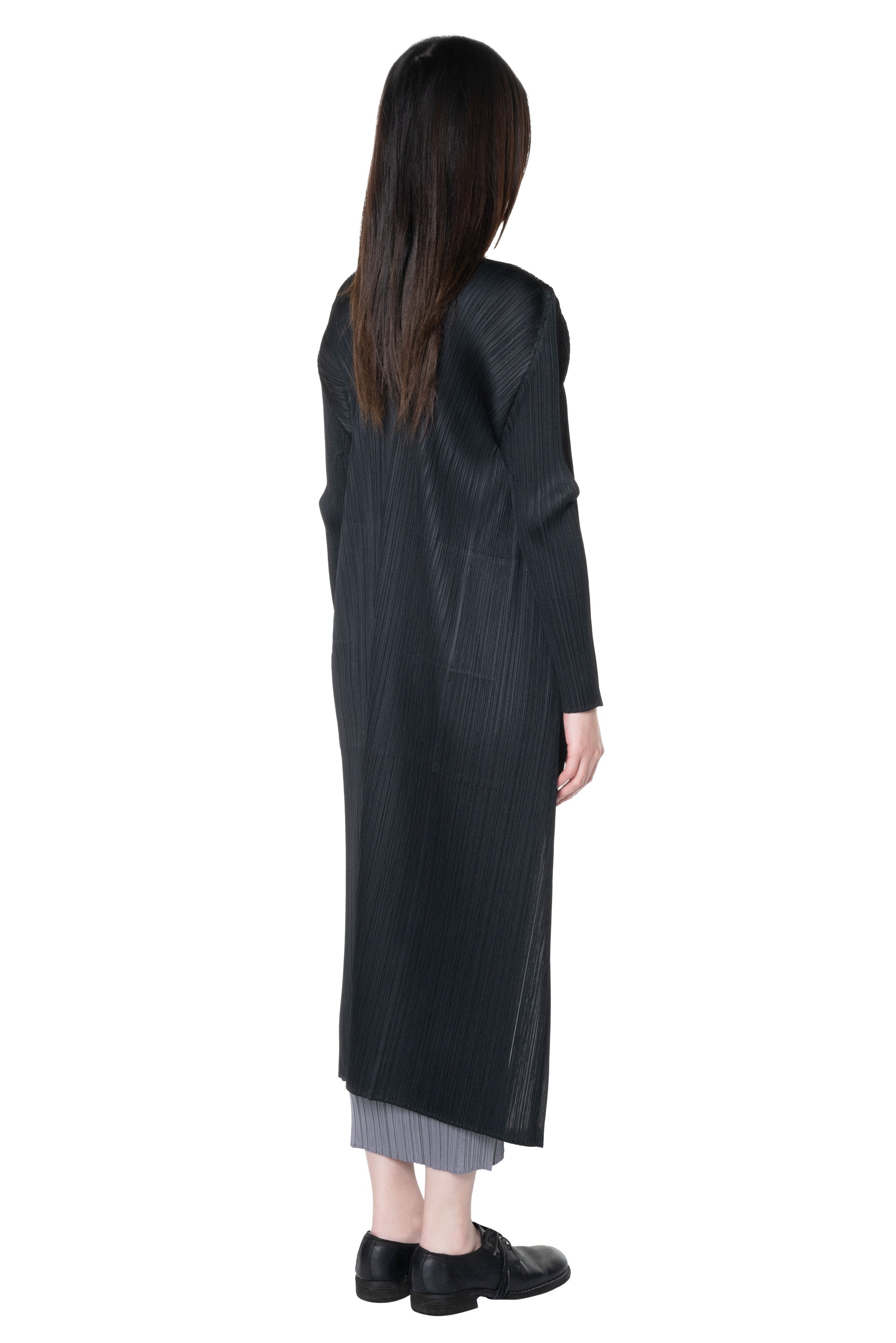 Pleats Please is crafted from a single thread, then creases are added after the clothes have been sewn into shape offering a combination of convenience, comfort and coolness. Pleats Please designs are simple with a strong silhouette as seen with the Basics Long Coat Black.