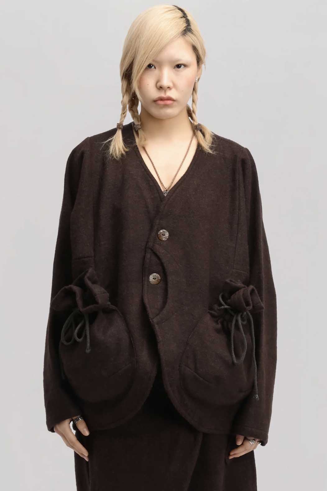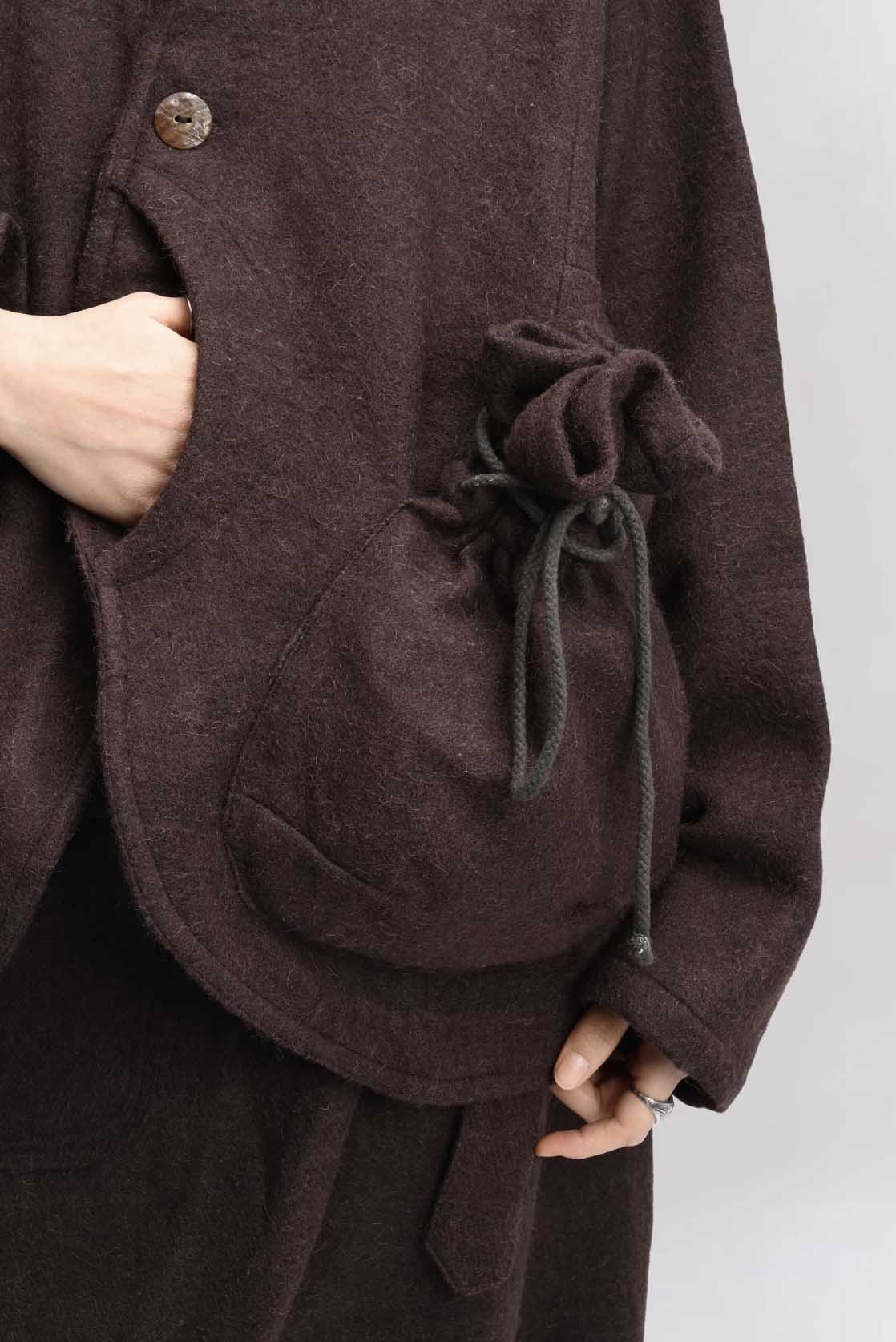 Crafted from handwoven, hand-felted yak and sheep wool in a rich brown tone. With fabric sourced and developed across the Tibetan Plateau, each jacket is finished with two large natural shell buttons with green and brown tones, each unique.