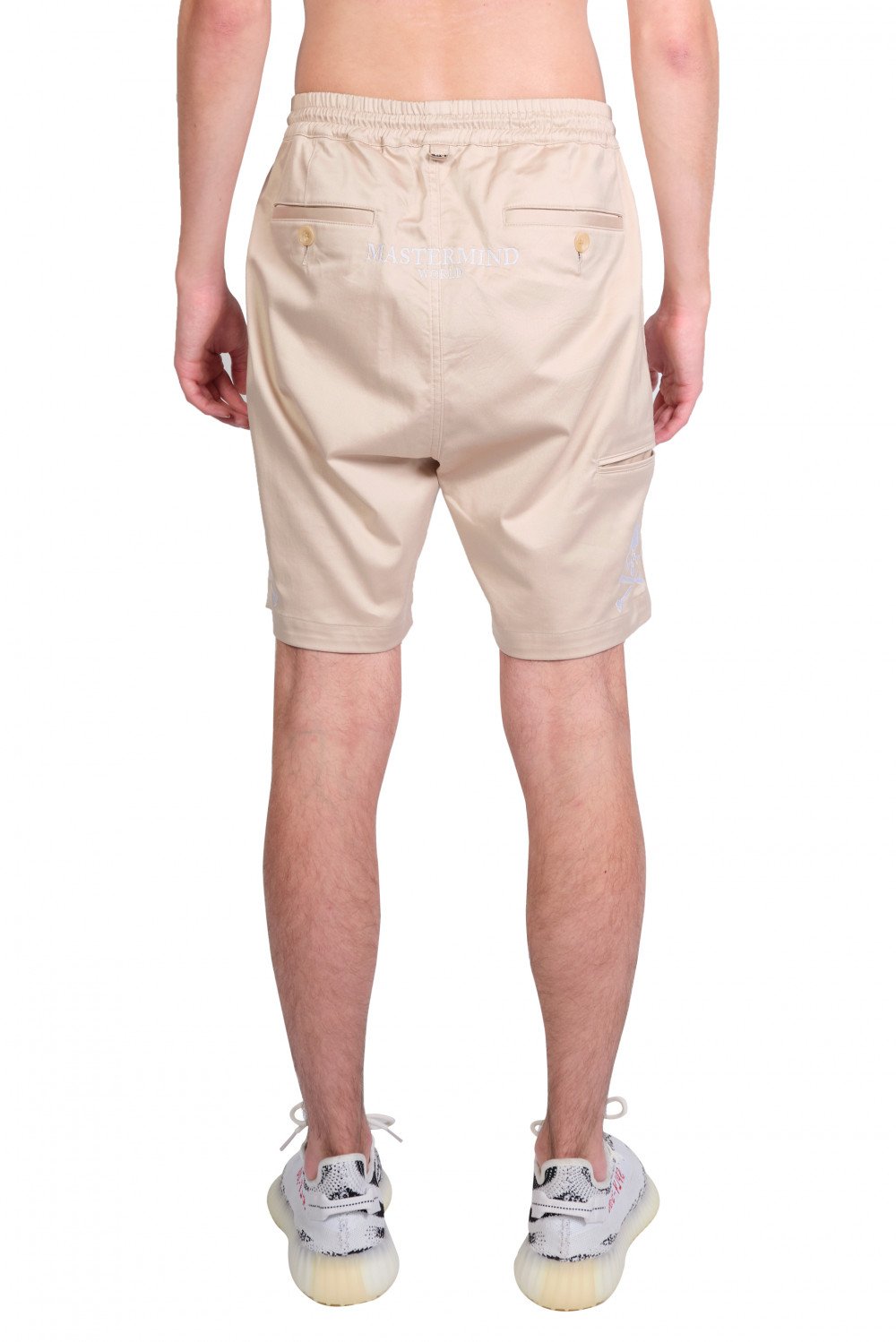 Elasticised waistband with drawstring. Two slit-in pockets at sides. Buttoned welt pockets at back. Additional pocket on side with embroidered skull and crossbones. Embroidered Mastermind text on back. Metallic D-ring