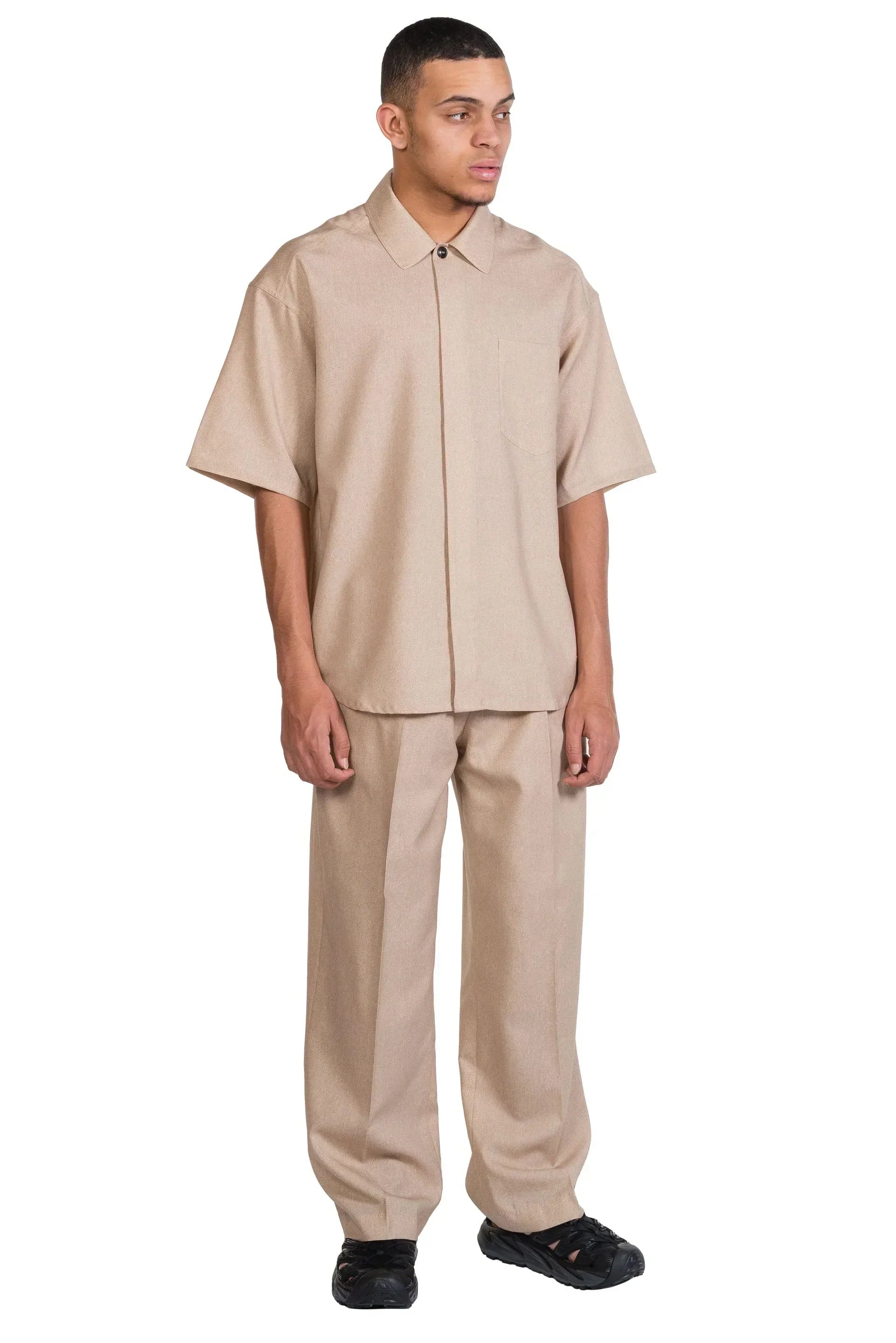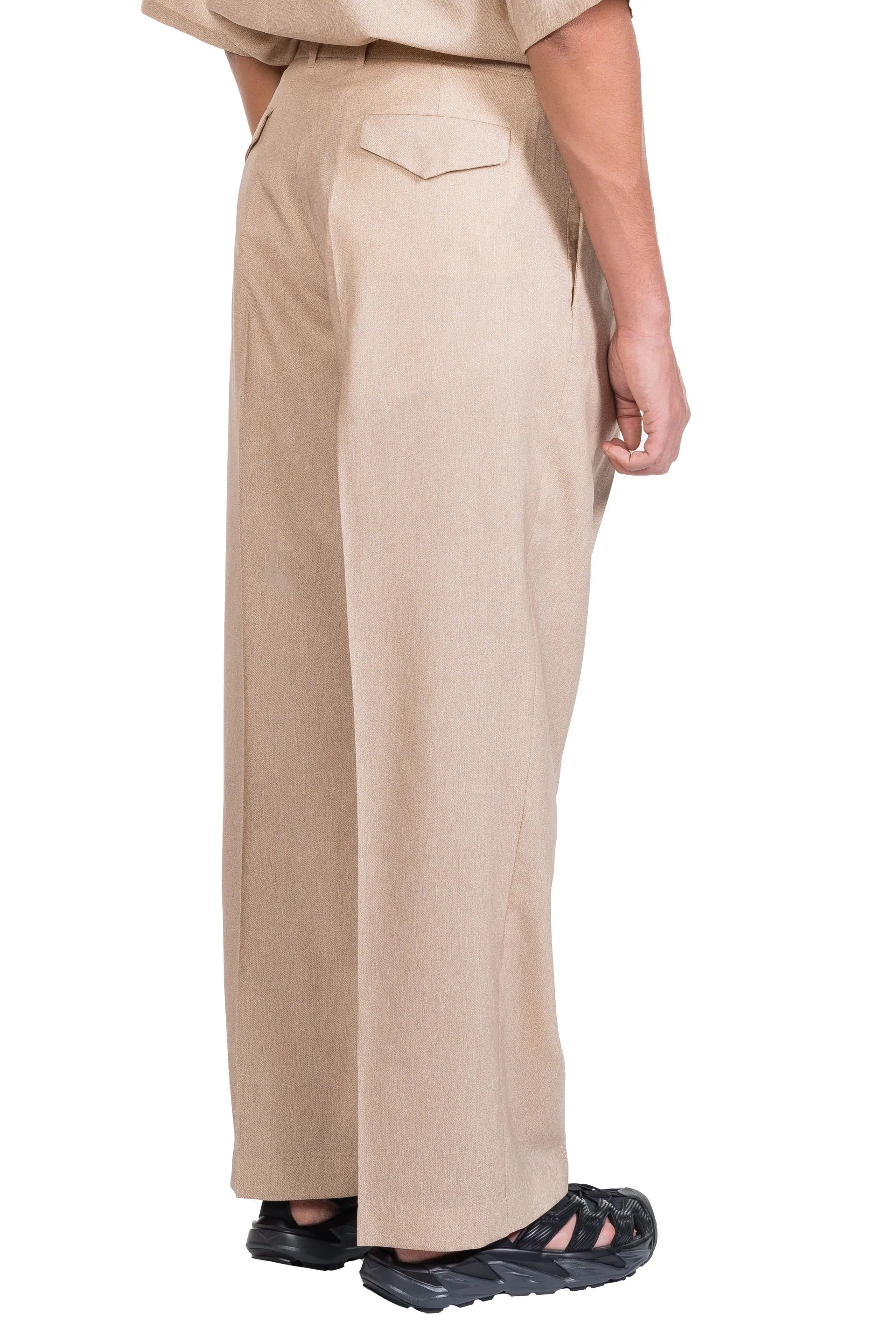 Beige Printed Wool Long Wide Pants. Mid-rise. Pleated front. Horn buttons. Wide leg pants. Loose fit.