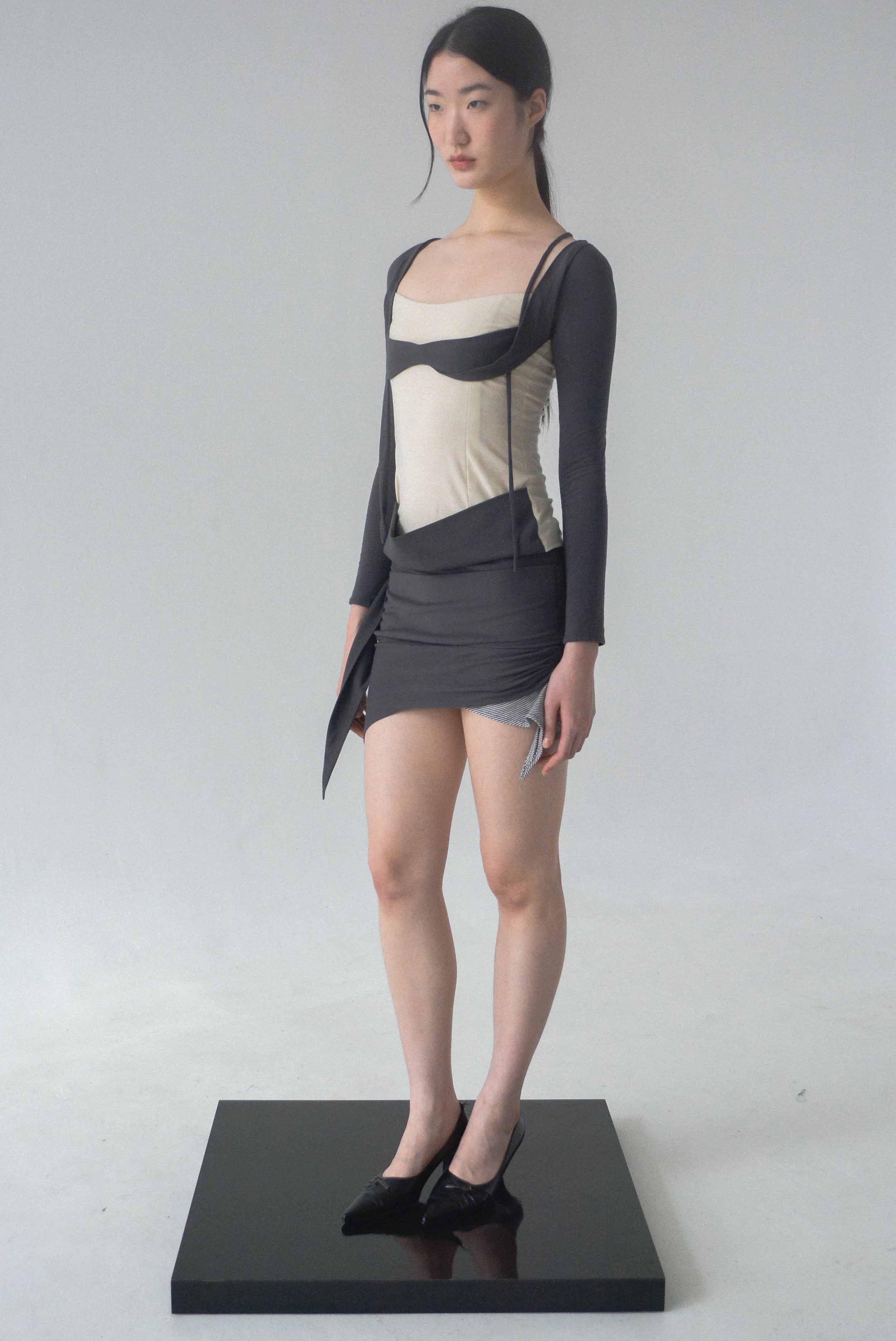 Caro Chia continuously explores intriguing forms that are then brought to life through innovative shapes and pattern cutting techniques. Caro Chia is known for her experimental construction combined with making textiles engineered to form sculptural embellishments in subtle colour ways as seen with the Bianco Long Sleeves Grey Top.