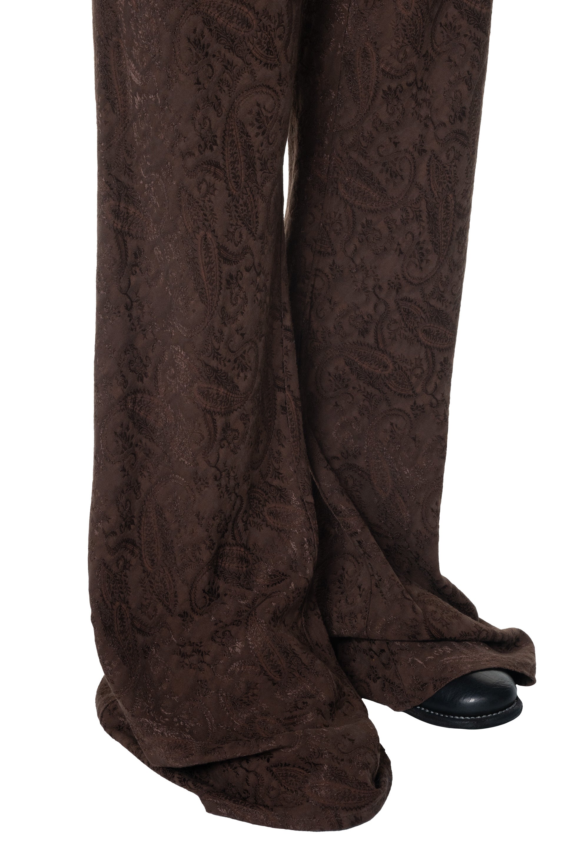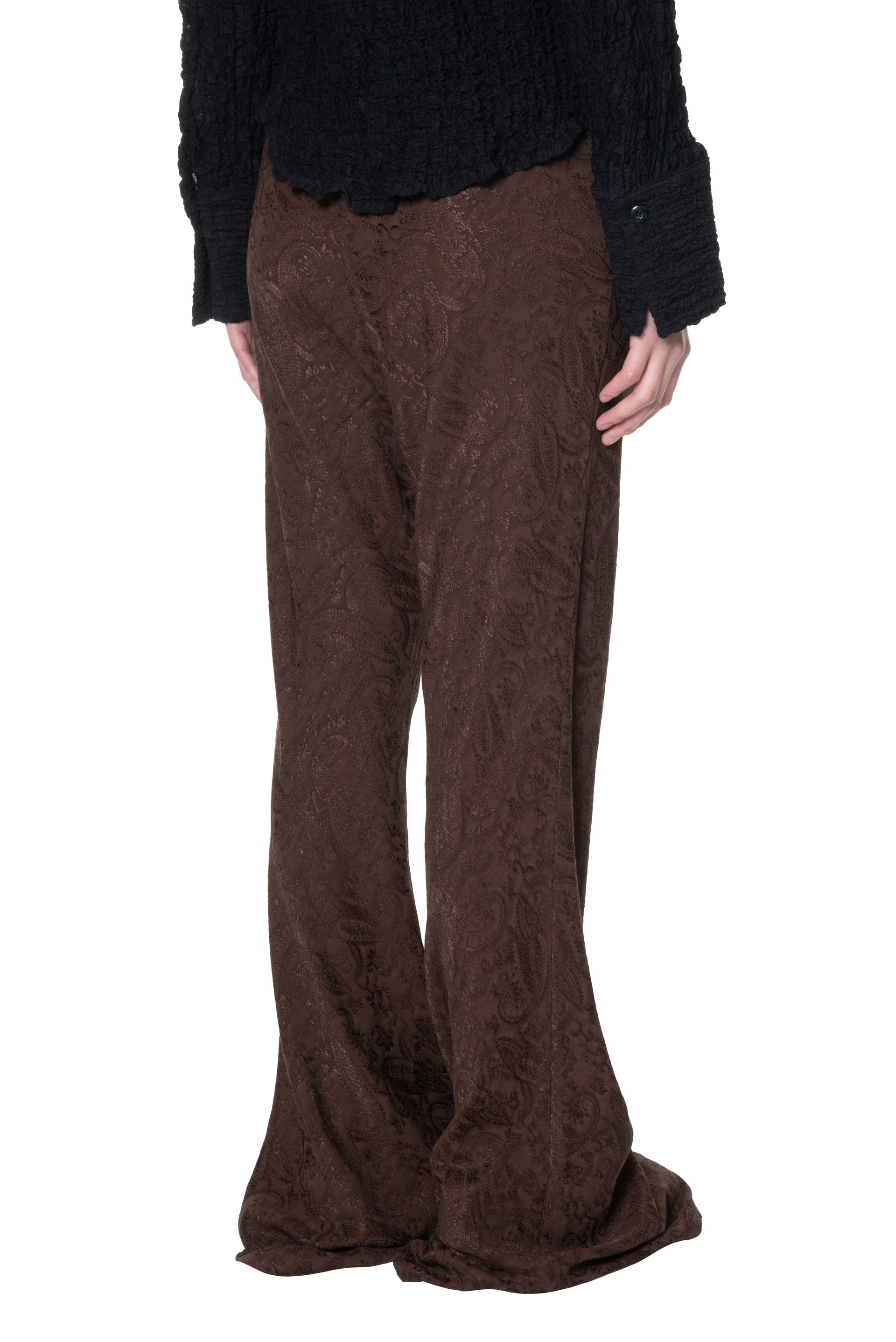 Song for the Mute Bell bottom flared trouser in a fluid paisley rayon. Featuring elongated drawstrings.