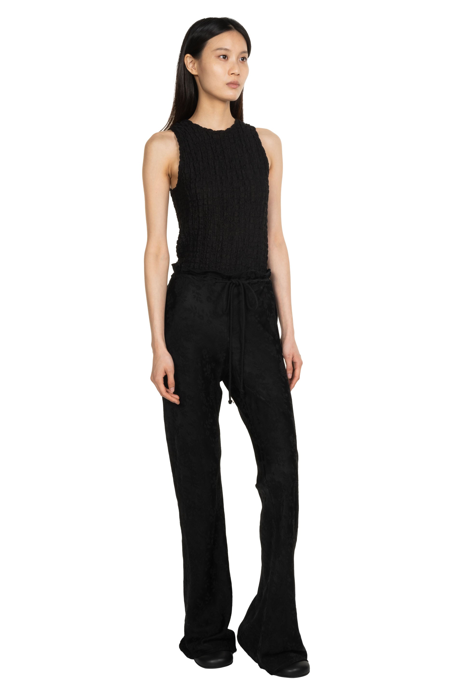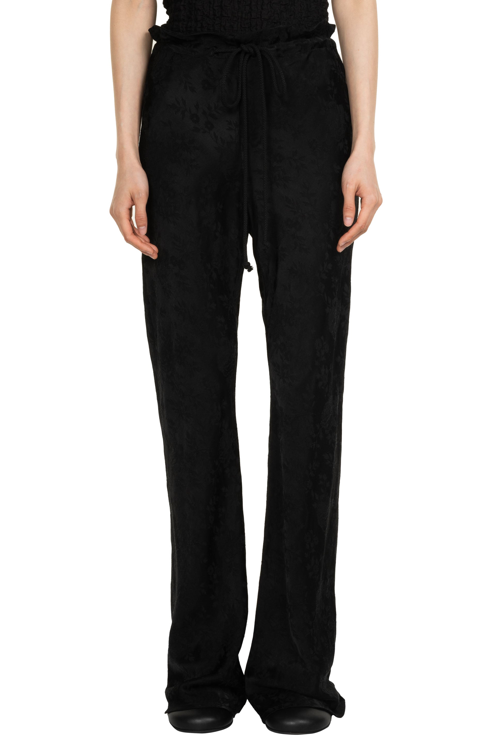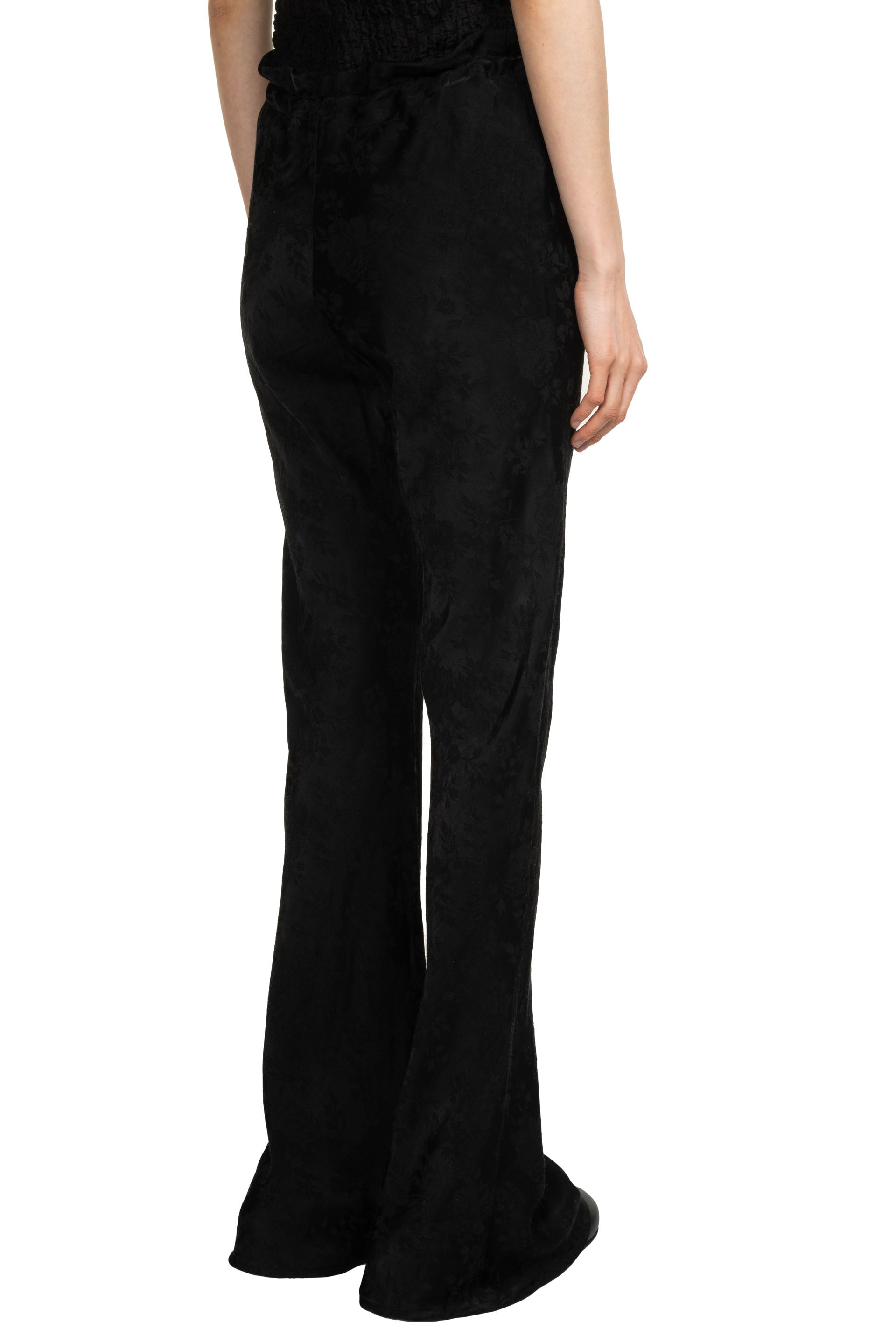 Song for the Mute Bias cut pant in a floral jacquard rayon linen blend. Featuring elongated drawstrings and flared bell bottom hem.