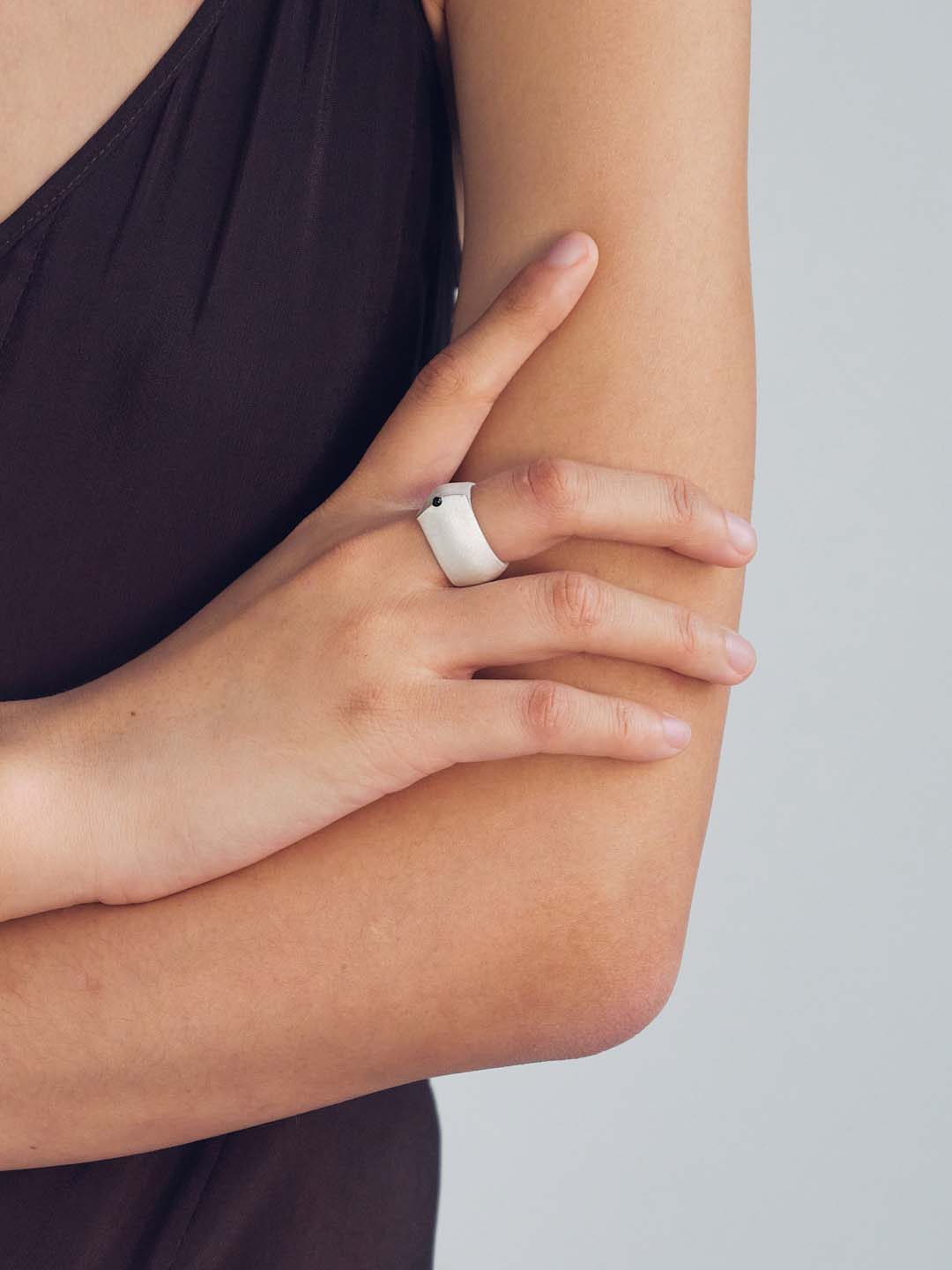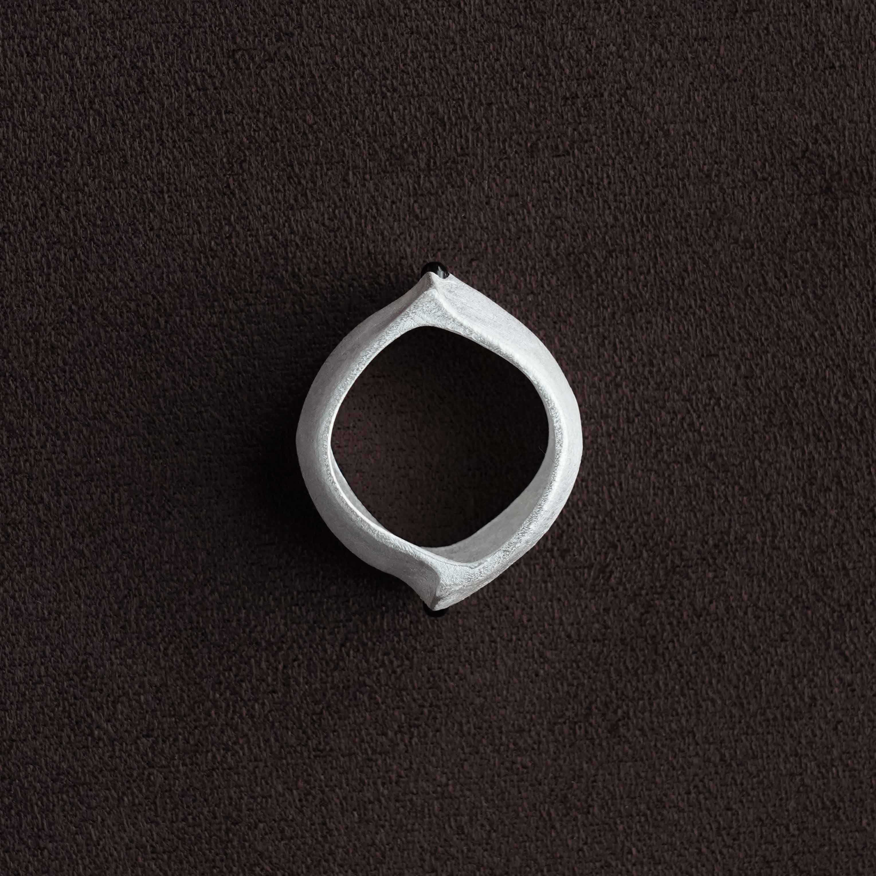 OLIO E ACETO is raw and authentic. It is about the companionship between people, and objects like the matte white surface becoming a blank canvas to be filled by the wearer as seen with the Black Agate Spire Wide Ring.