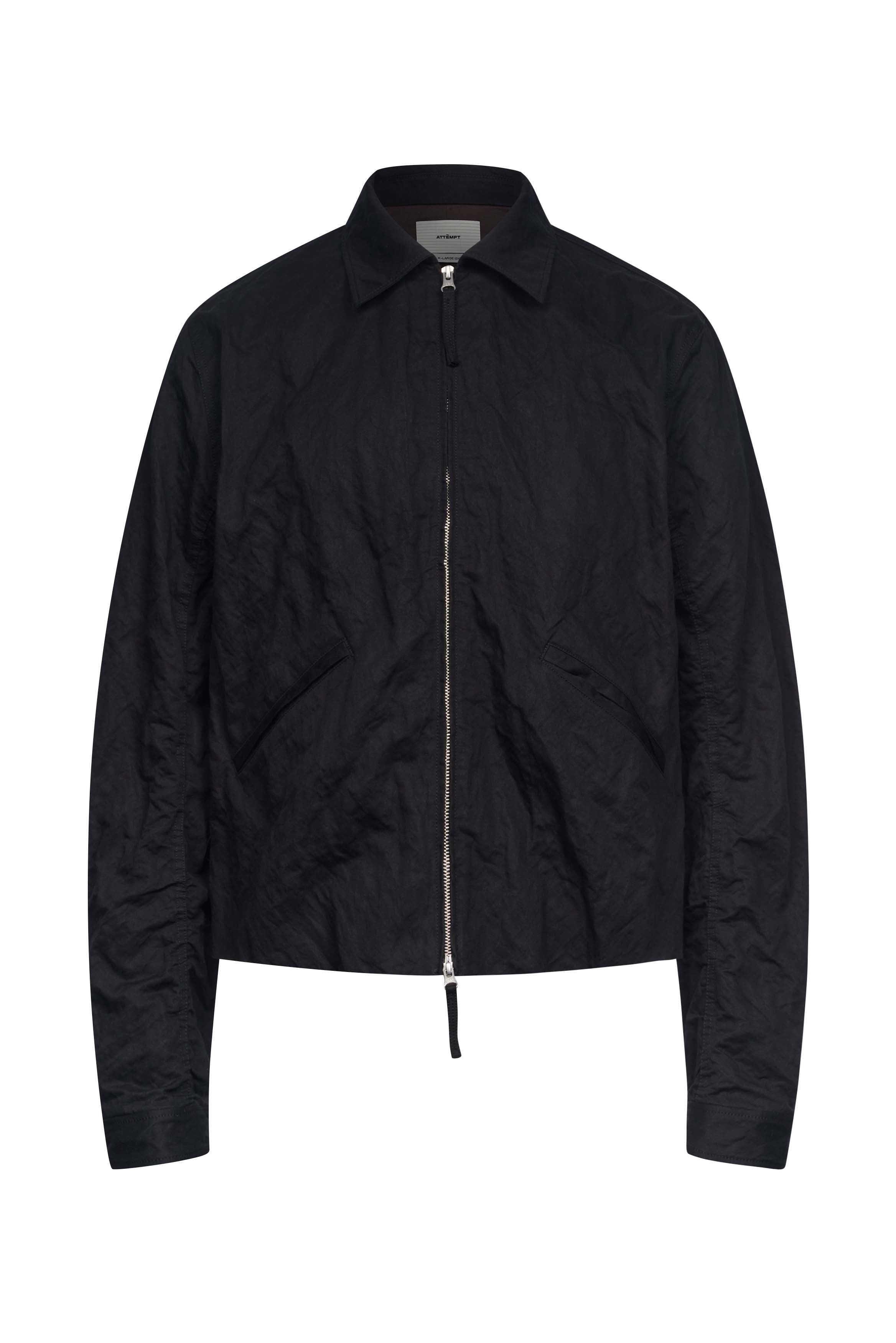 Front zip closure. Double zip. Two side pocket. Small collar. Boxy cut. Textural creased fabric.