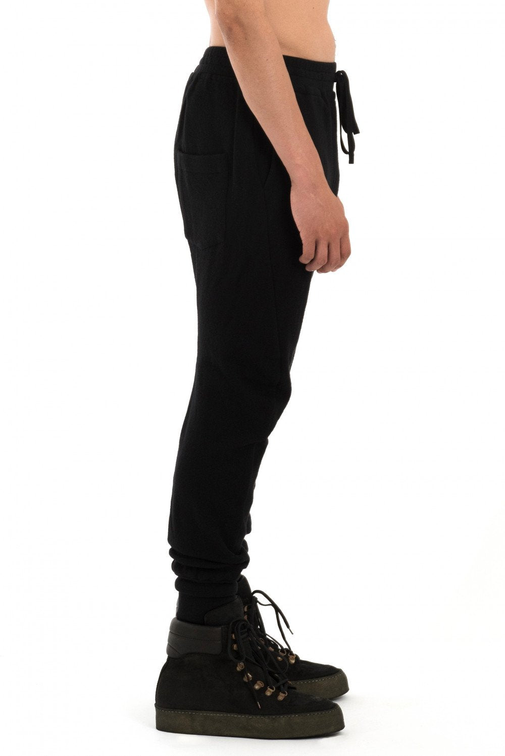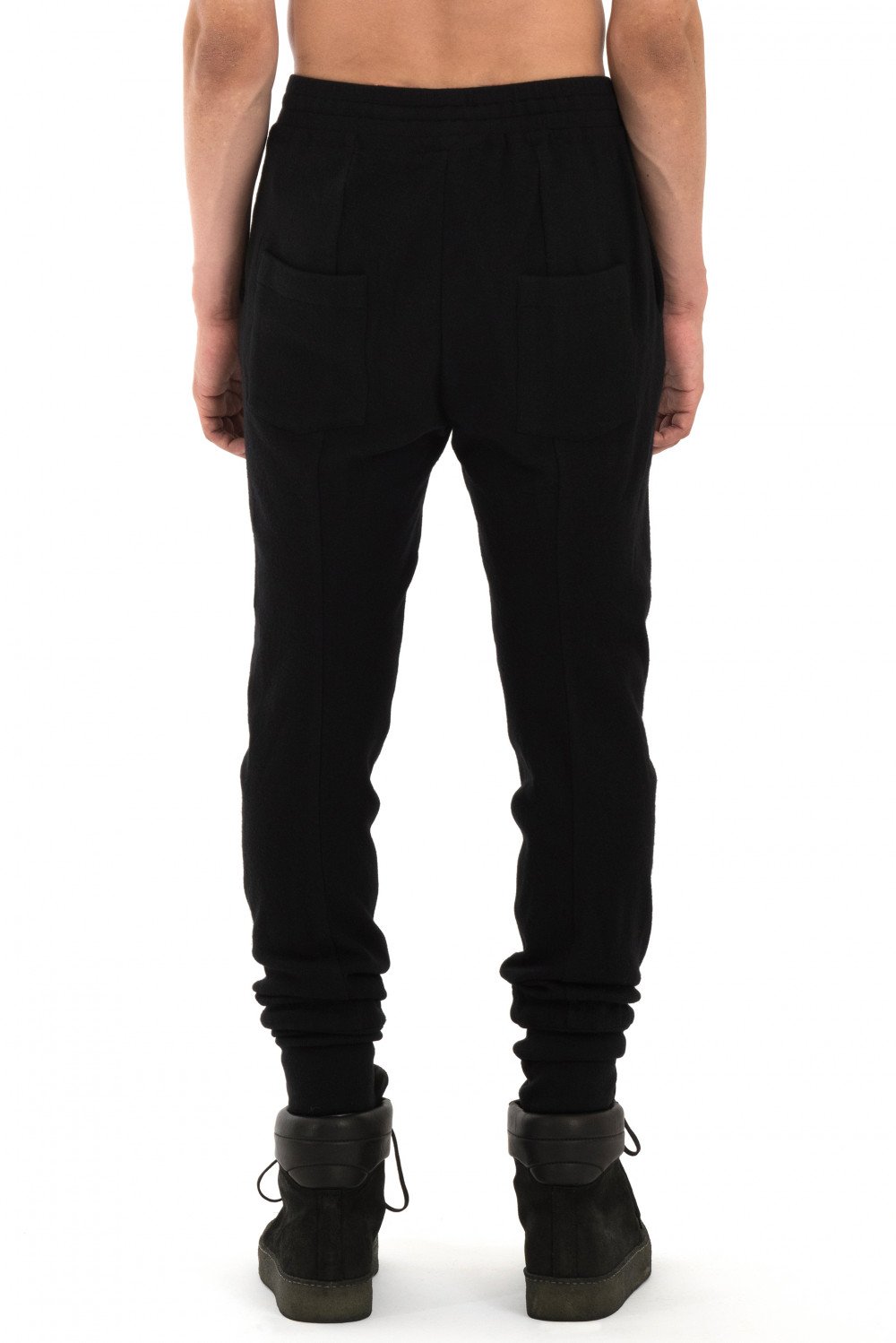 Drawstring waist. Curved leg. Ribbed waistband and hem. Tonal stitching