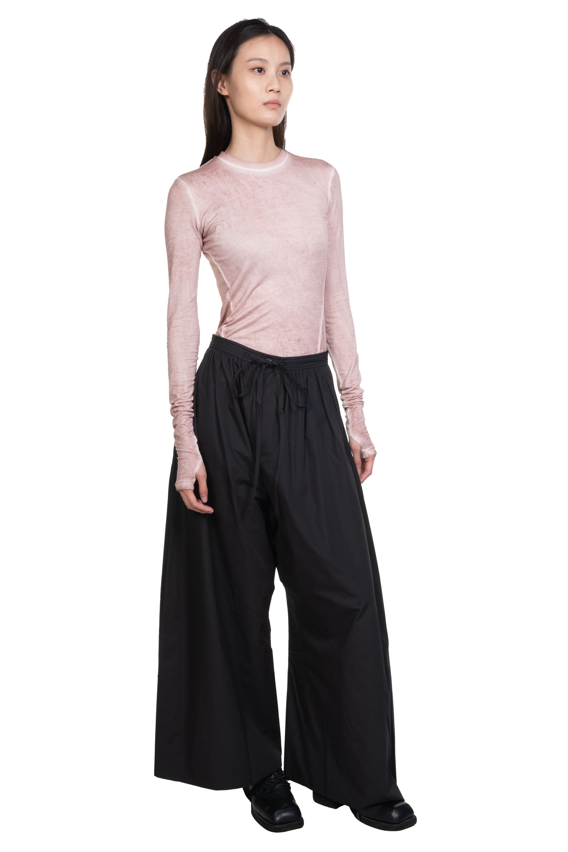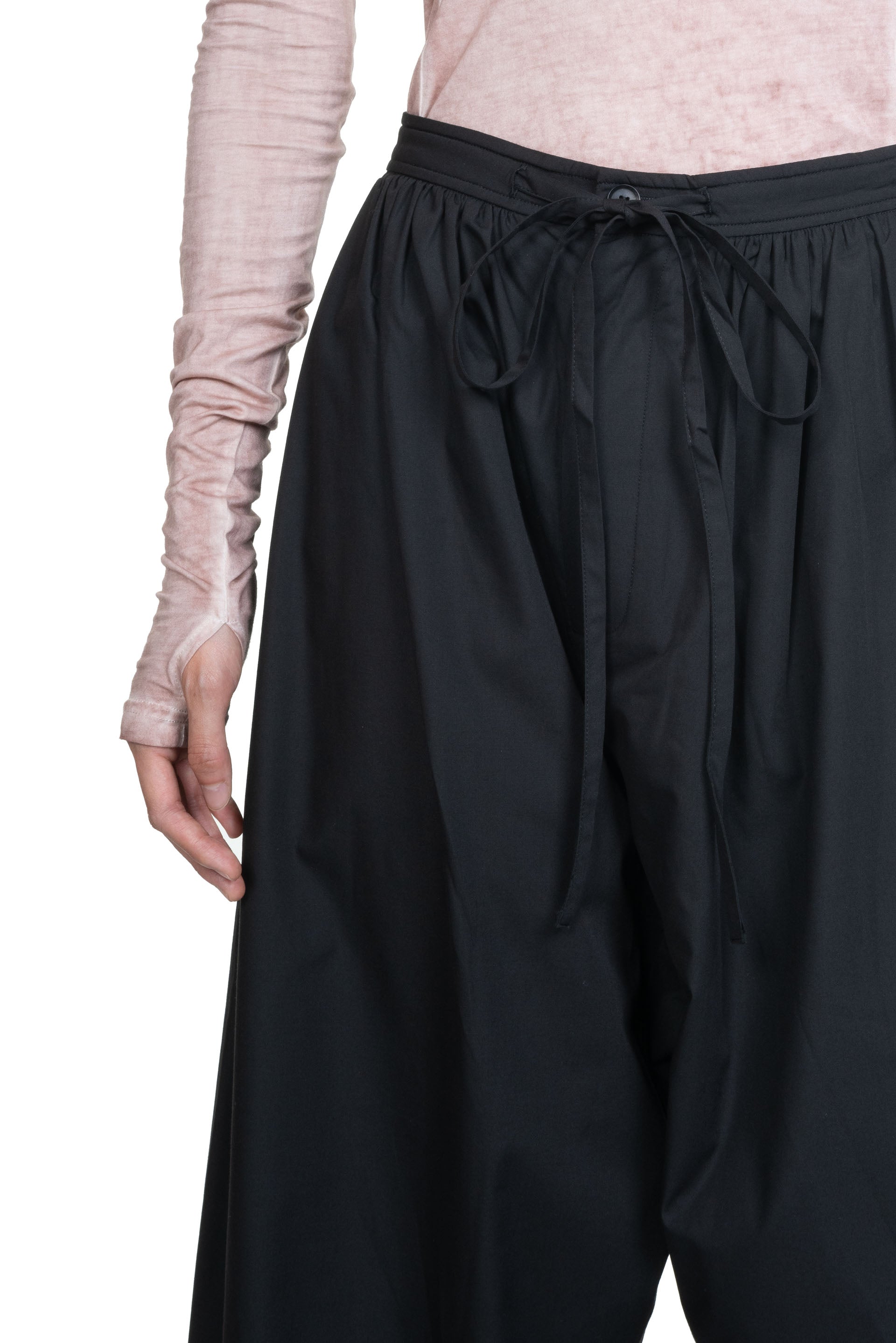 Double Layered Pants in Black from Attempt. Elastic waist. Drawstrings at waist. Two side pockets. Wide leg. Soft and lightweight fabric. Pleated at front.