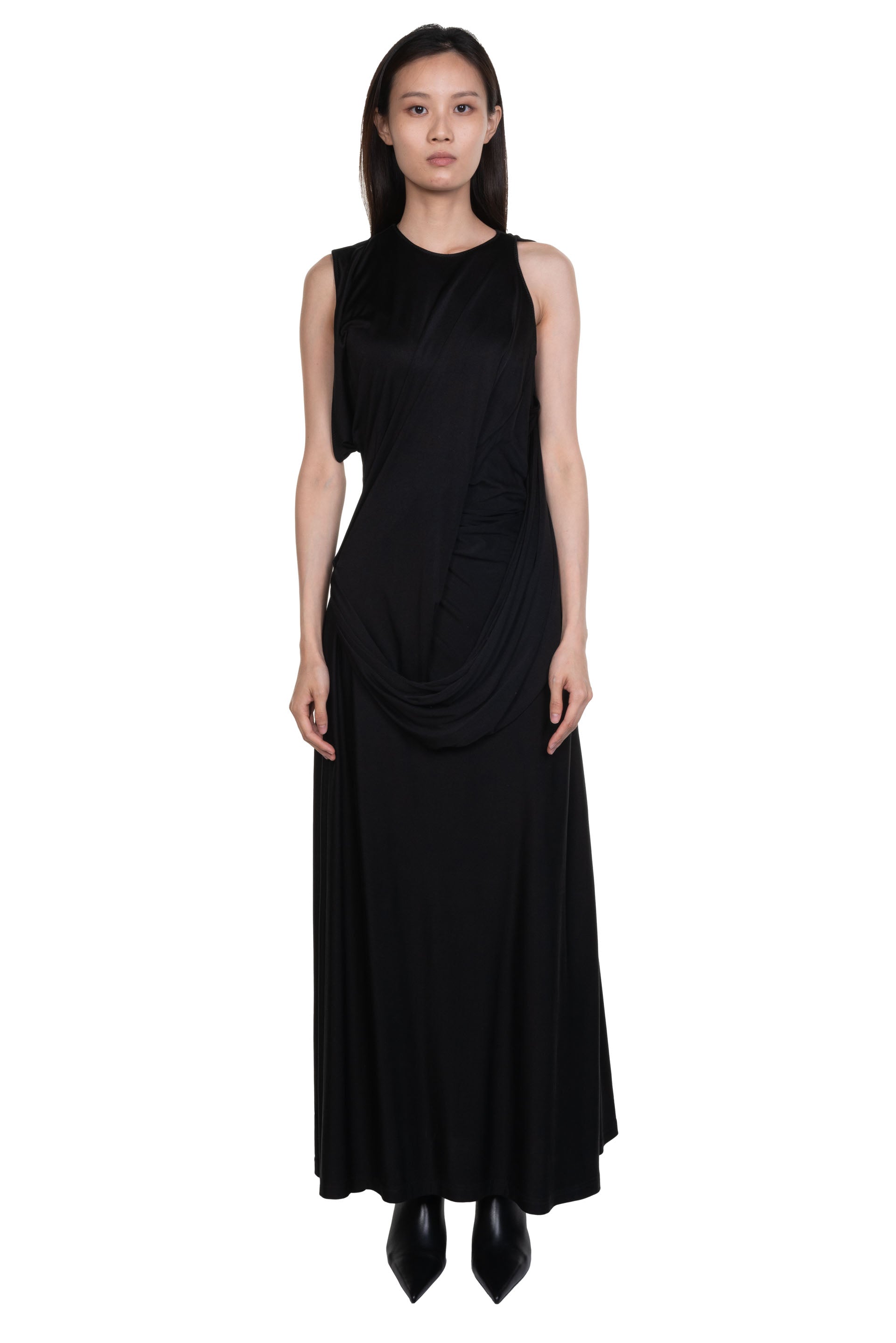 Yehuafan draped dress with details in black. Long sleeves. Soft lightweight silk fabric in black.