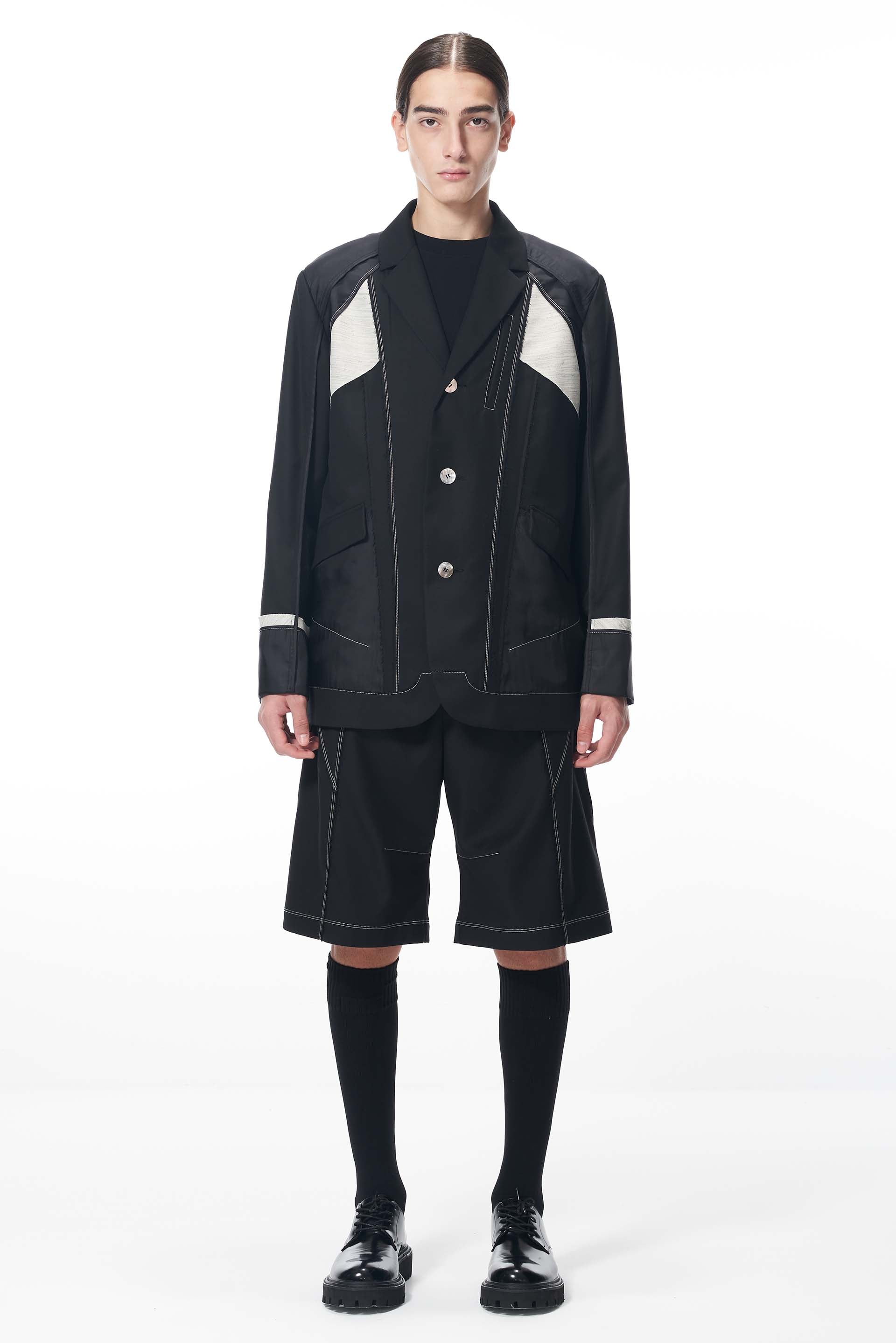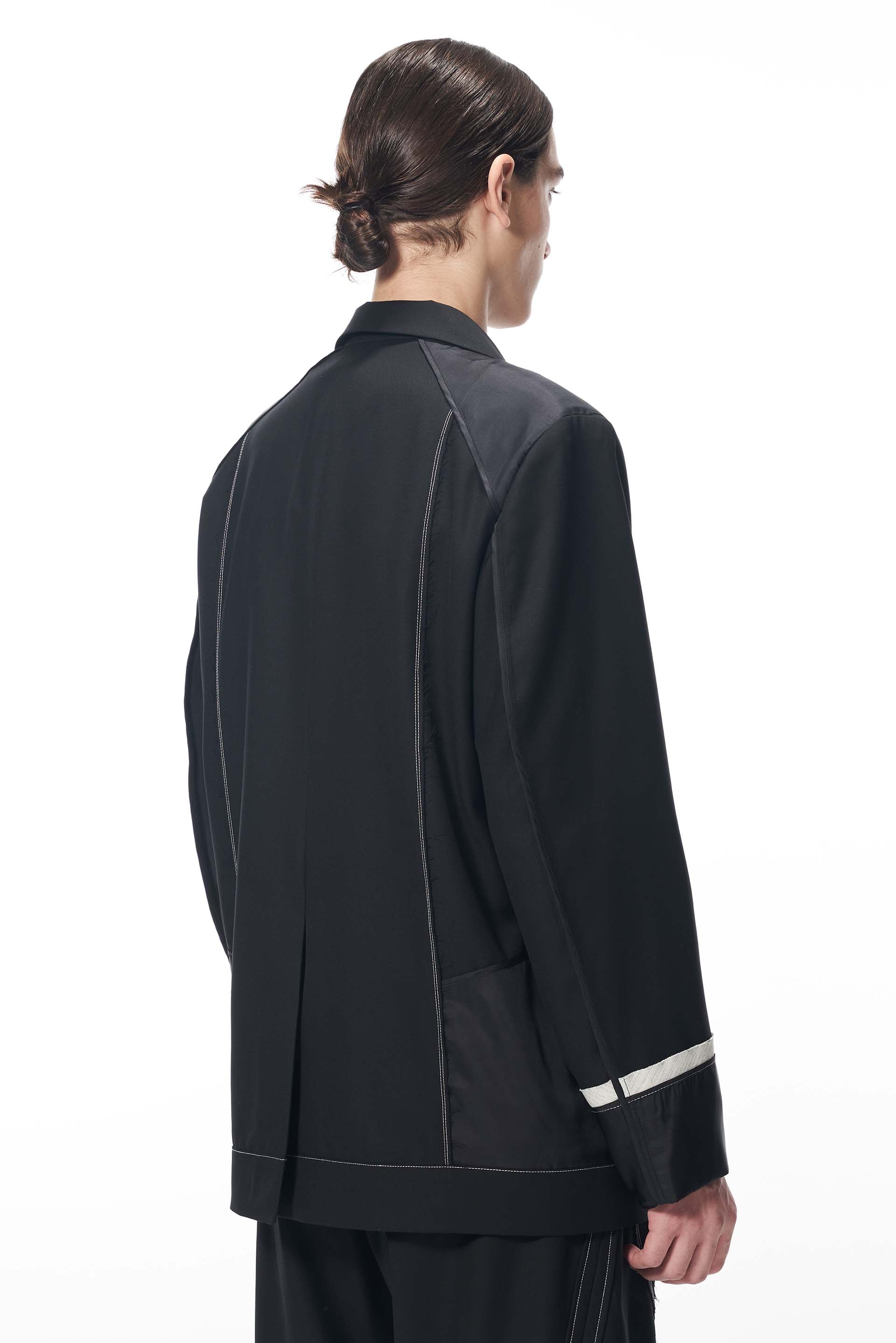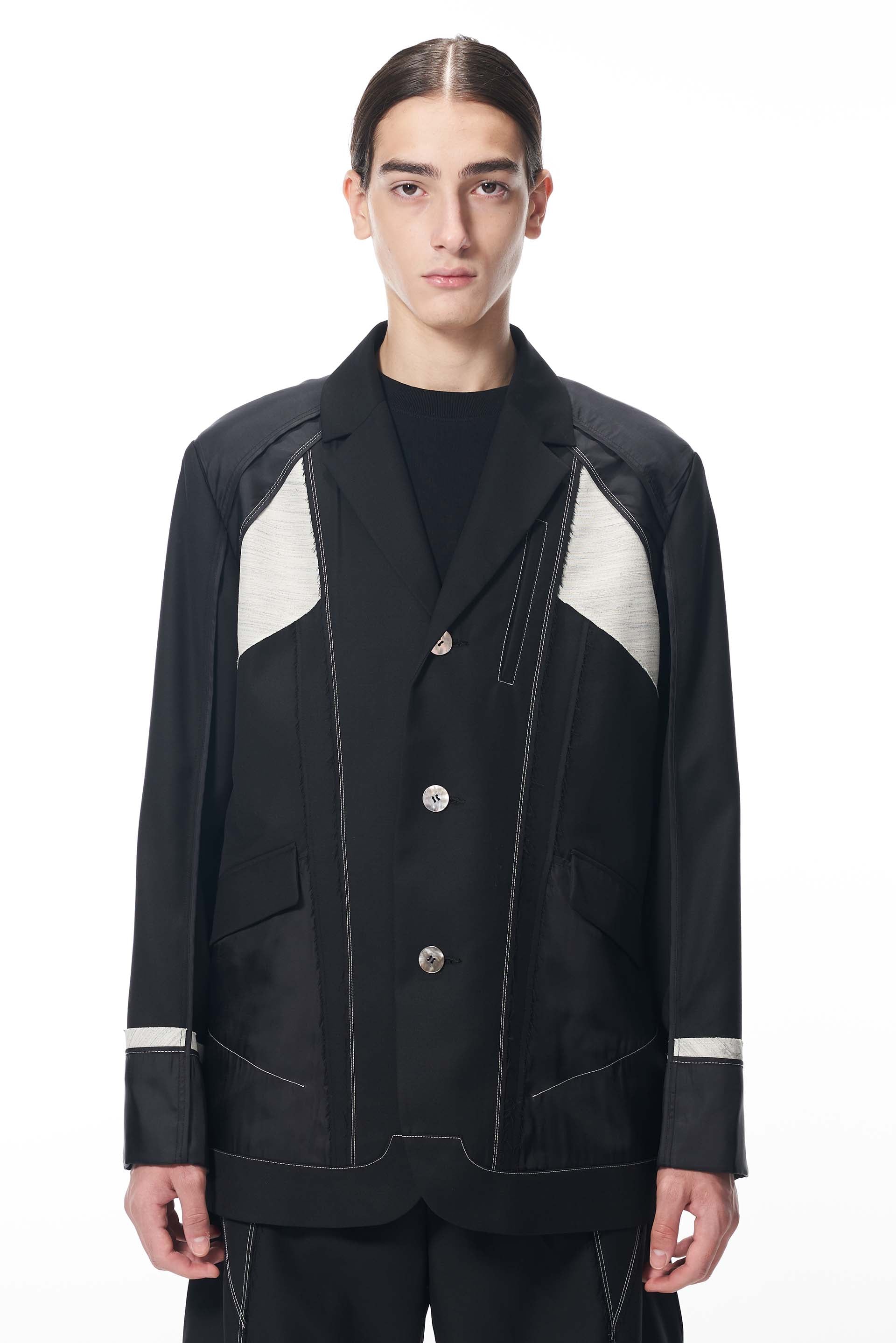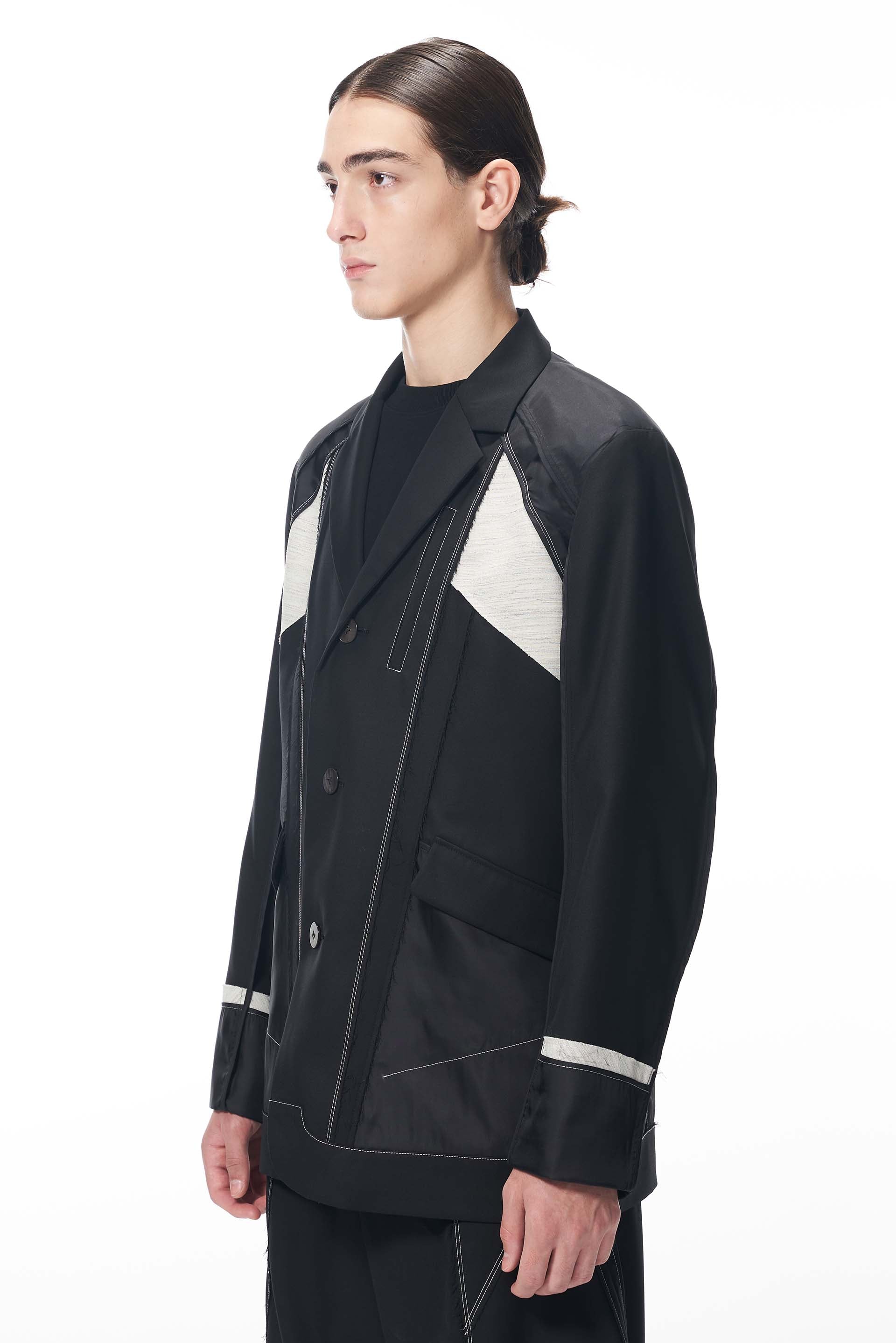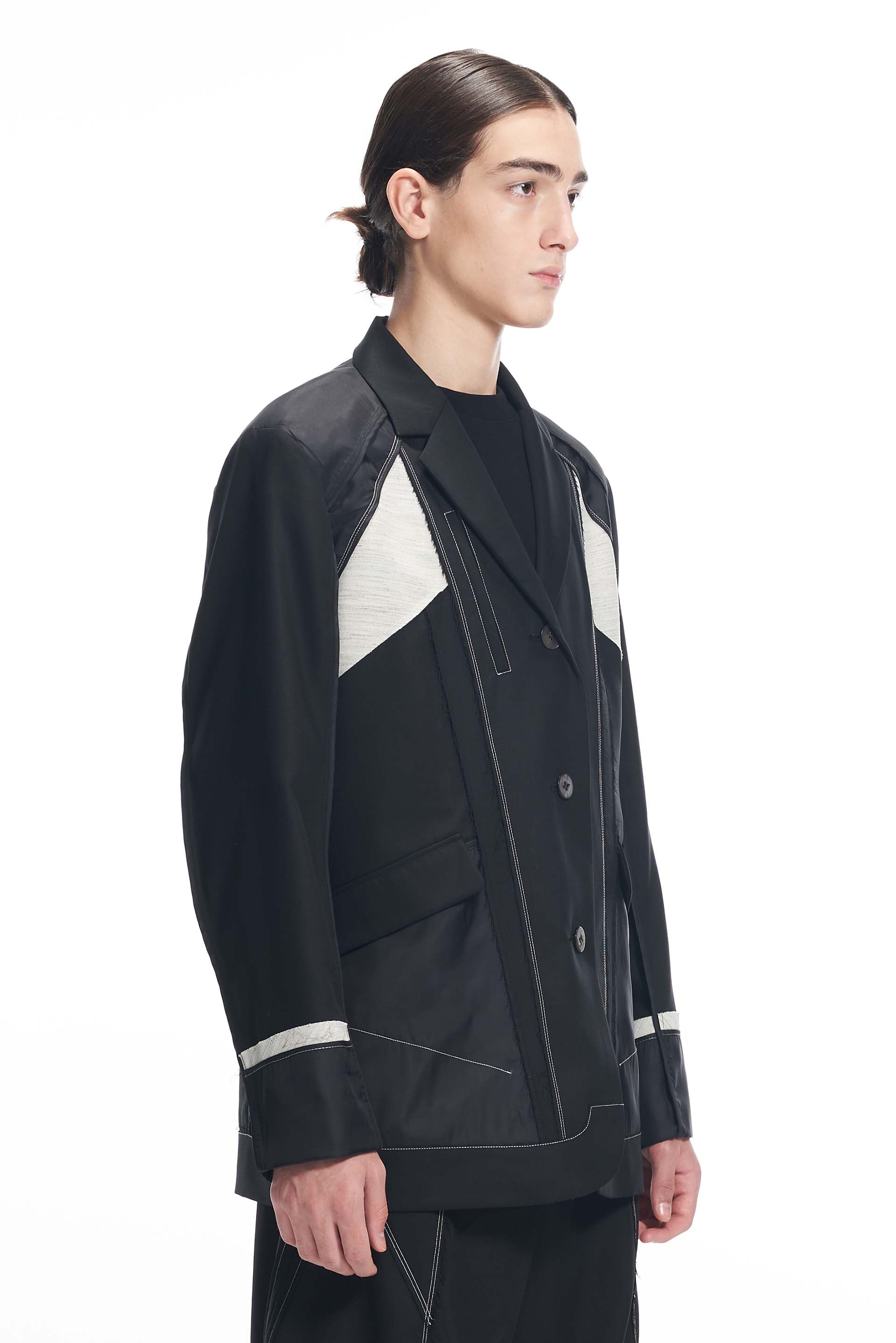 Black External Structured Canvas Blazer.Three button closure with Canvas panelling.