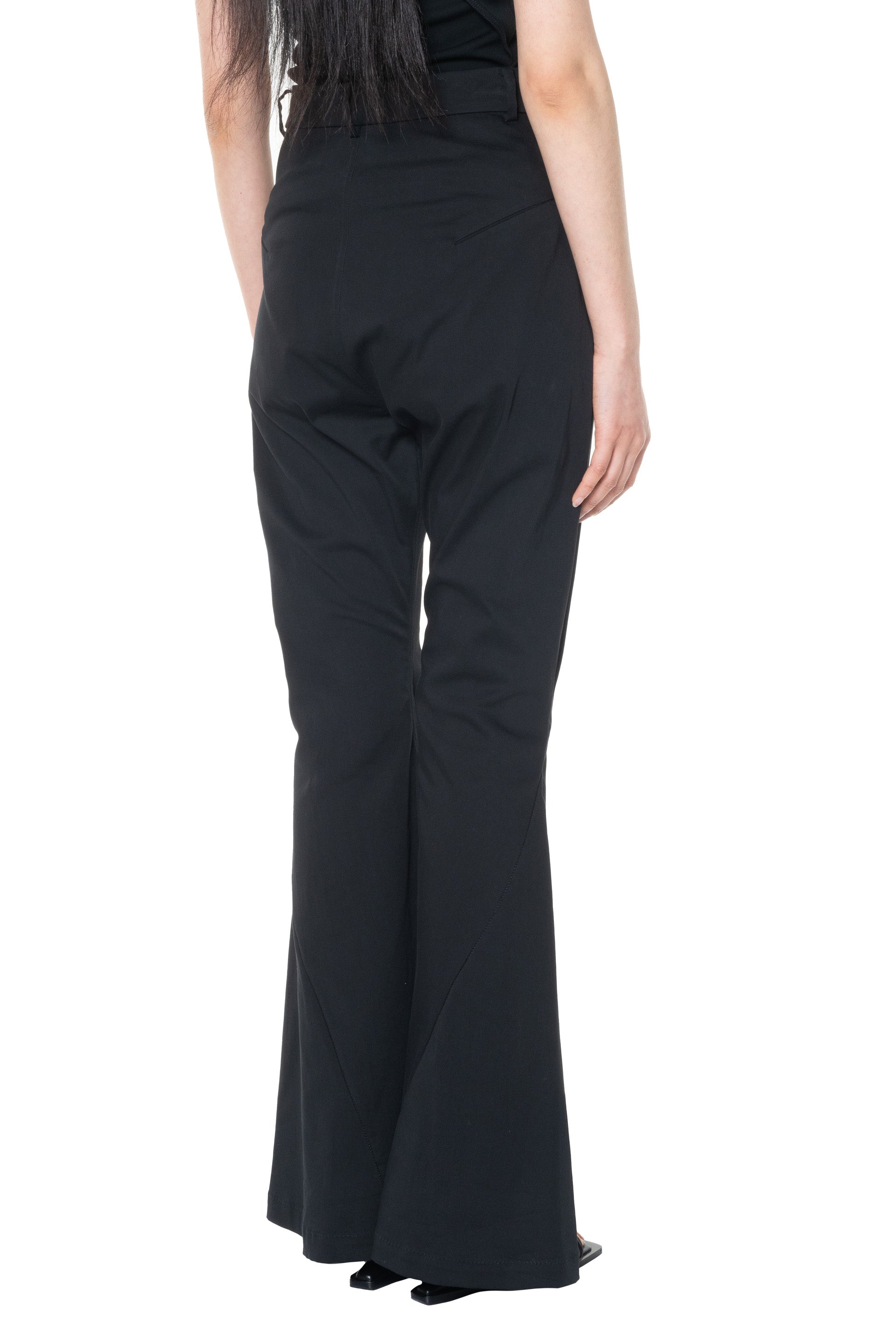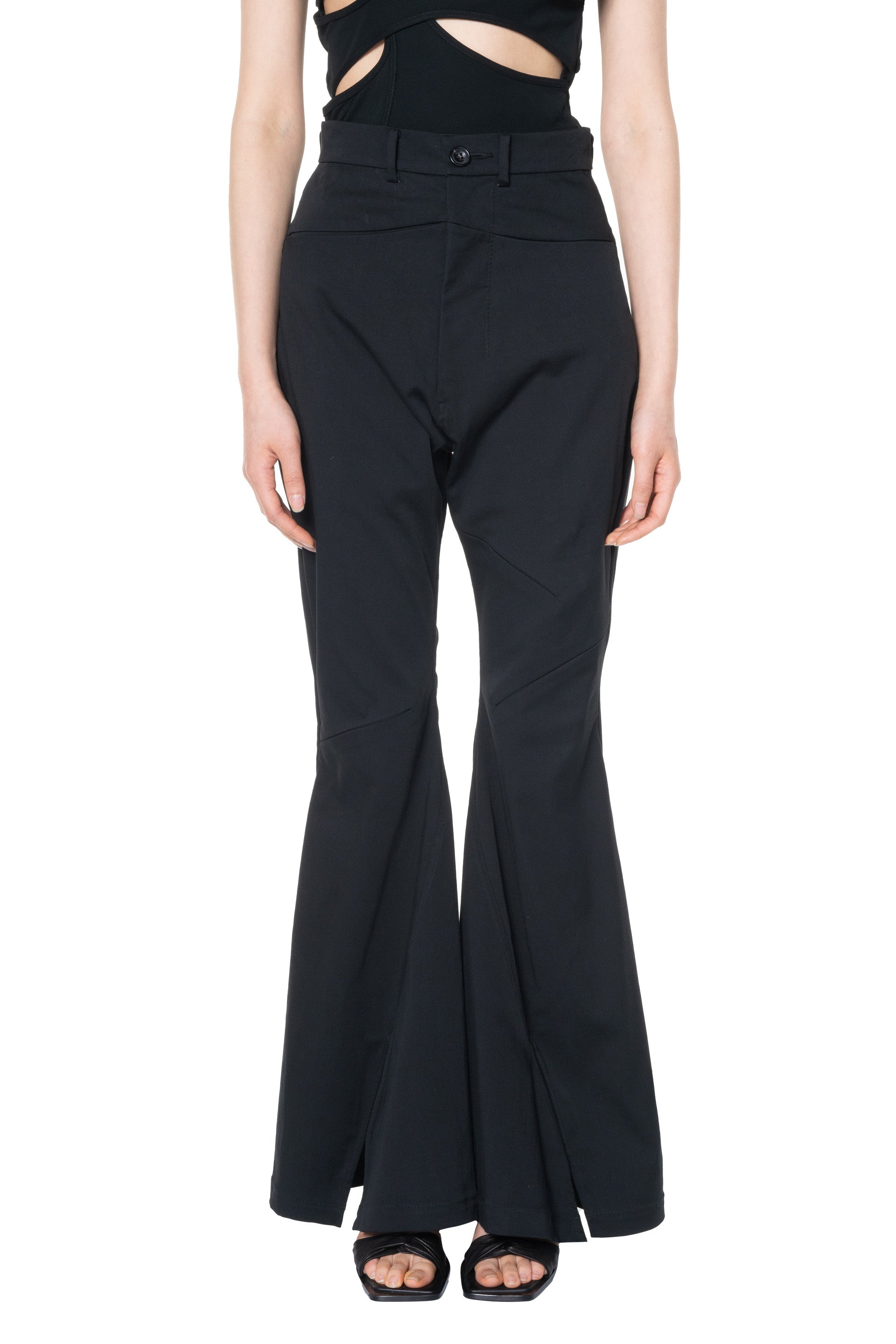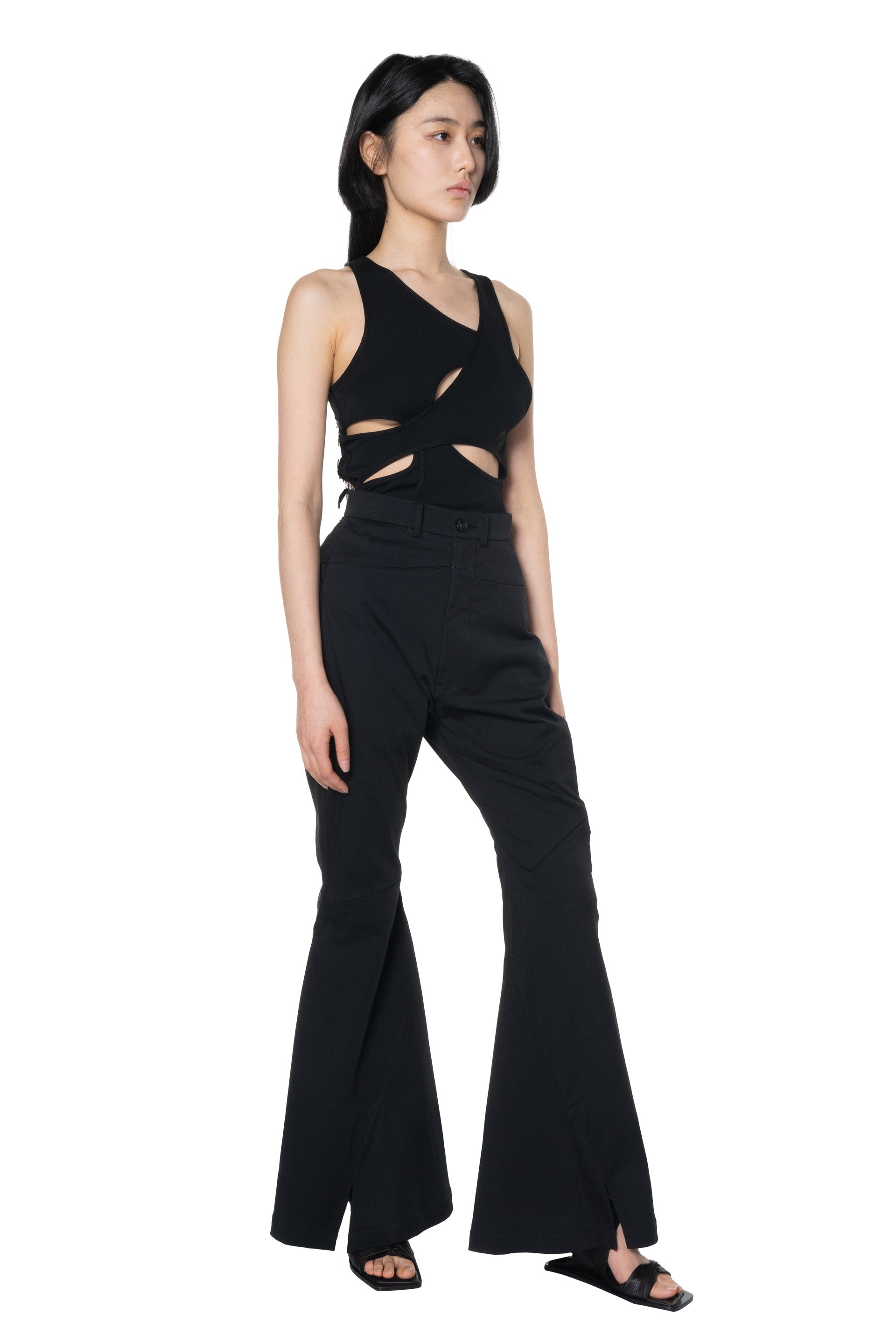Yehuafan believes in feminine beauty with his own way to explain the smooth curve to compliment women’s body. He specialised in asymmetrical cutting and deconstructed silhouette as seen with the Black Flared Trousers.