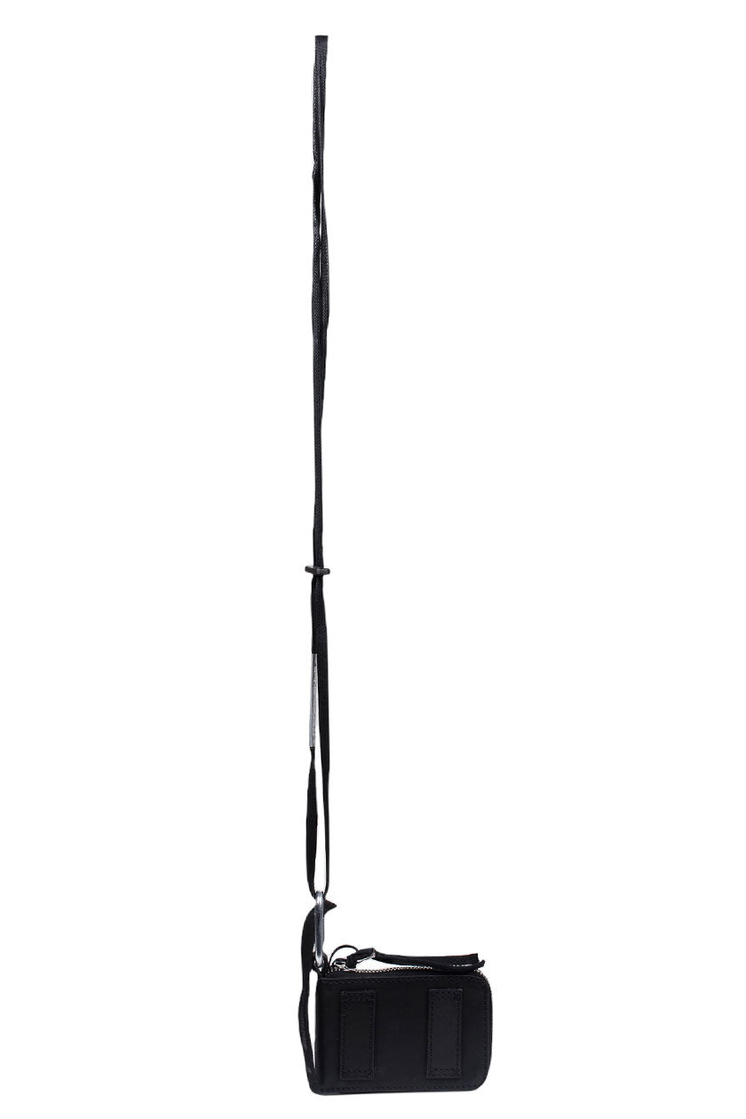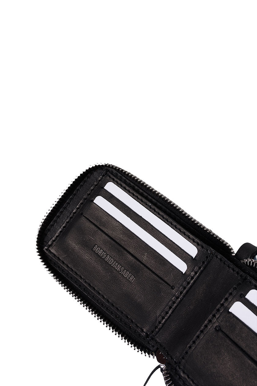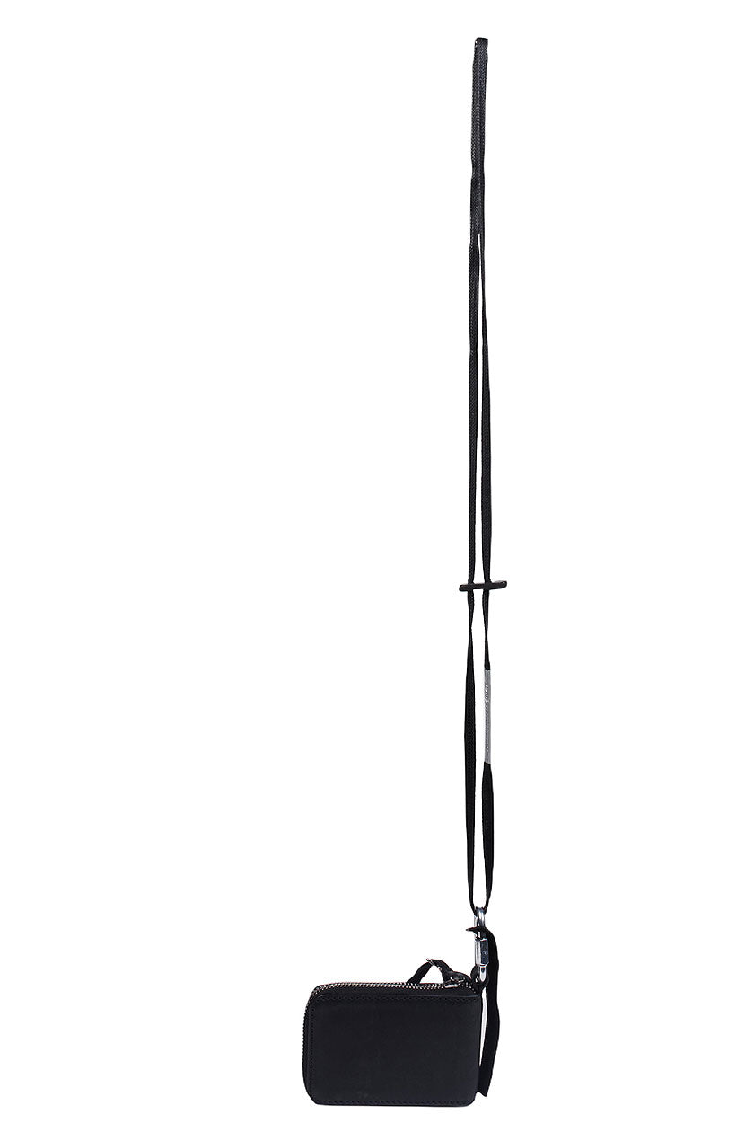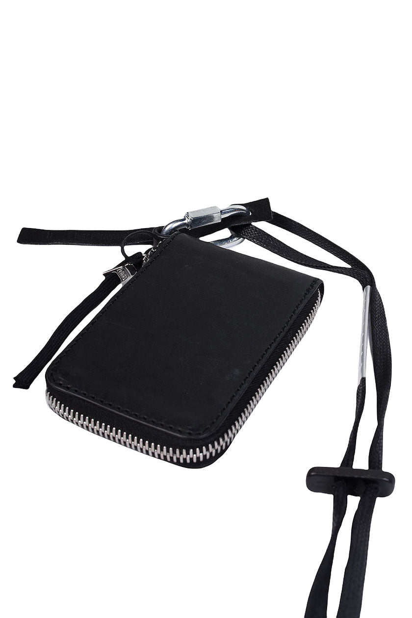 Black Leather Zip-Around Wallet Buffed leather wallet in black. Logo hardware at detachable tonal woven shoulder strap with carabiner fastening. Leather belt loops at back face. Zip closure. Note slot, two patch pockets, and eight card slots at interior. Tonal canvas lining. Silver-tone hardware.