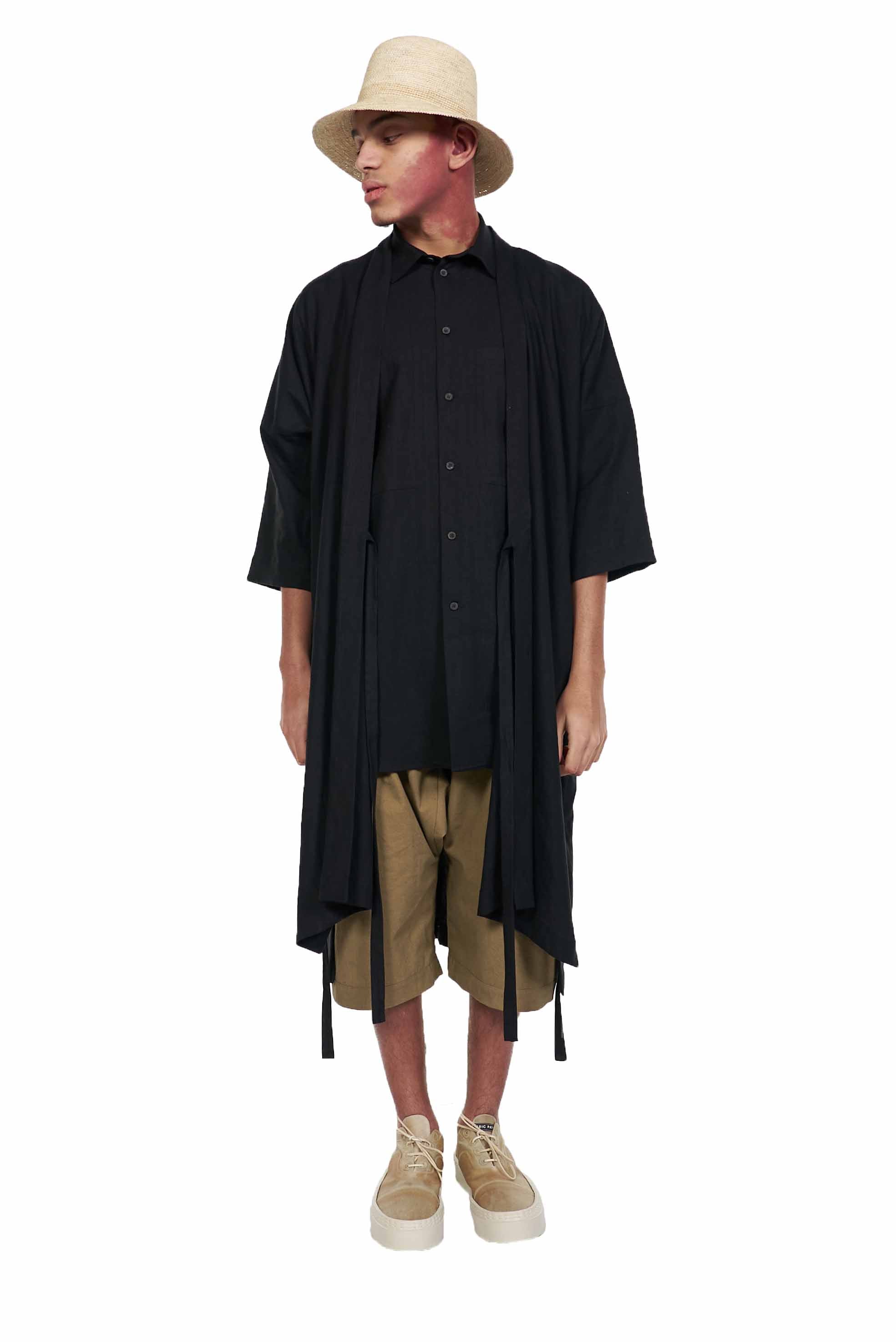 Half-sleeve linen and paper-blend broadcloth robe in black. Integrated self-tie closure at front. Shawl collar. Welt pockets at waist. Unlined.