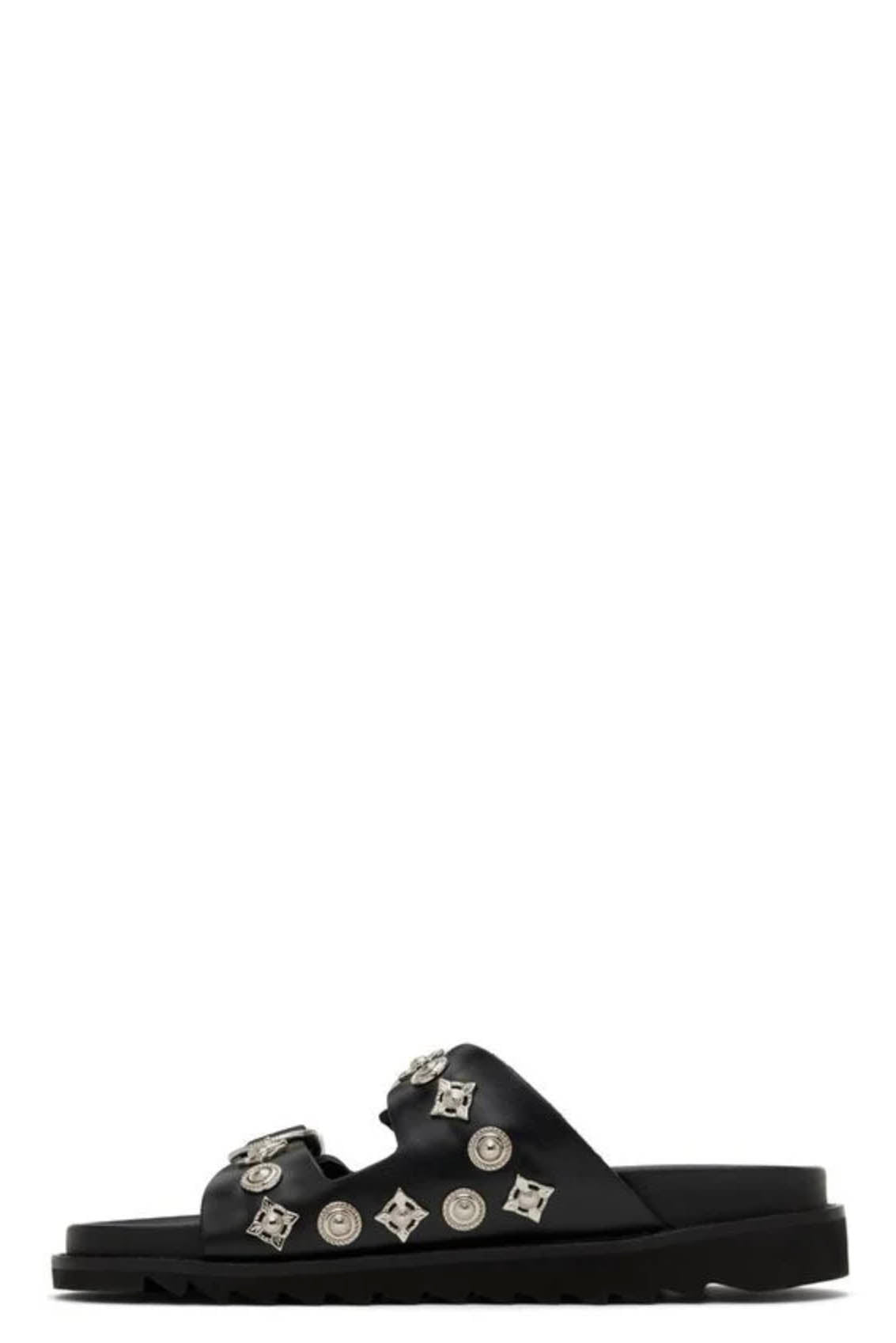Toga Black Leather Buckle Sandals. Signature hardware throughout. Open toe. Pin-buckle straps at vamp. Logo stamp at moulded leather foot bed. Buffed leather lining. Lugged EVA foam rubber sole. Silver-tone hardware.