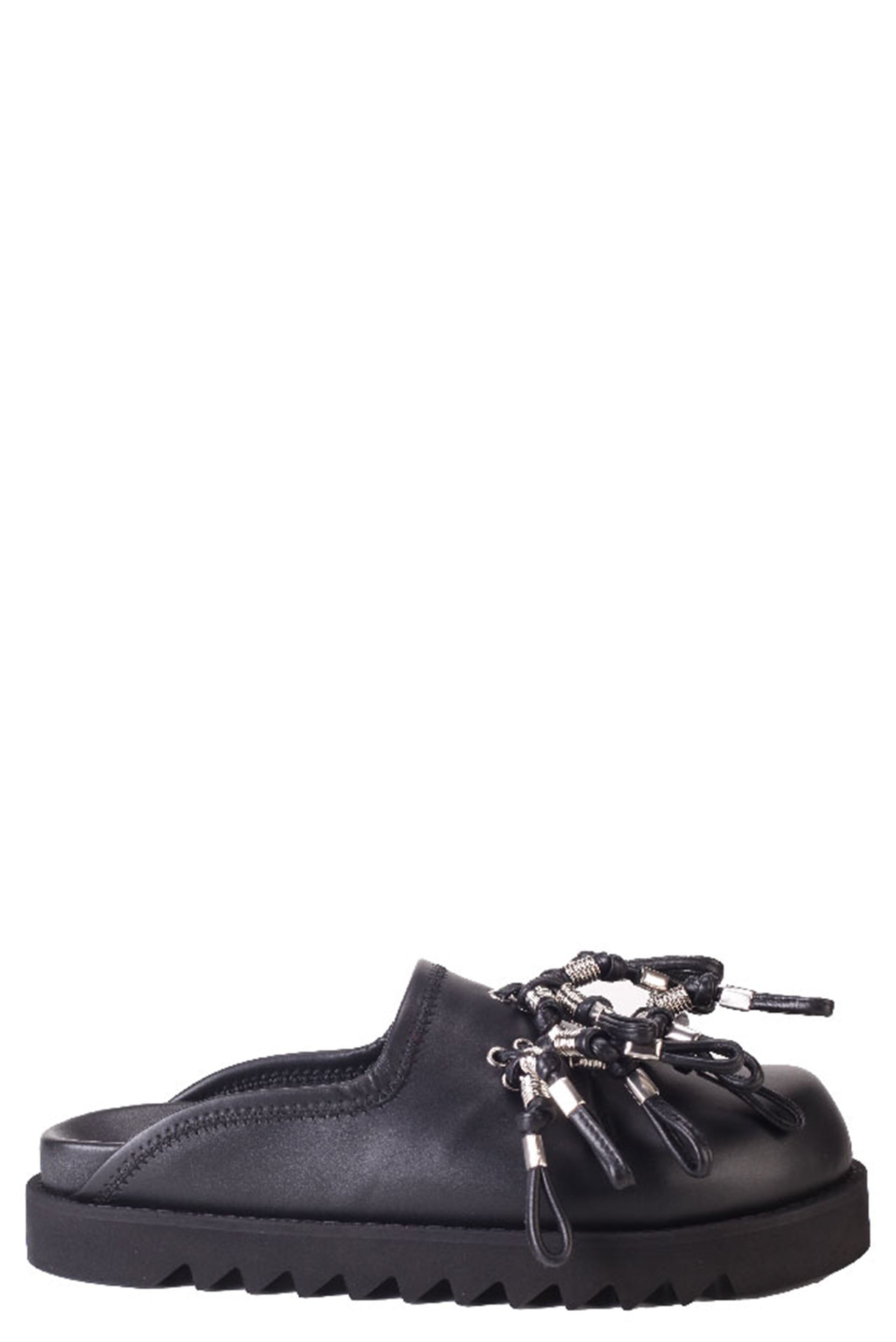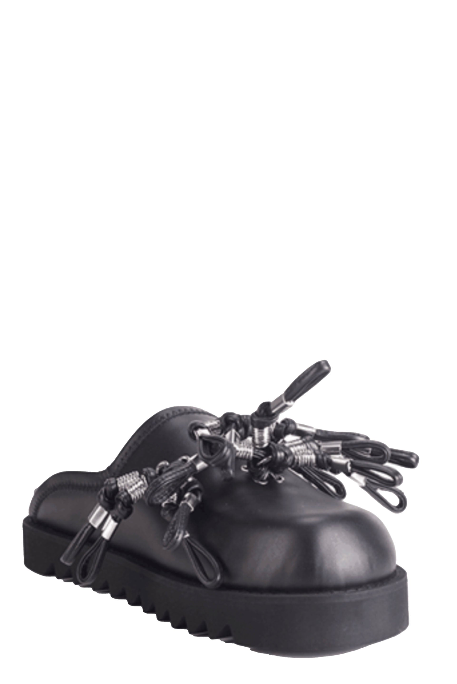 Toga Virilis Black leather sabot. Black finish. Flat rubber sole. Branded foot bed. Metal eyelet detailing. Charm detail throughout.