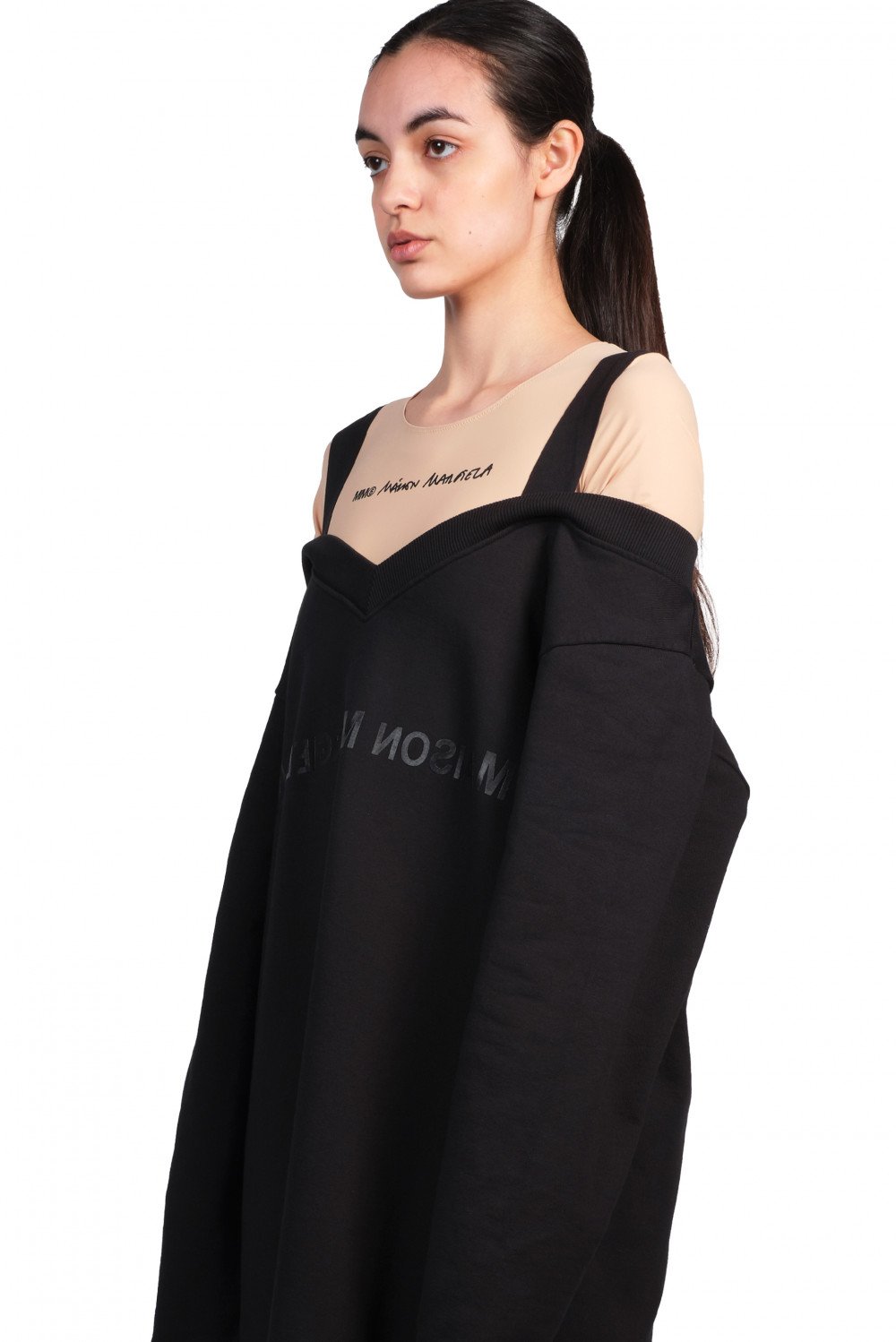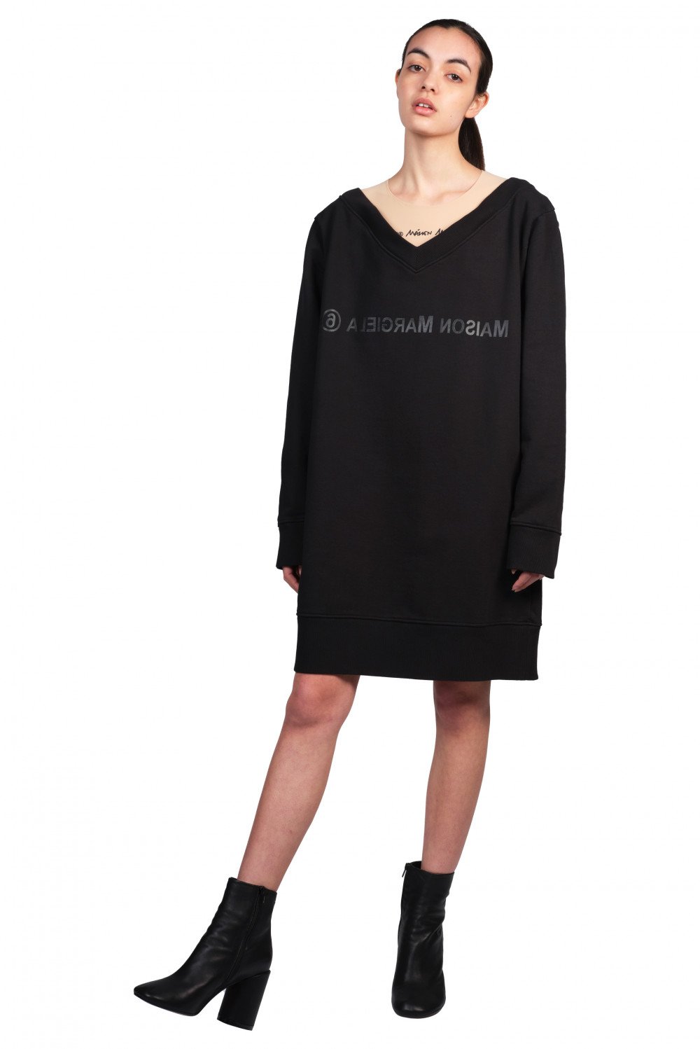 MM6 is known for its sporty ready-to-wear and off-beat accessories, more casual, street-inspired take on the Maison's intellectual approach to luxury as seen in the MM6 Black Logo Sweatshirt Dress.