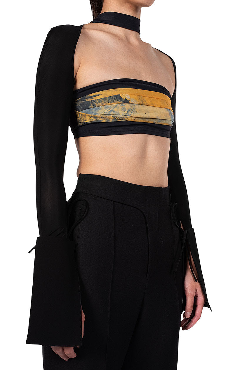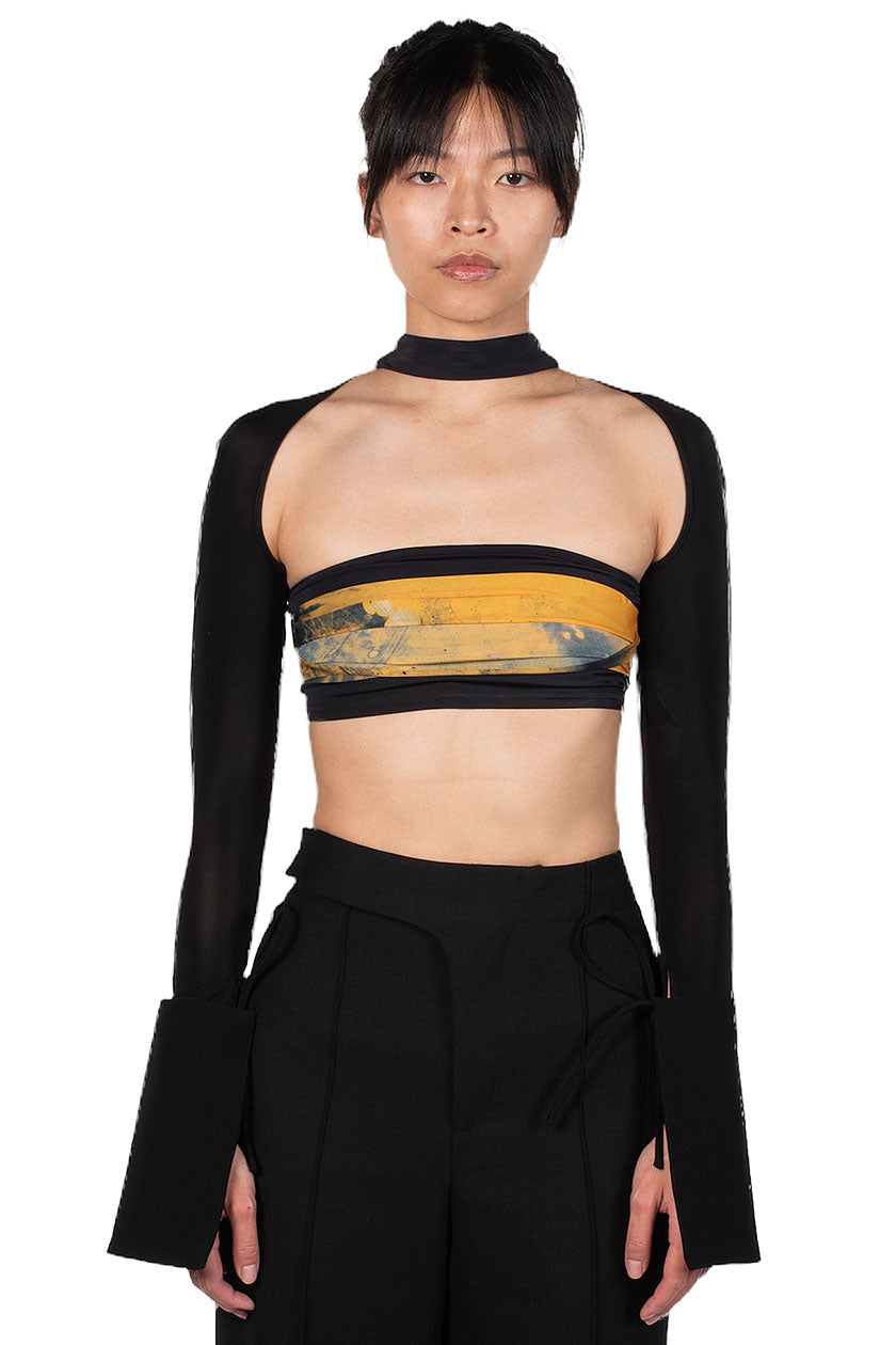 OUDE WAAG strikes a balance between Asian aesthetics and Western cutting. It is at the heart of designer’s philosophy: celebrating the power of women, yet simultaneously critiquing the ongoing objectification and idealisation of the body as you can see with the Black Mesh Oversleeves.