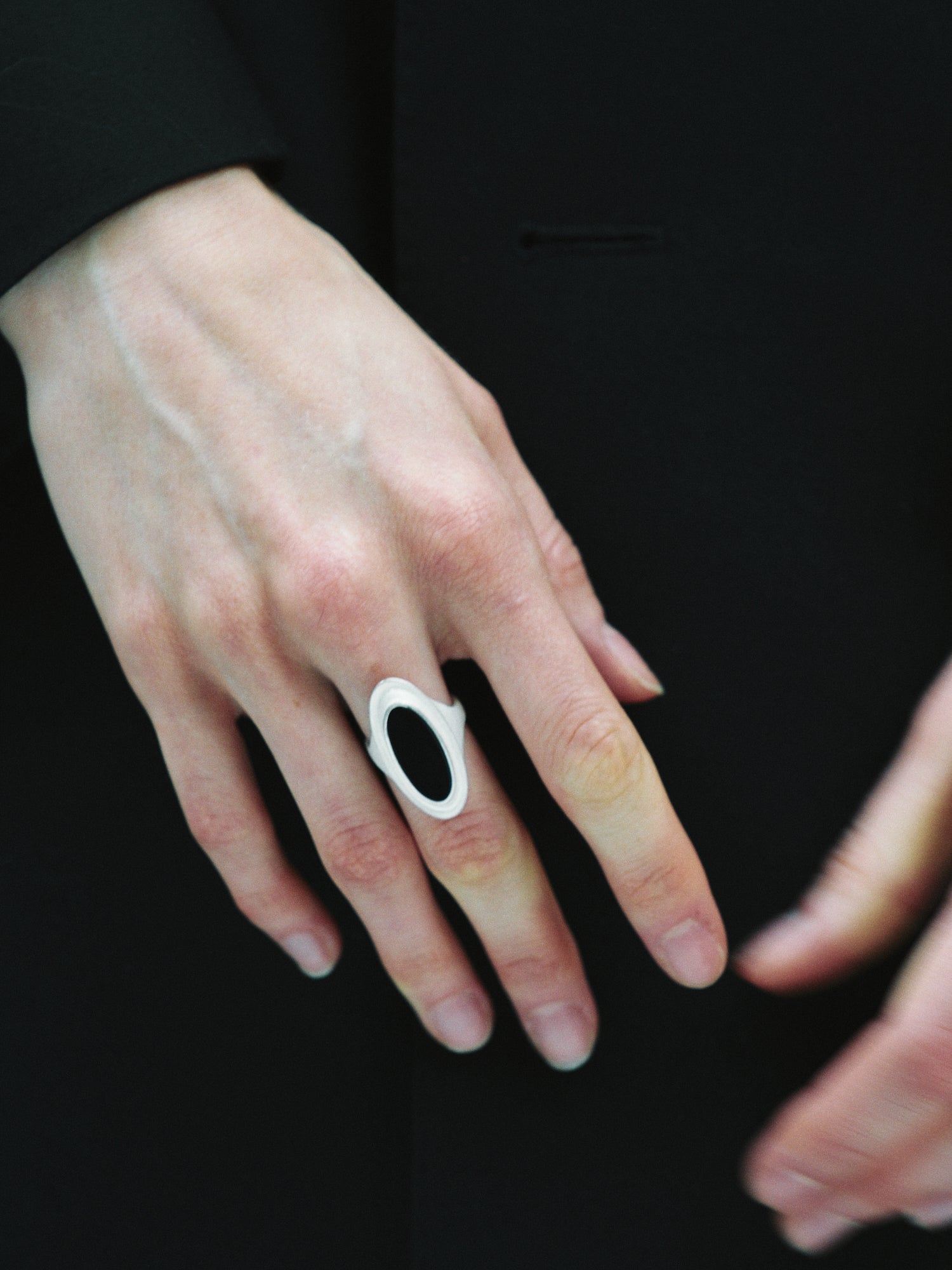OLIO E ACETO is raw and authentic. It is about the companionship between people, and objects like the matte white surface becoming a blank canvas to be filled by the wearer as seen with the Black Mirror Lake Ring.
