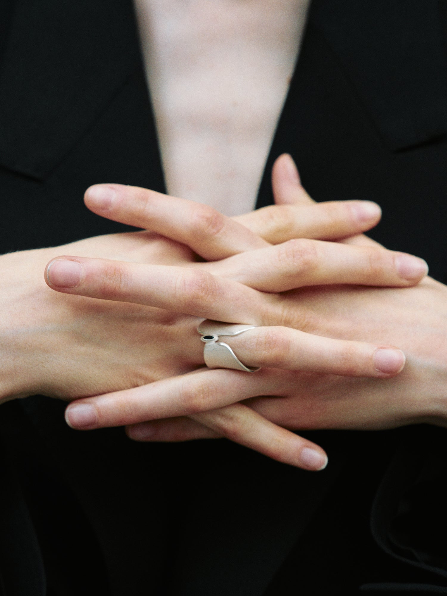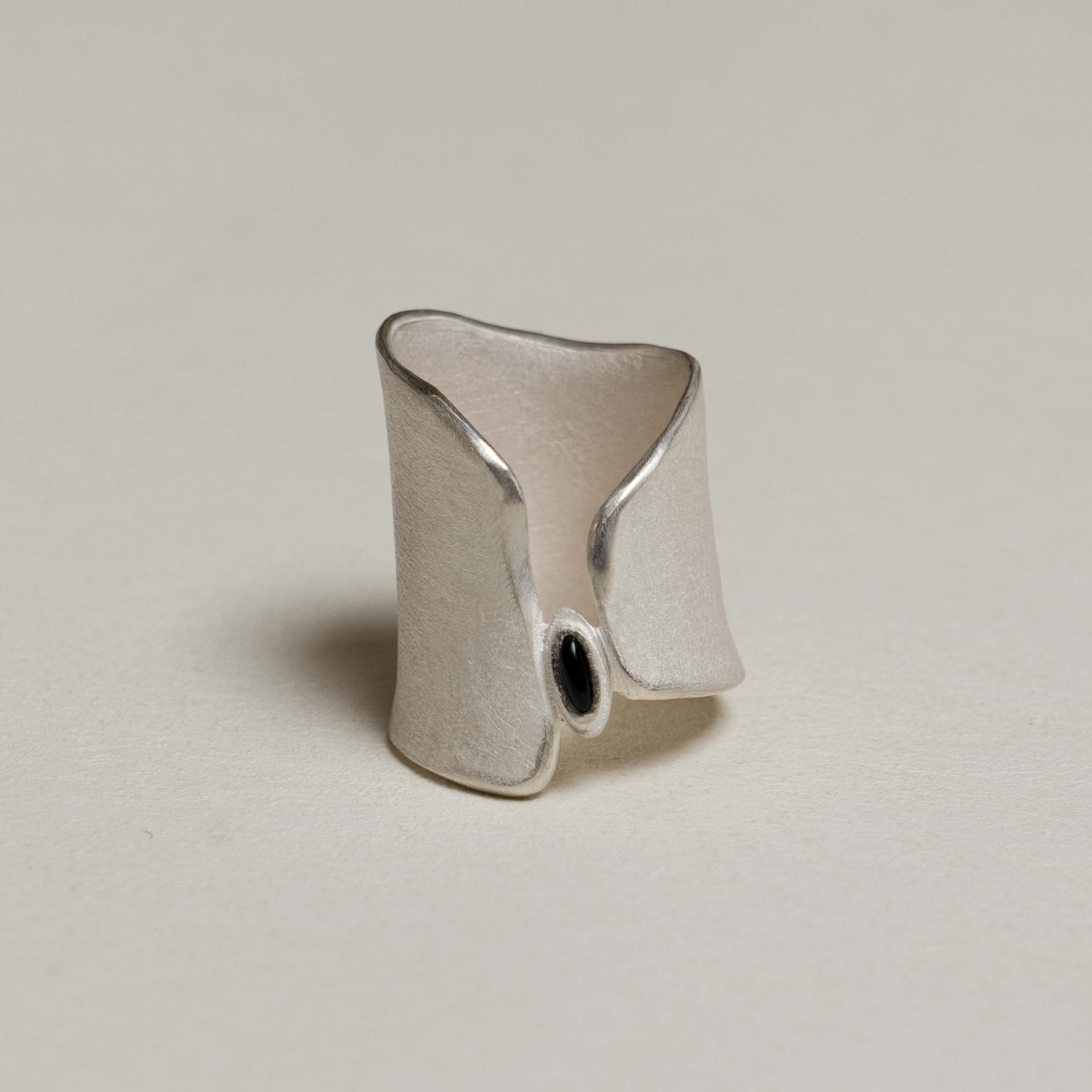 OLIO E ACETO is raw and authentic. It is about the companionship between people, and objects like the matte white surface becoming a blank canvas to be filled by the wearer as seen with the Black Onyx Collar Ring.
