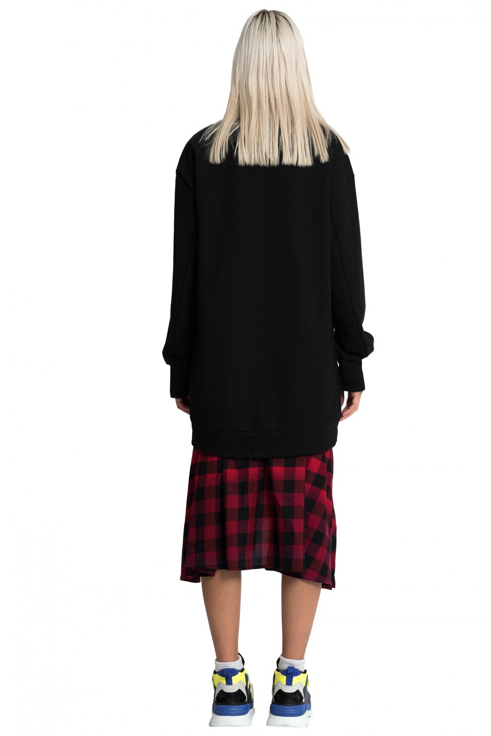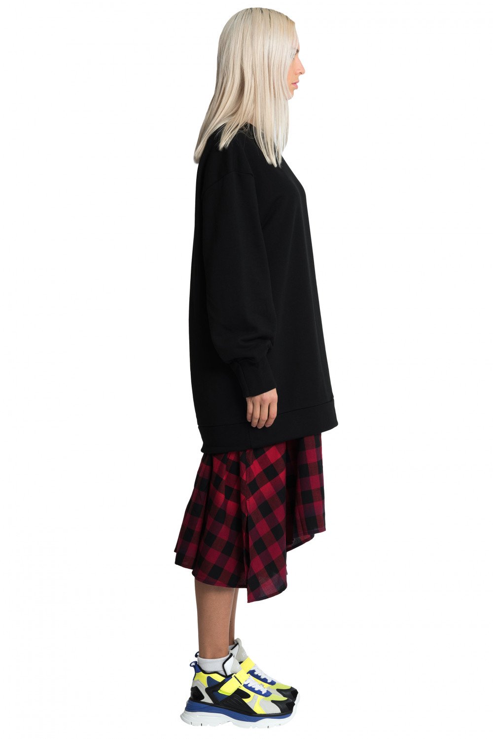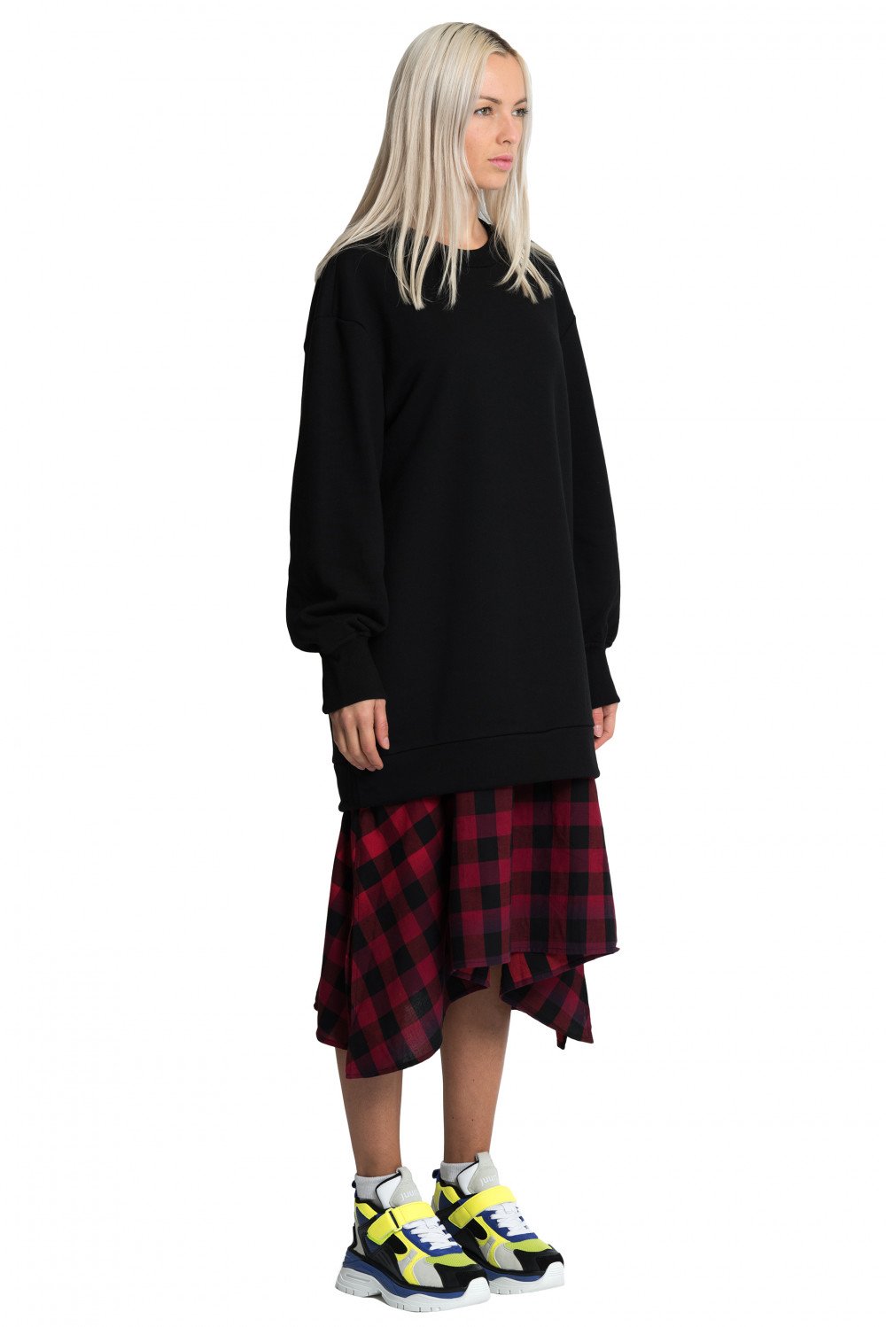 ‘Fantasy and reality are lapped over each other’ are the words behind the AW18 collection from Juun. J. The collection plays with fabric layering, embroidery and printing as seen in the Black Oversized Layered Sweatshirt Dress.