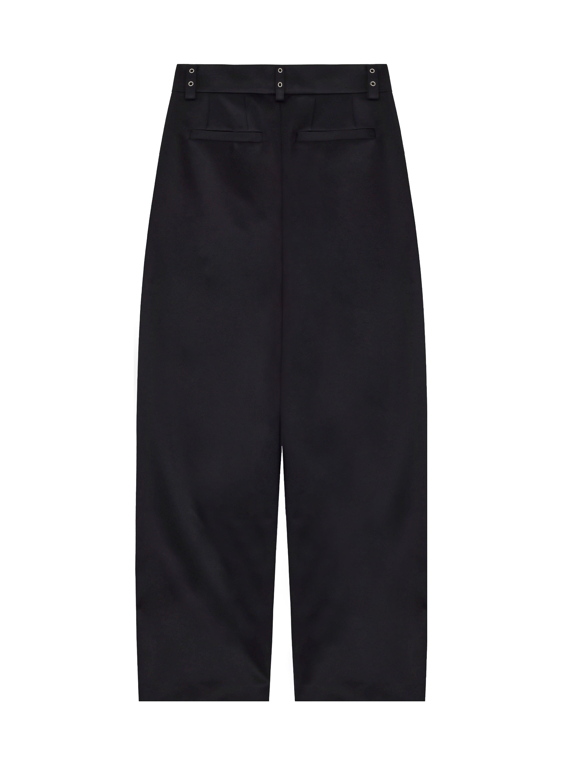 High waist. Button closure at waist. Two side pockets. Wide leg.